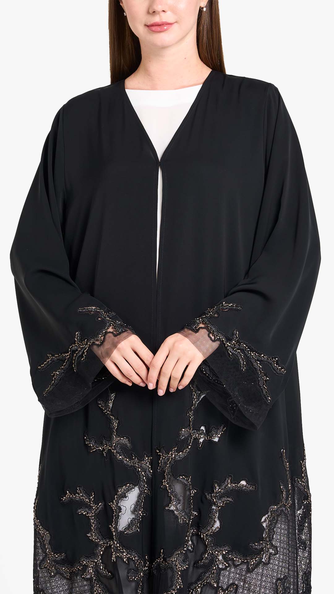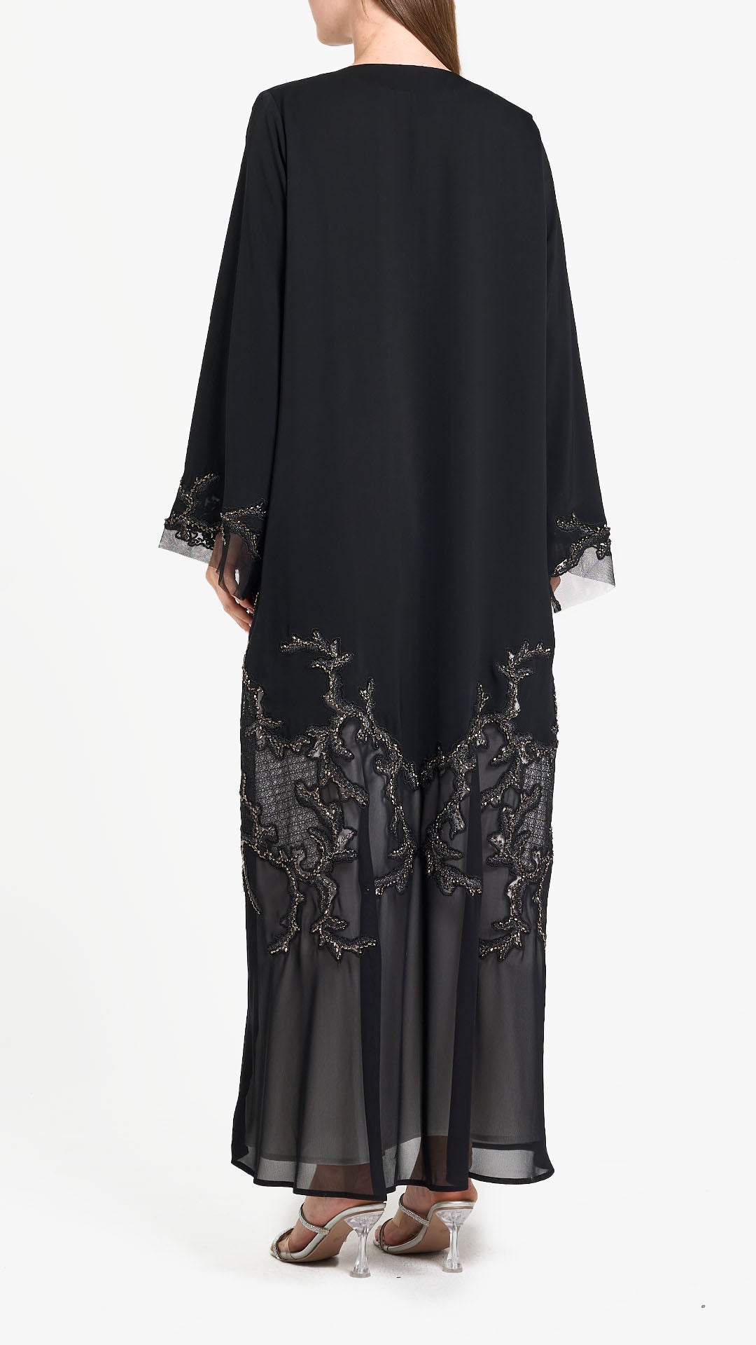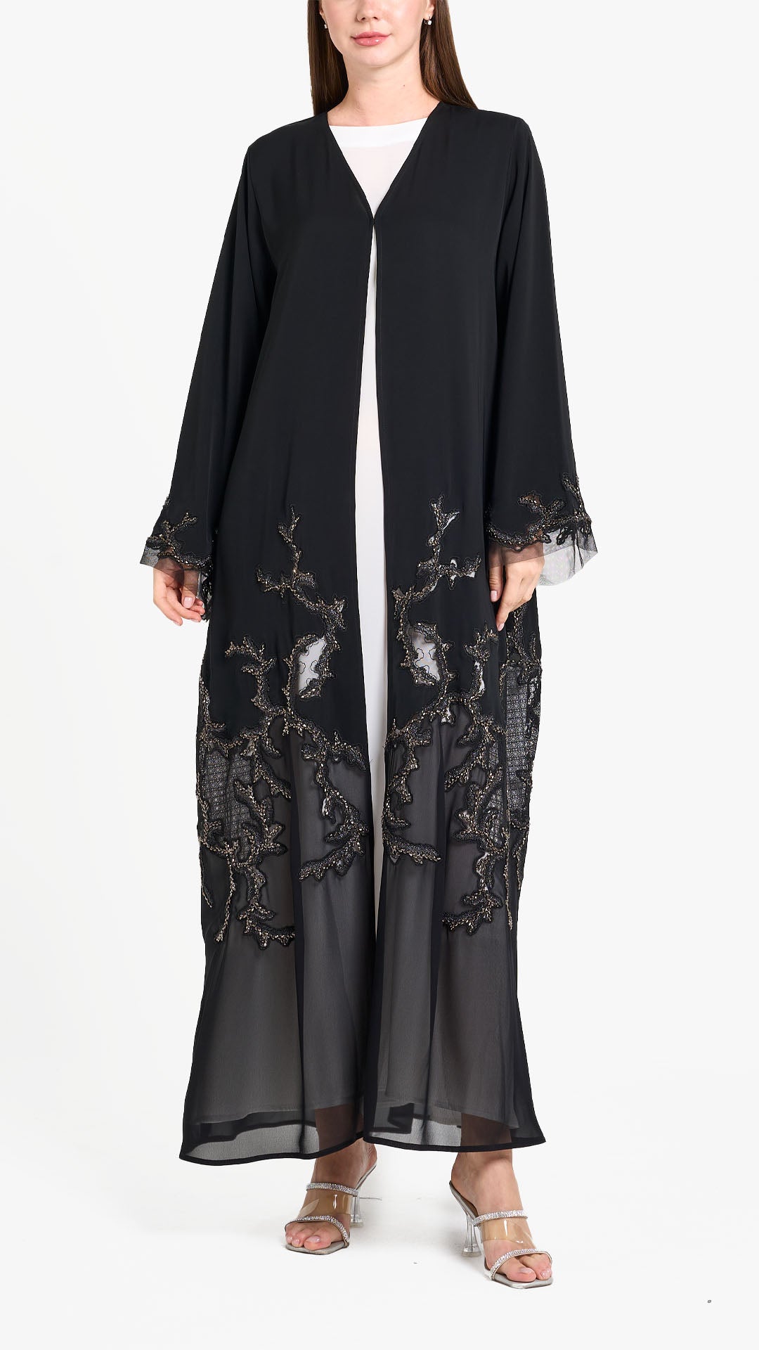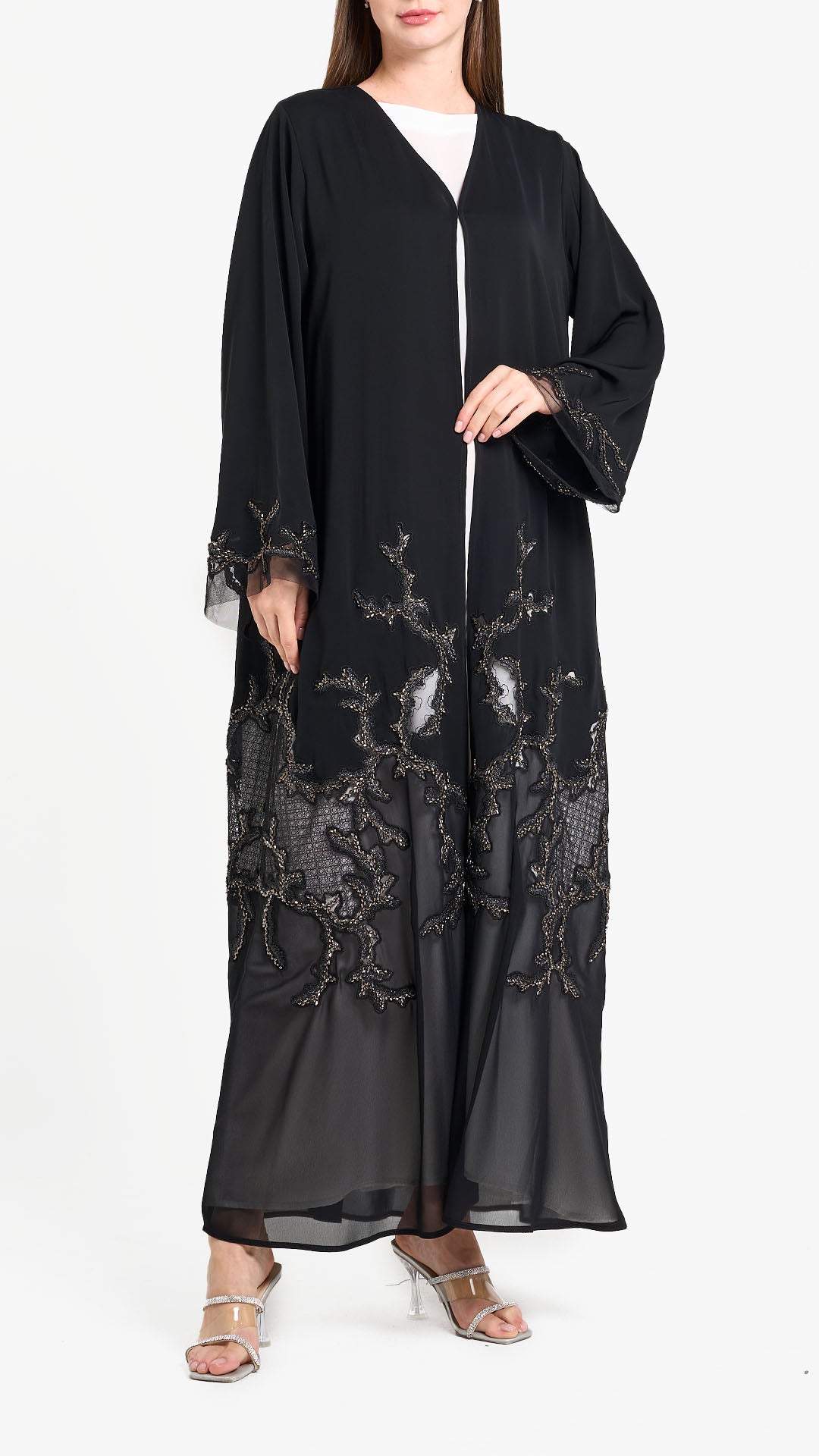 black abaya with modern texture grey color computer embroidery highlighting with crystal hand work detailing