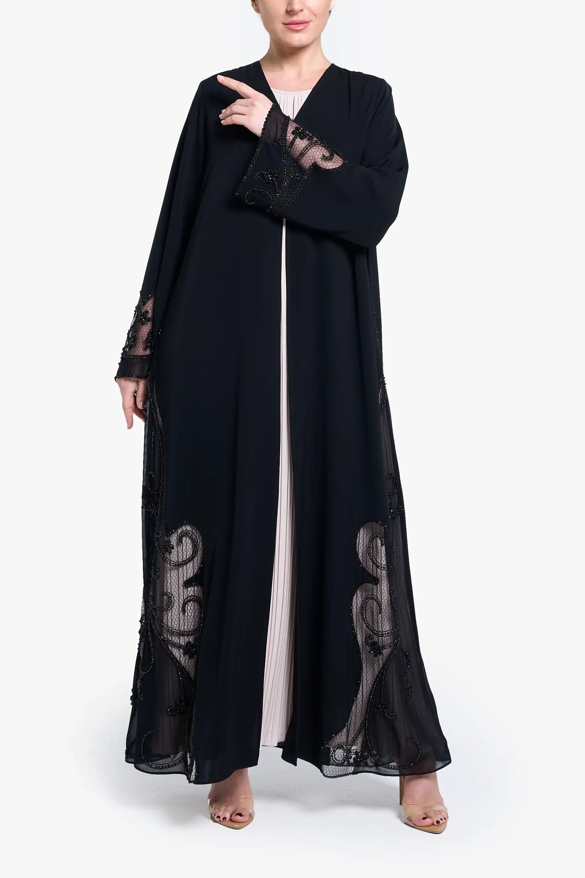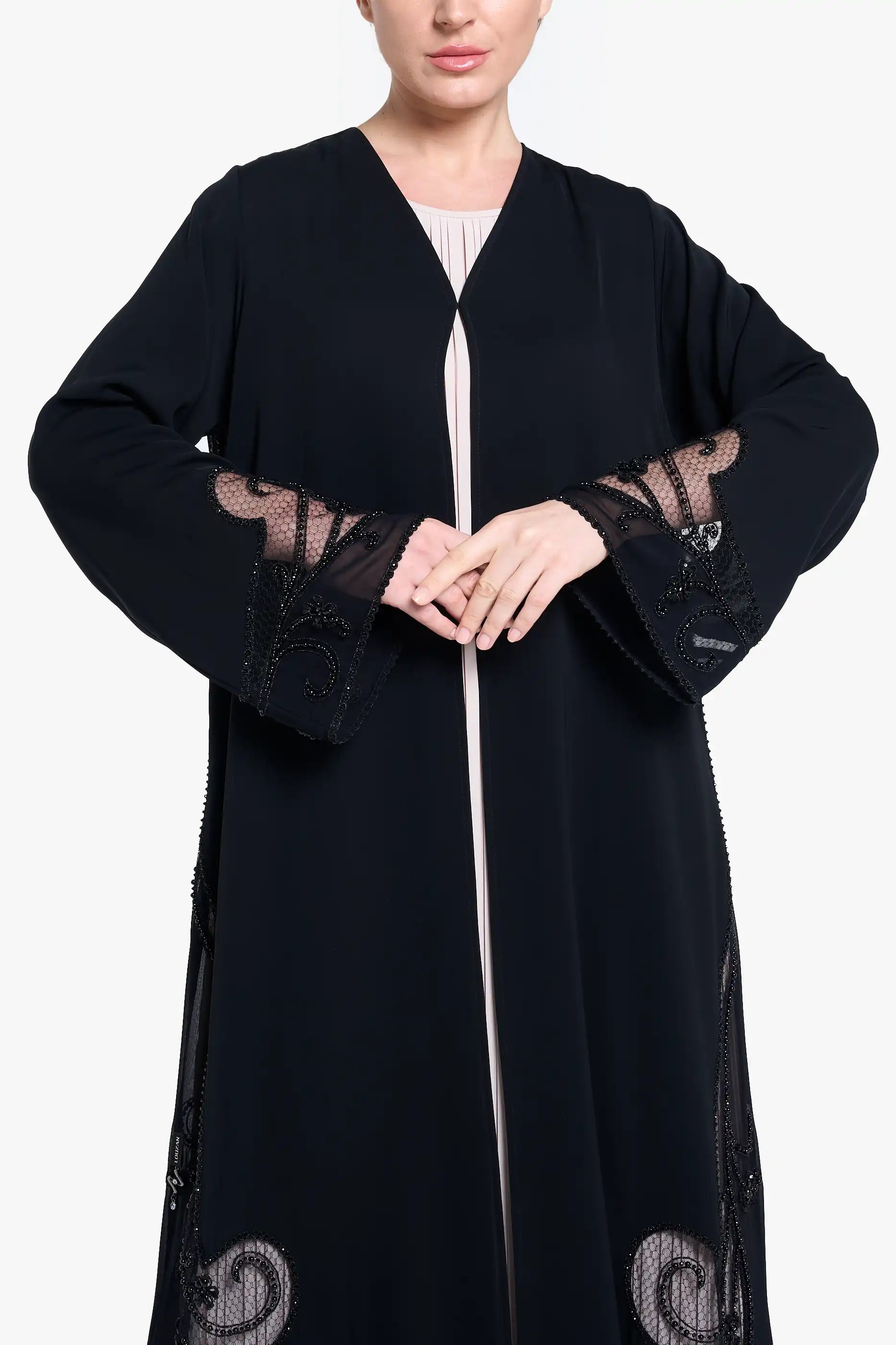 Elevate your modest fashion with our Black Abaya LN2192, featuring exquisite aari embroidery and dazzling crystal embellishments. This elegant piece combines traditional craftsmanship with contemporary design, creating a sophisticated silhouette that transitions effortlessly from daily wear to special occasions. The premium fabric ensures comfort while the detailed handwork adds a touch of luxury to your wardrobe.