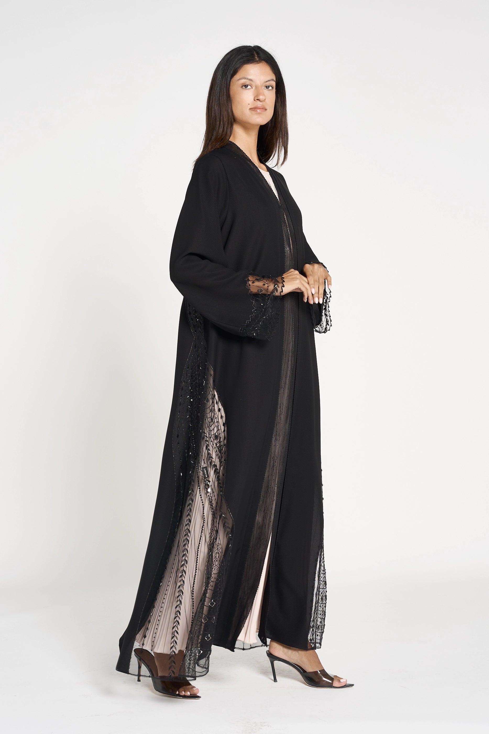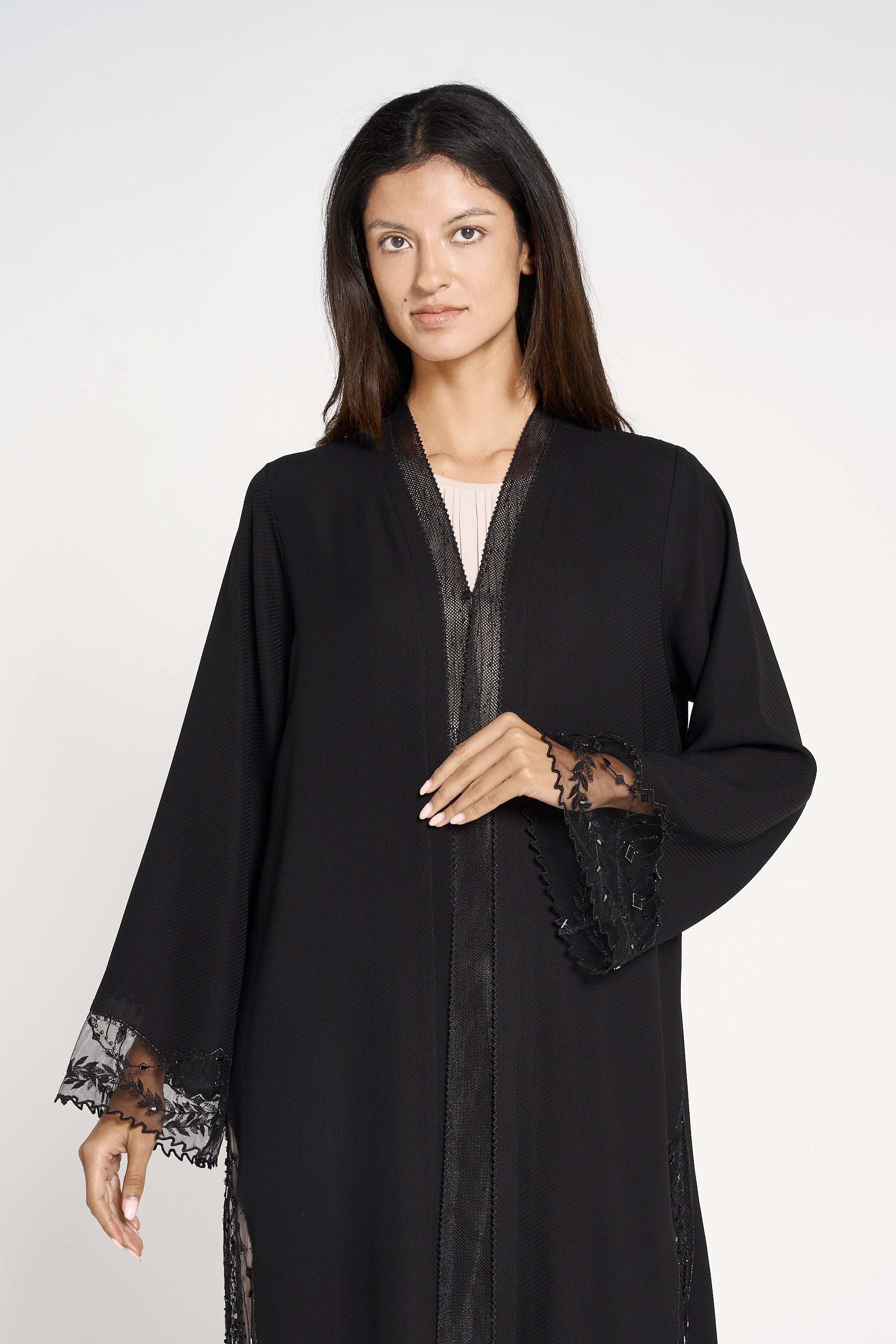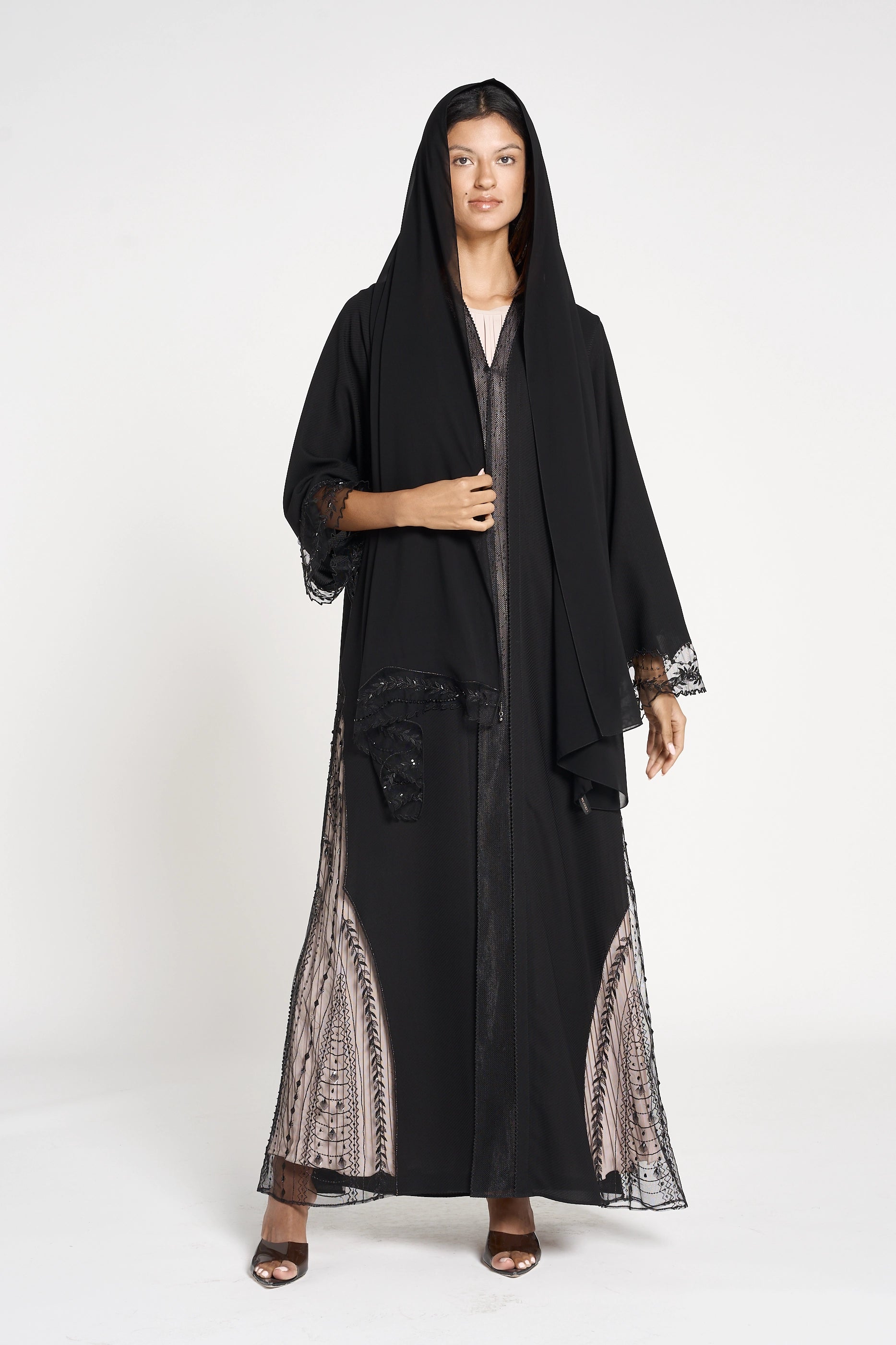 Elevate your modest fashion collection with this striking black abaya, meticulously crafted with sophisticated geometric embroidery in black and silver tones. The design features intricate computer-precision detailing that creates dimensional depth, complemented by luxurious 3D crystal embellishments that catch light beautifully. Each element is thoughtfully positioned to enhance the silhouette while maintaining elegant simplicity. Perfect for special occasions or everyday wear, this abaya combines traditional modesty with contemporary artistry. The combination of embroidery and crystal work demonstrates exceptional craftsmanship, making it a versatile statement piece for the disc