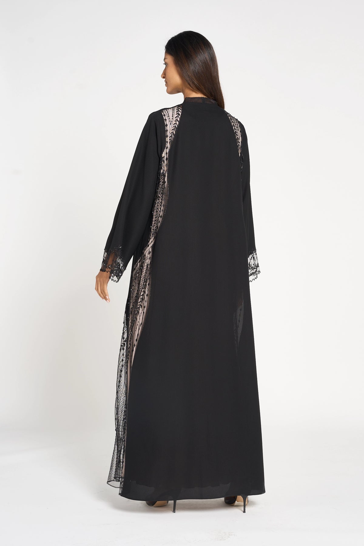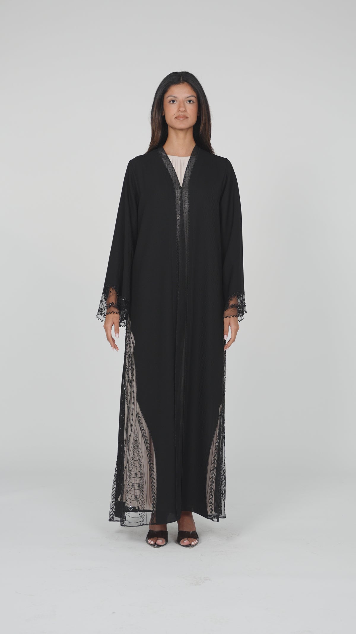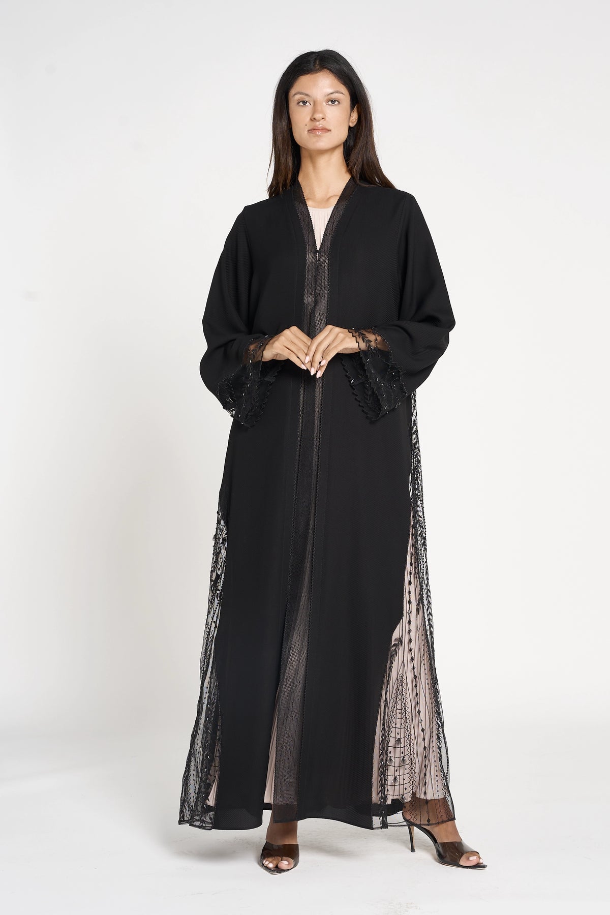 Elevate your modest fashion collection with this striking black abaya, meticulously crafted with sophisticated geometric embroidery in black and silver tones. The design features intricate computer-precision detailing that creates dimensional depth, complemented by luxurious 3D crystal embellishments that catch light beautifully. Each element is thoughtfully positioned to enhance the silhouette while maintaining elegant simplicity. Perfect for special occasions or everyday wear, this abaya combines traditional modesty with contemporary artistry. The combination of embroidery and crystal work demonstrates exceptional craftsmanship, making it a versatile statement piece for the disc
