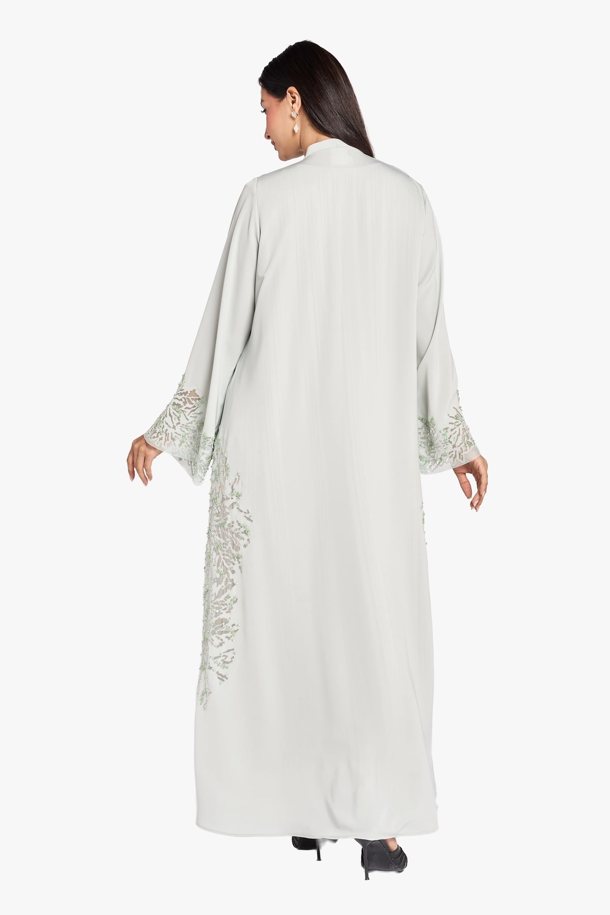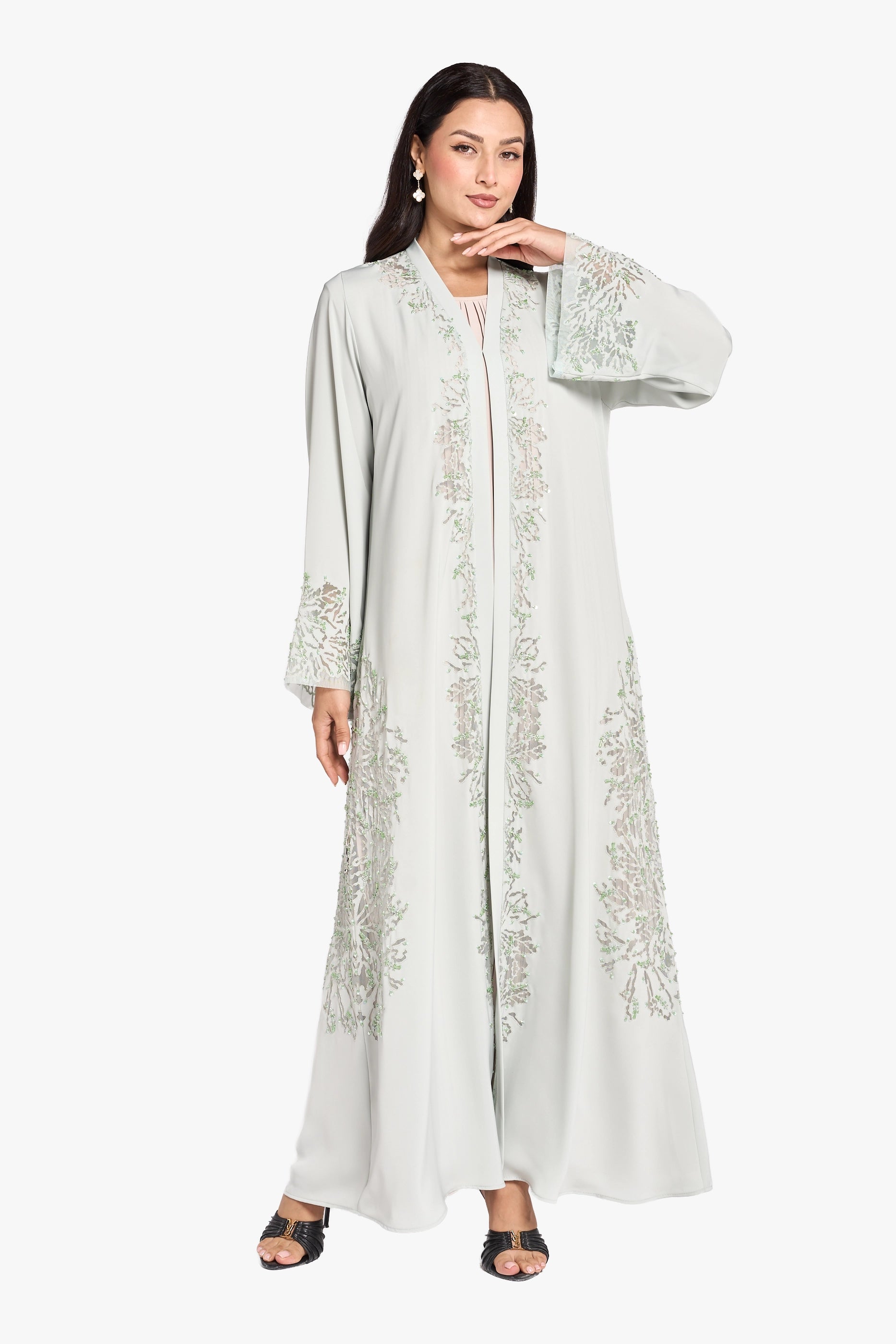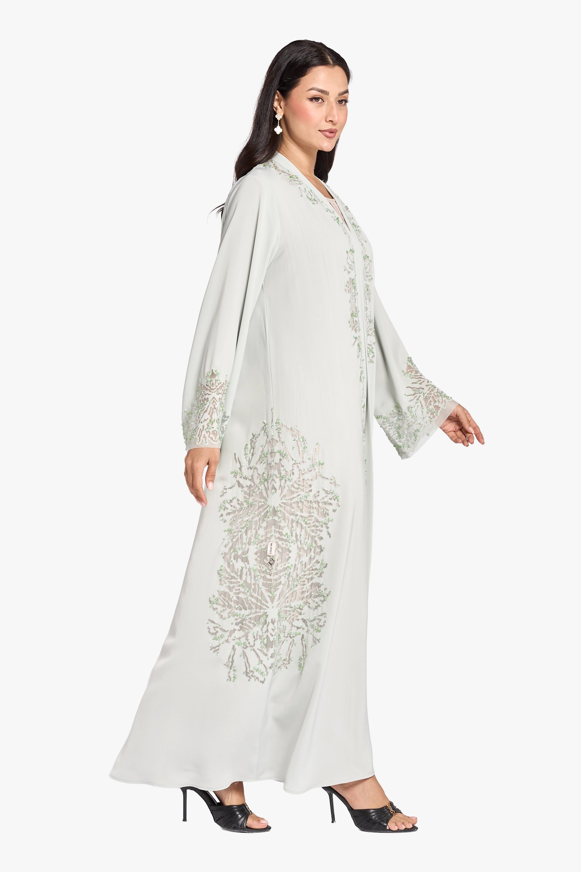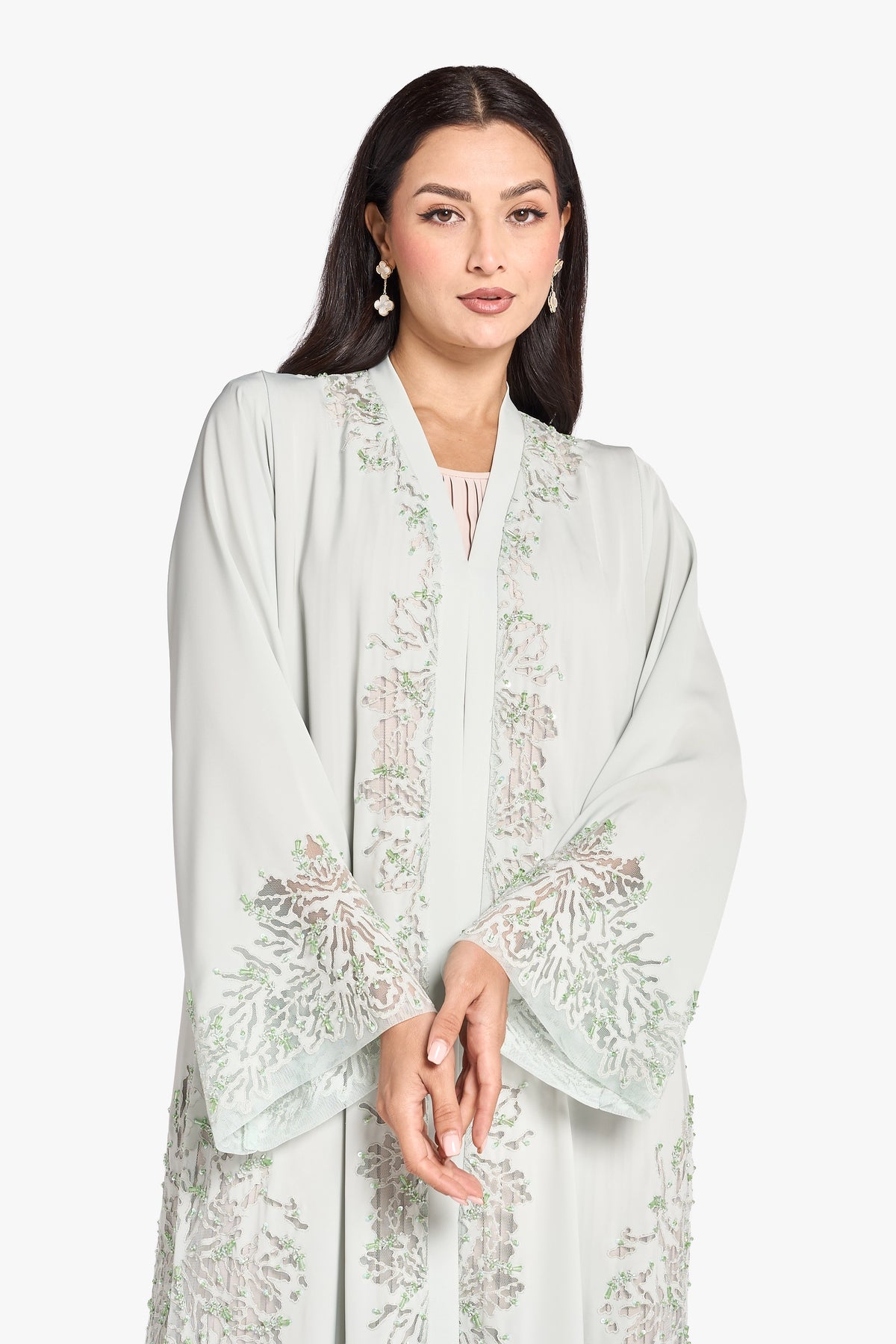 This VIP abaya showcases a contemporary floral texture achieved through precise laser cutting, enriched with exquisite handwork detailing. Designed for those who appreciate refined craftsmanship, it balances modern style with traditional eleganc