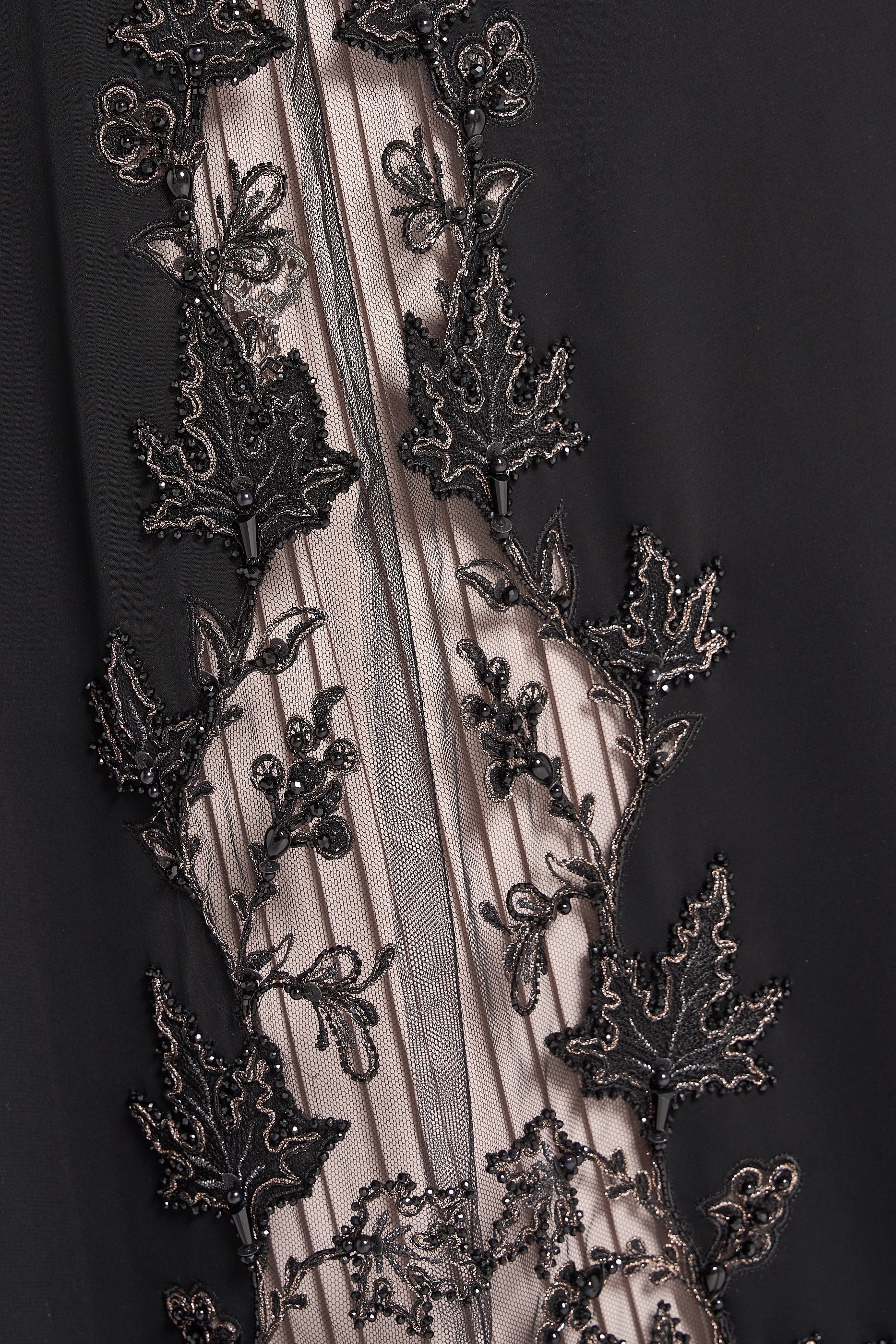 Louzan abaya crafted in nida fabric with floral design dori embroidery in black and gold, with unique placement, highlighted with crystals and beads.