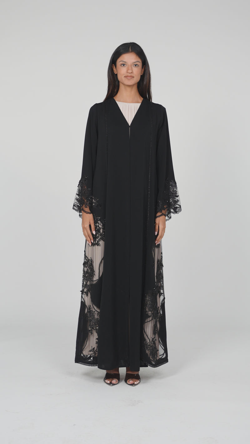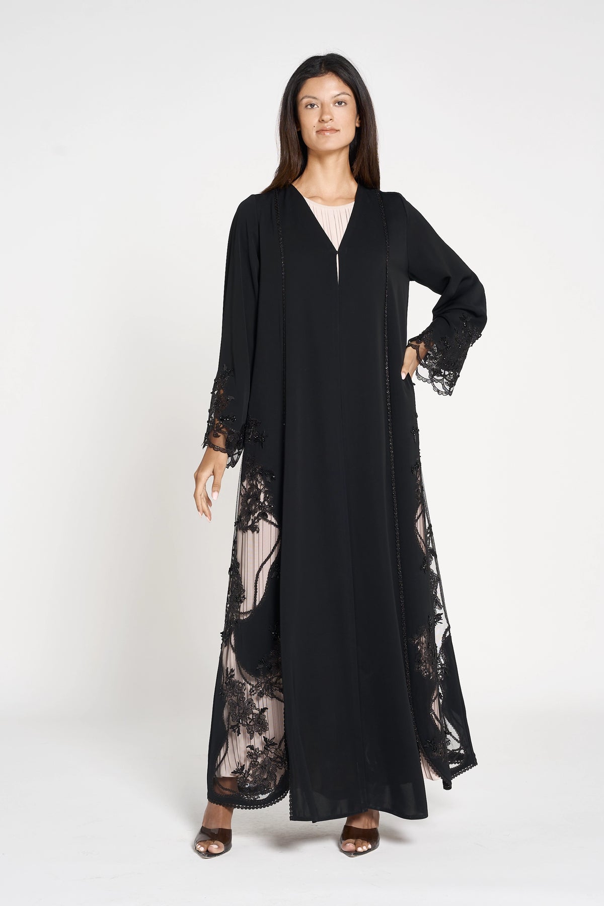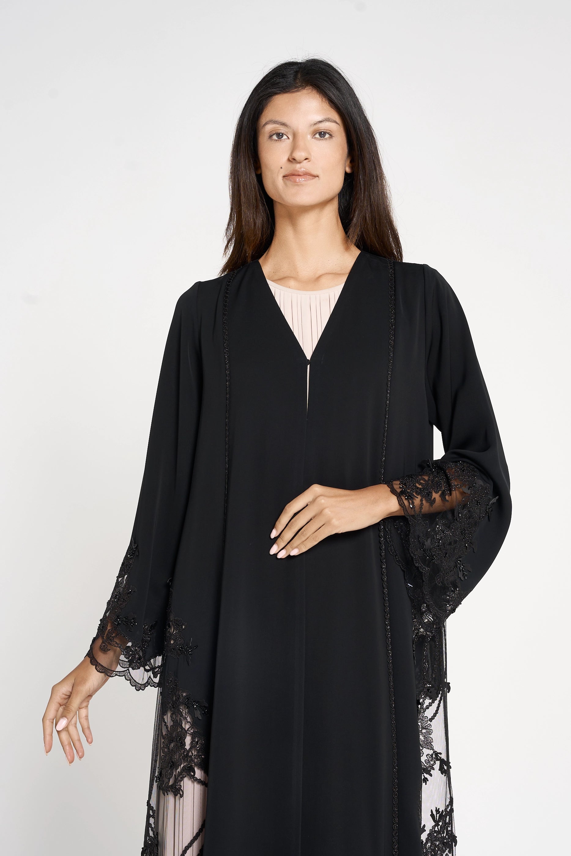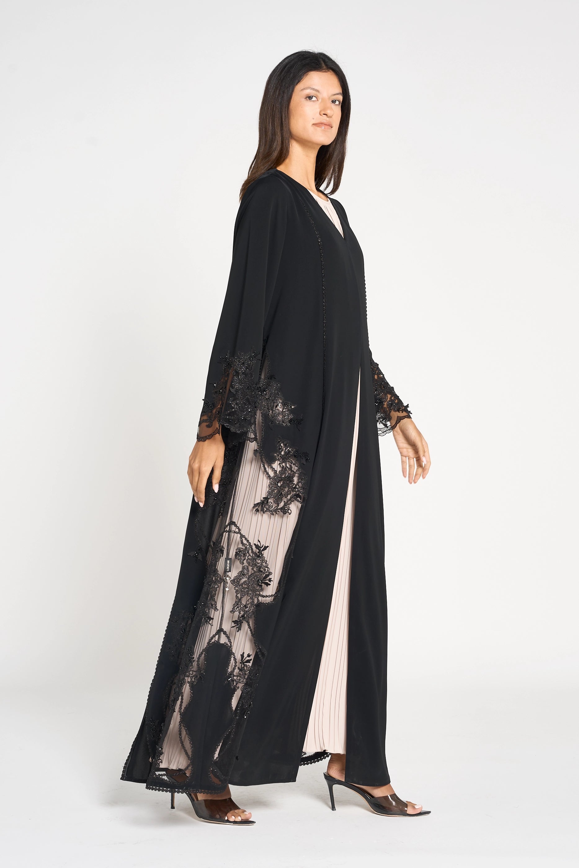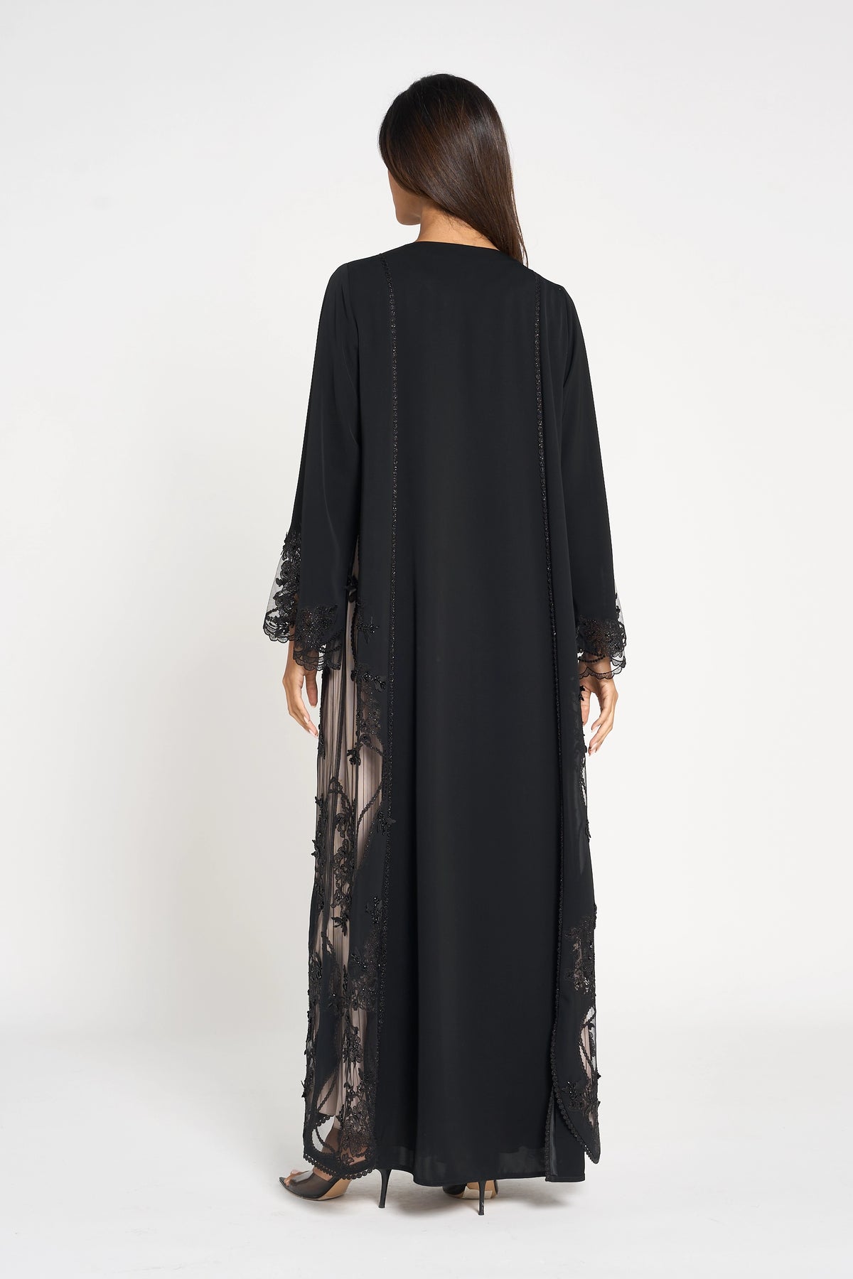 Discover timeless sophistication with this Louzan abaya, meticulously crafted from luxuriously soft nida fabric. The garment showcases an exquisite floral design rendered in traditional dori embroidery, elevated with carefully placed crystals and beads that catch the light with subtle brilliance. Each detail reflects a refined aesthetic that balances modern sensibilities with classic elegance, delivering understated luxury for the discerning wearer. Perfect for those who appreciate craftsmanship and contemporary design.