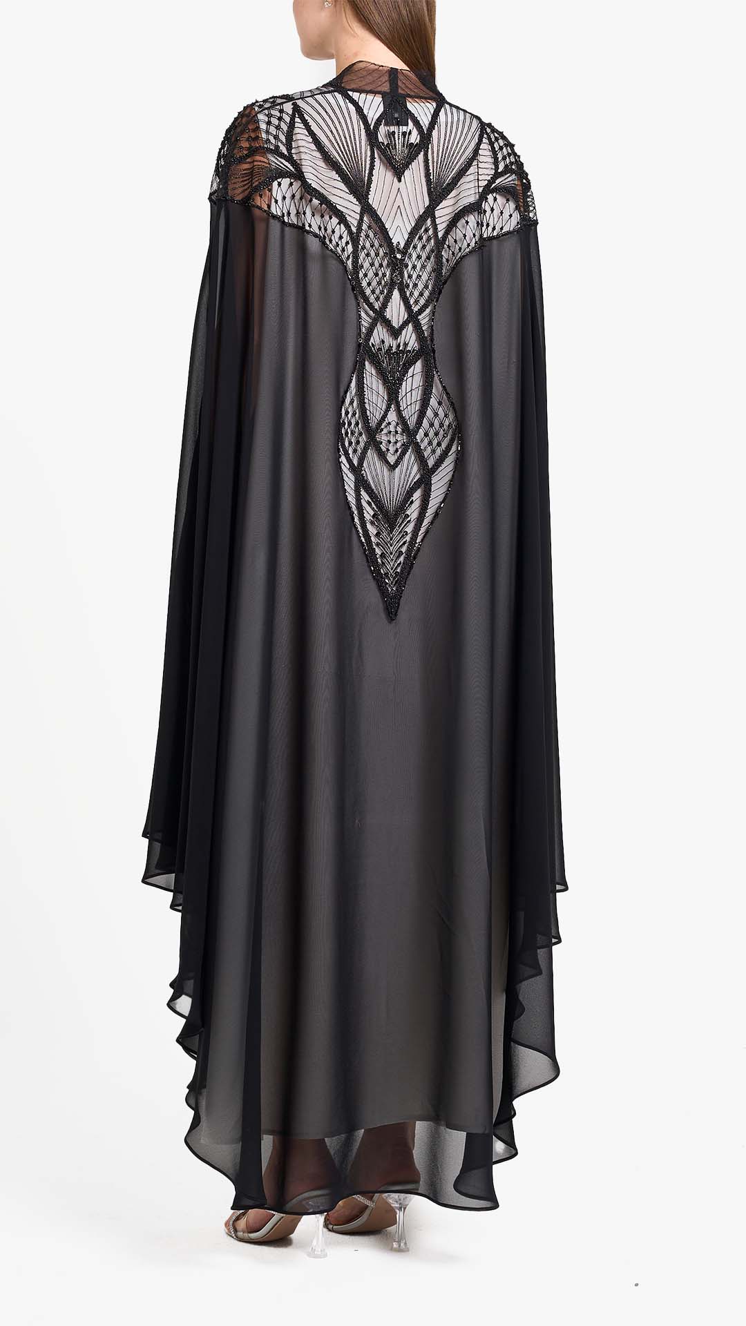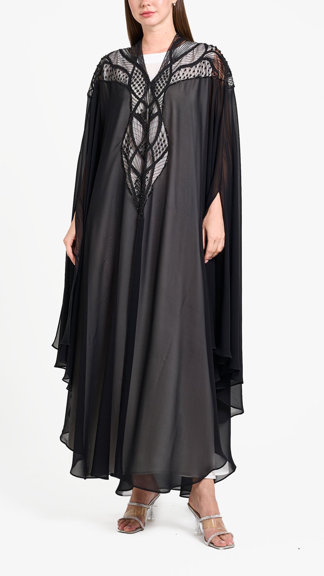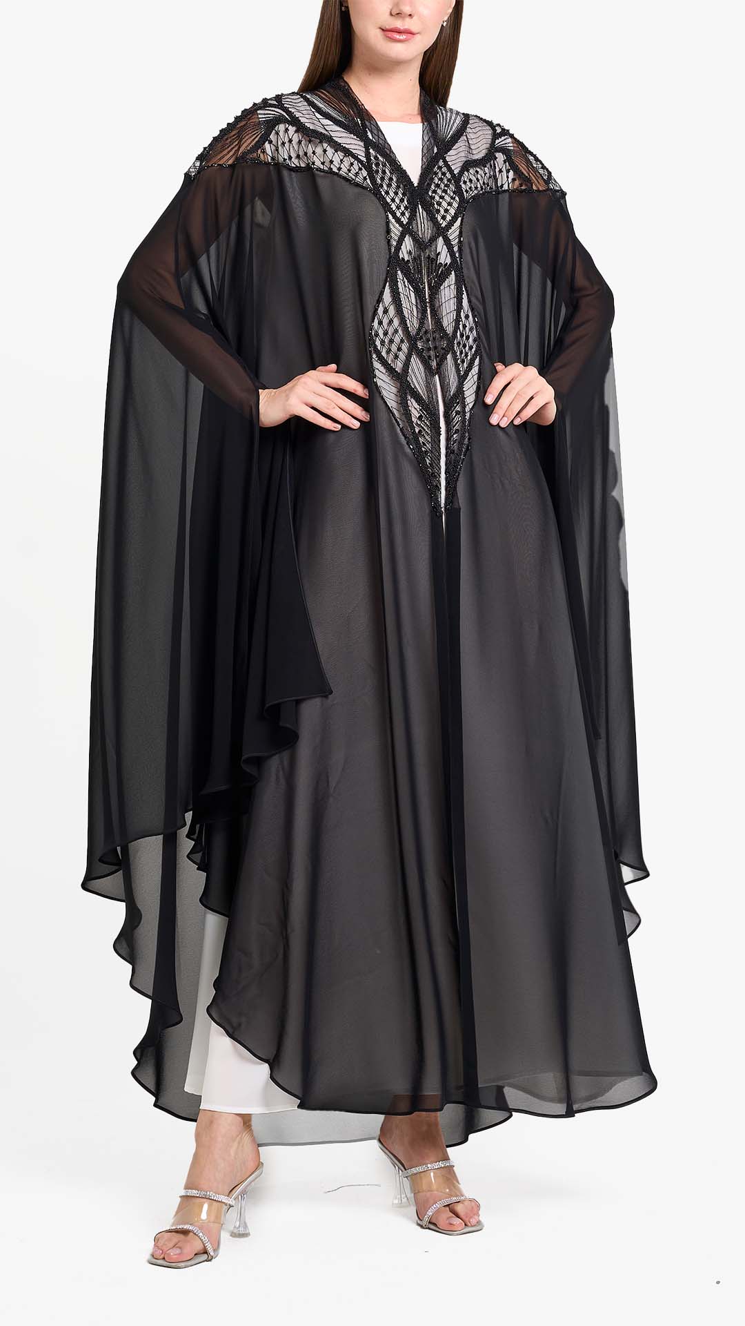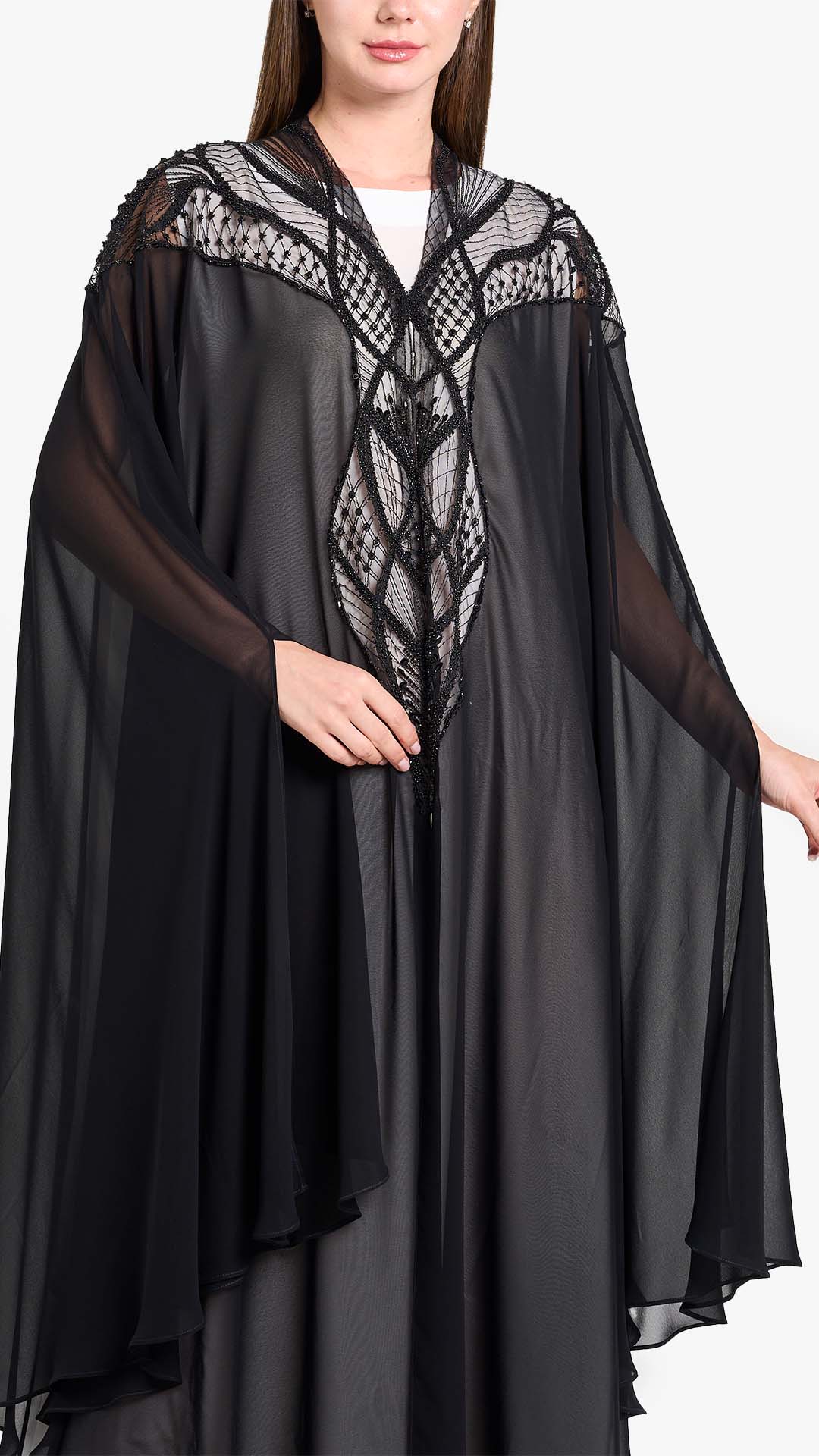 Louzan wedding abaya crafted in chiffon fabric with abstract embroidered panel, embellished with beads and crystals.