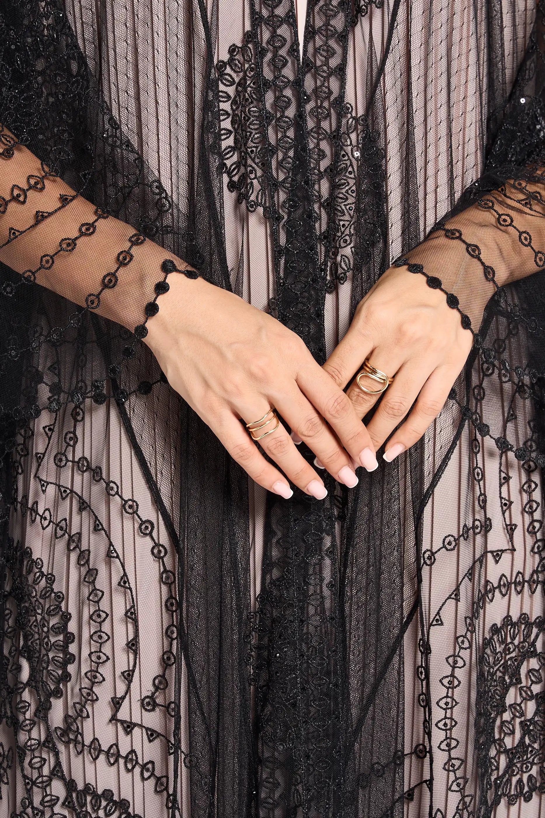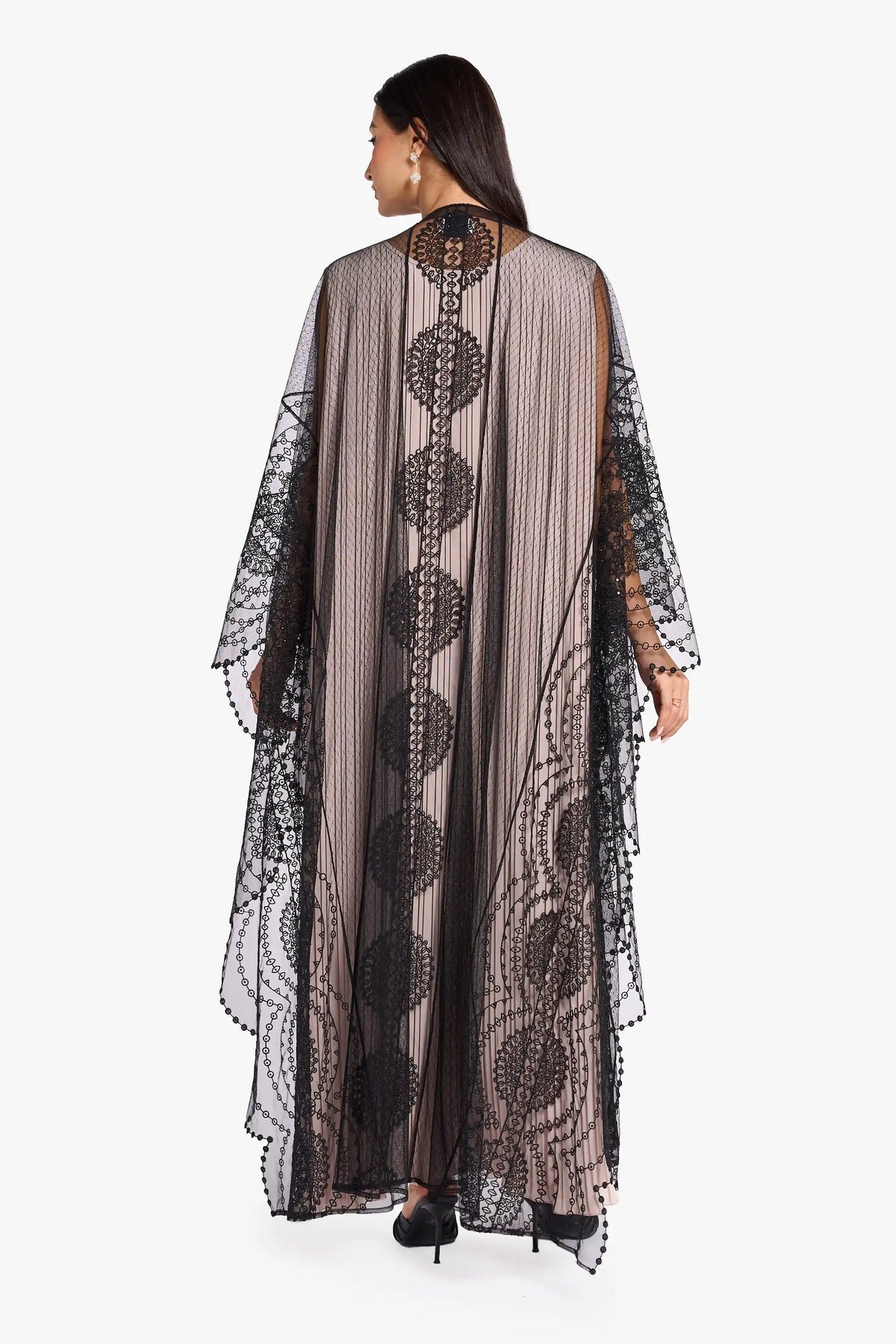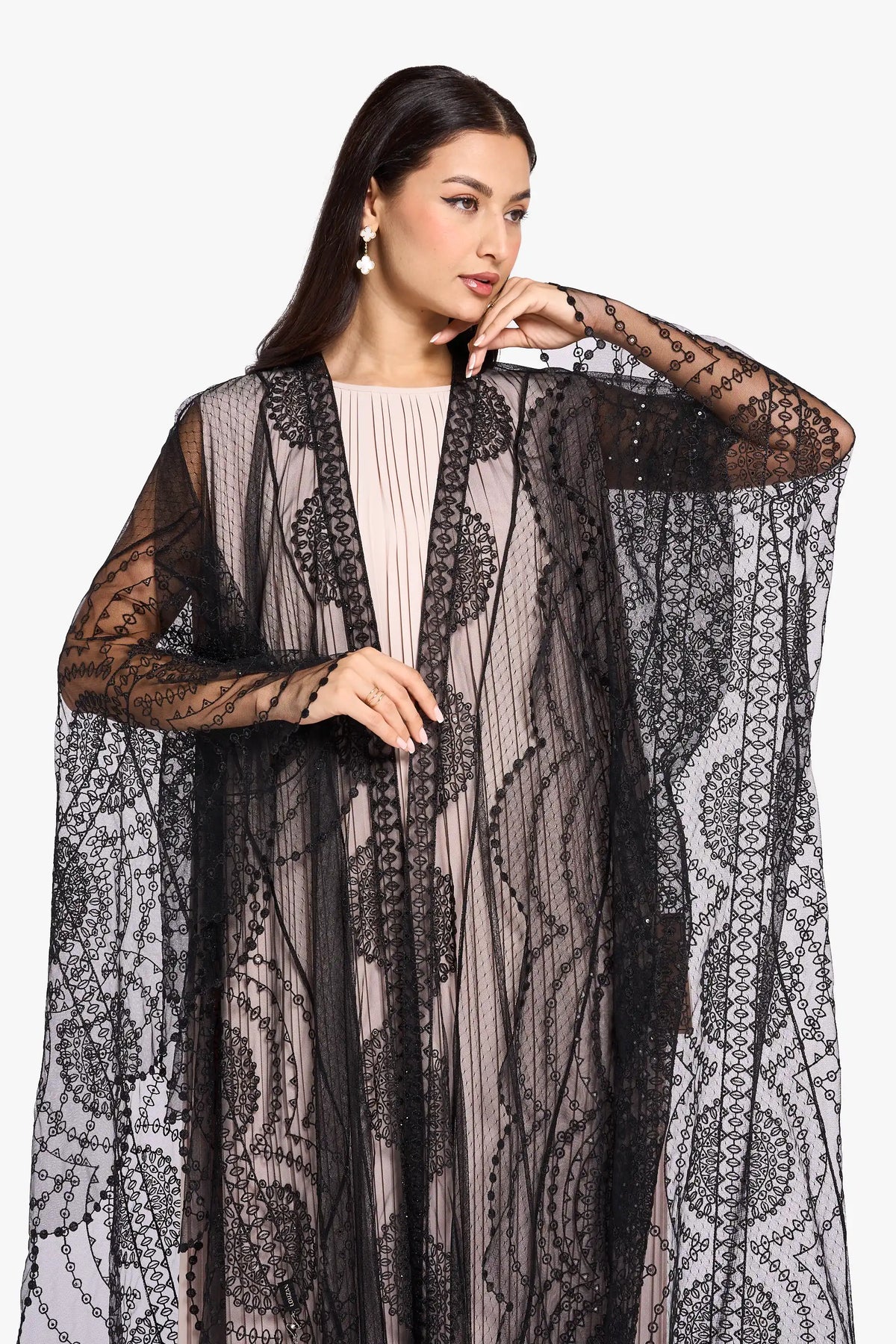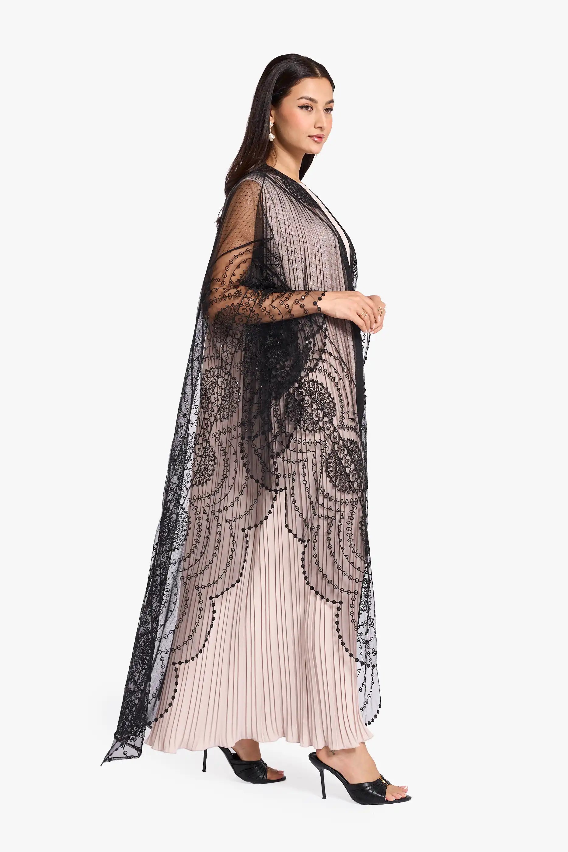 Louzan Wedding abaya crafted from soft tulle and delicate dantel, this exquisite wedding abaya features a circular scallop design adrone with intricate zari and shimmering sequins. A perfect choice for special occasion, it blends elegance and tradition with luxurious detail.