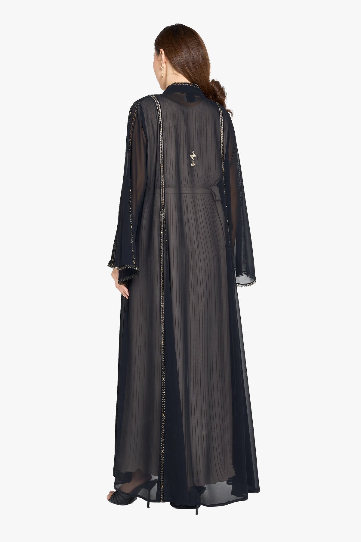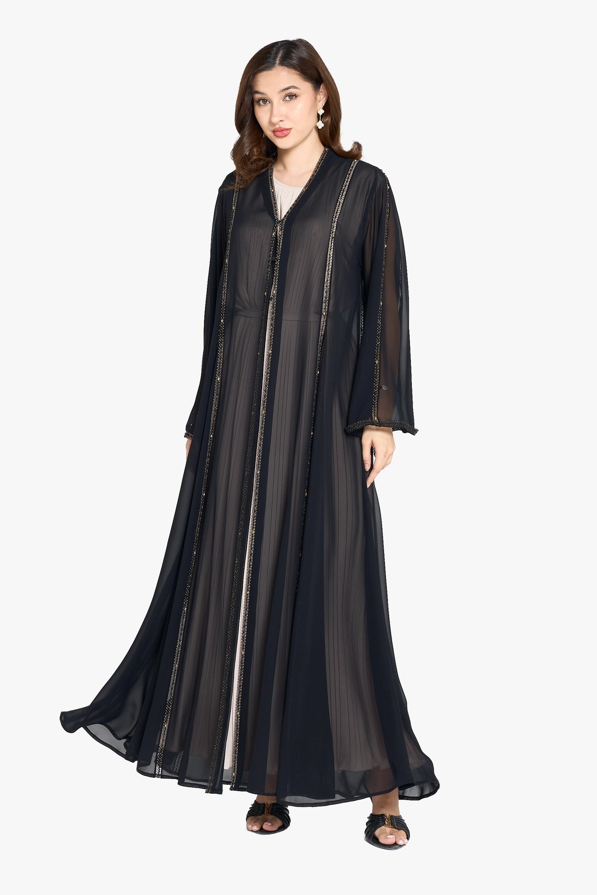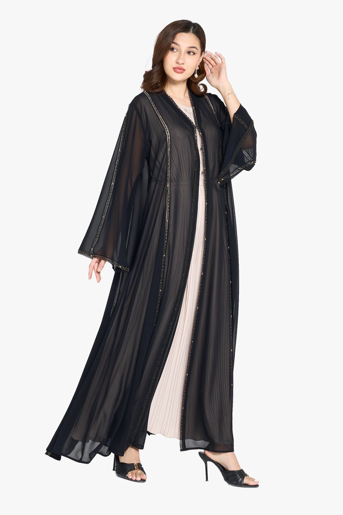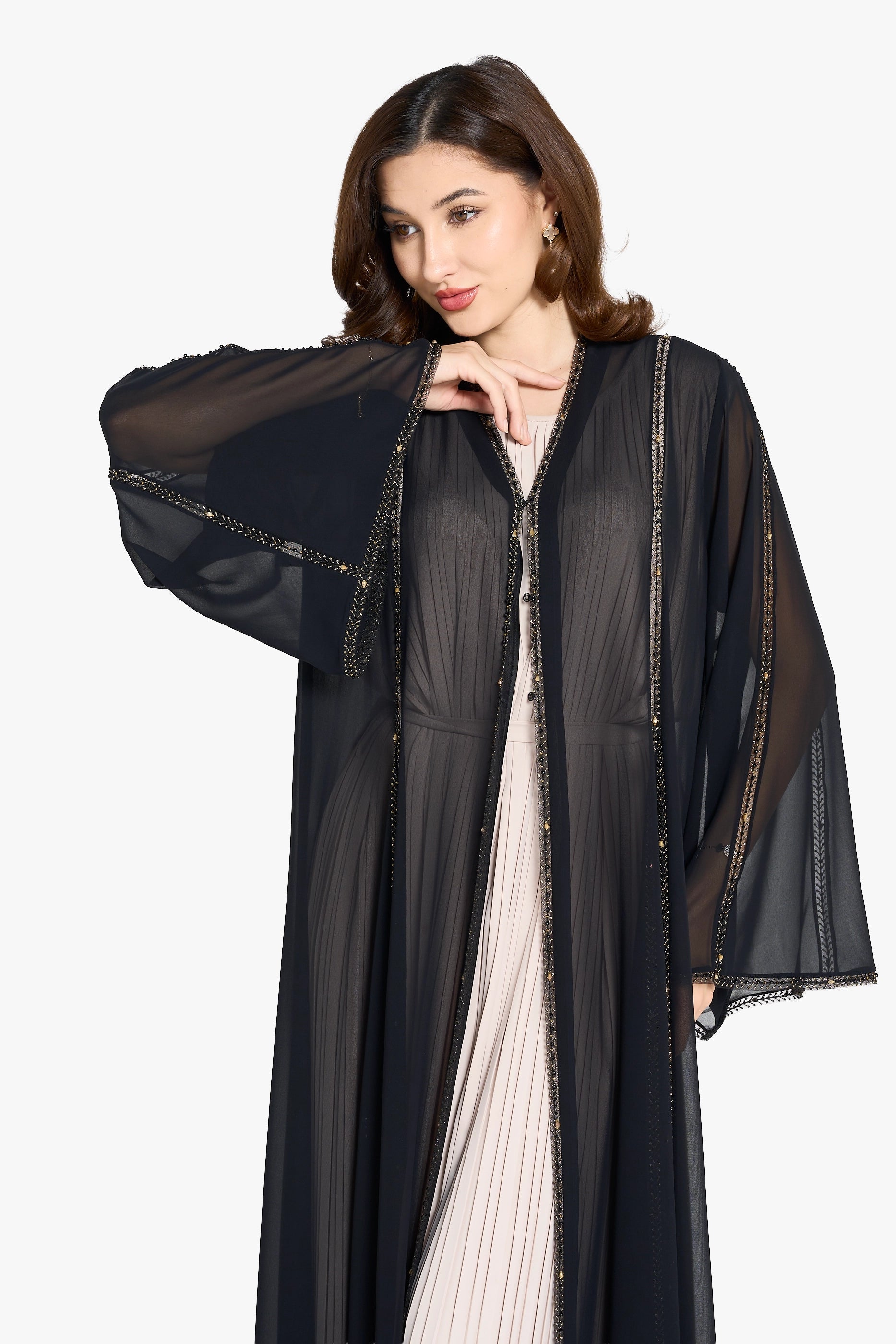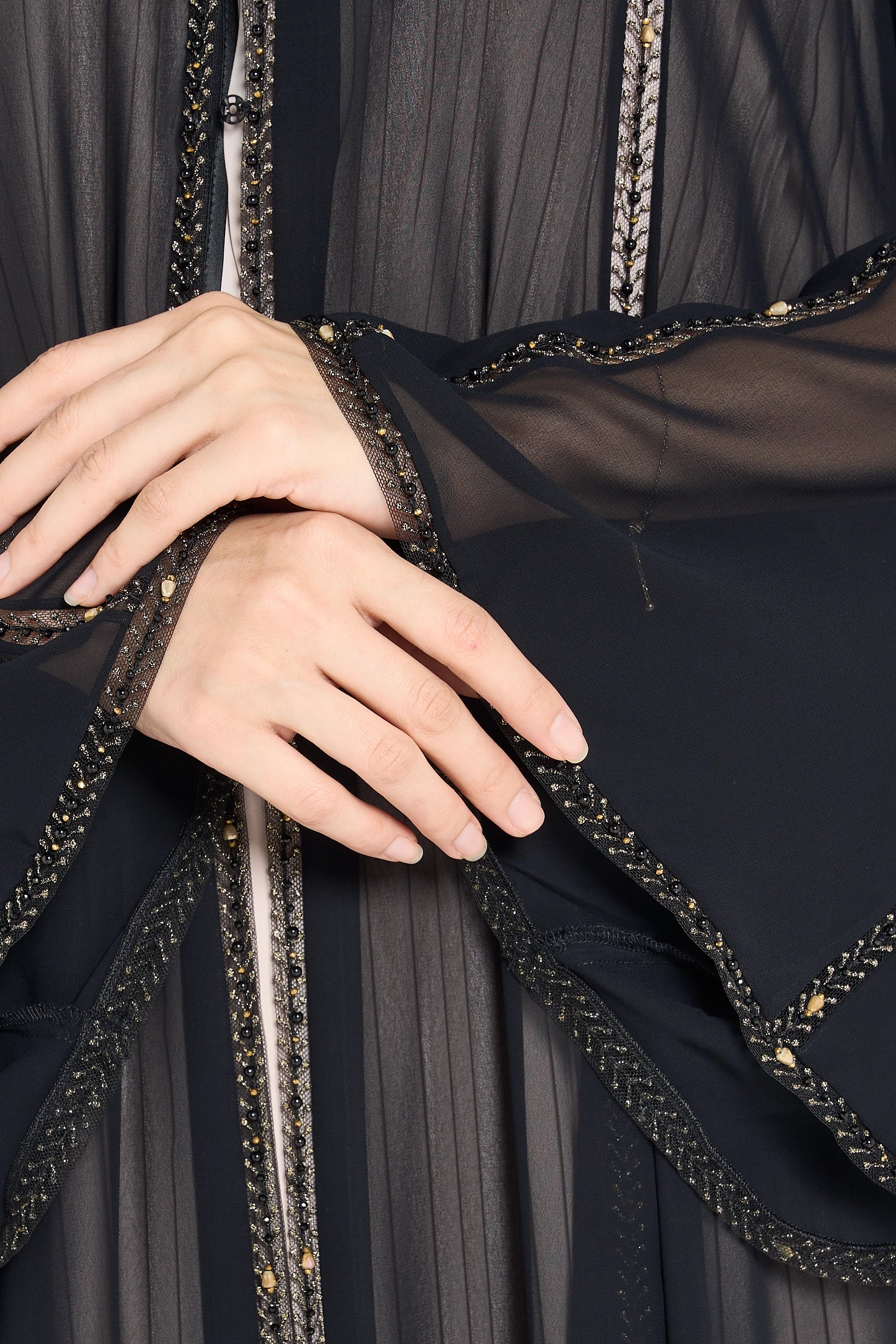 This LOUZAN Wedding Abaya represents a masterclass in bridal design, featuring premium Shifoon fabric renowned for its fluid drape and refined aesthetic. The garment showcases meticulously executed gold-colored hand embroidery paired with traditional Toor embellishment, demonstrating superior craftsmanship and attention to detail. Shifoon's lightweight yet structured composition ensures comfort throughout extended wear while maintaining an impeccable silhouette. The hand-applied gold work and Toor detailing exemplify authentic artisanal techniques, creating a wedding piece that combines technical excellence with timeless elegance for the discerning bride.