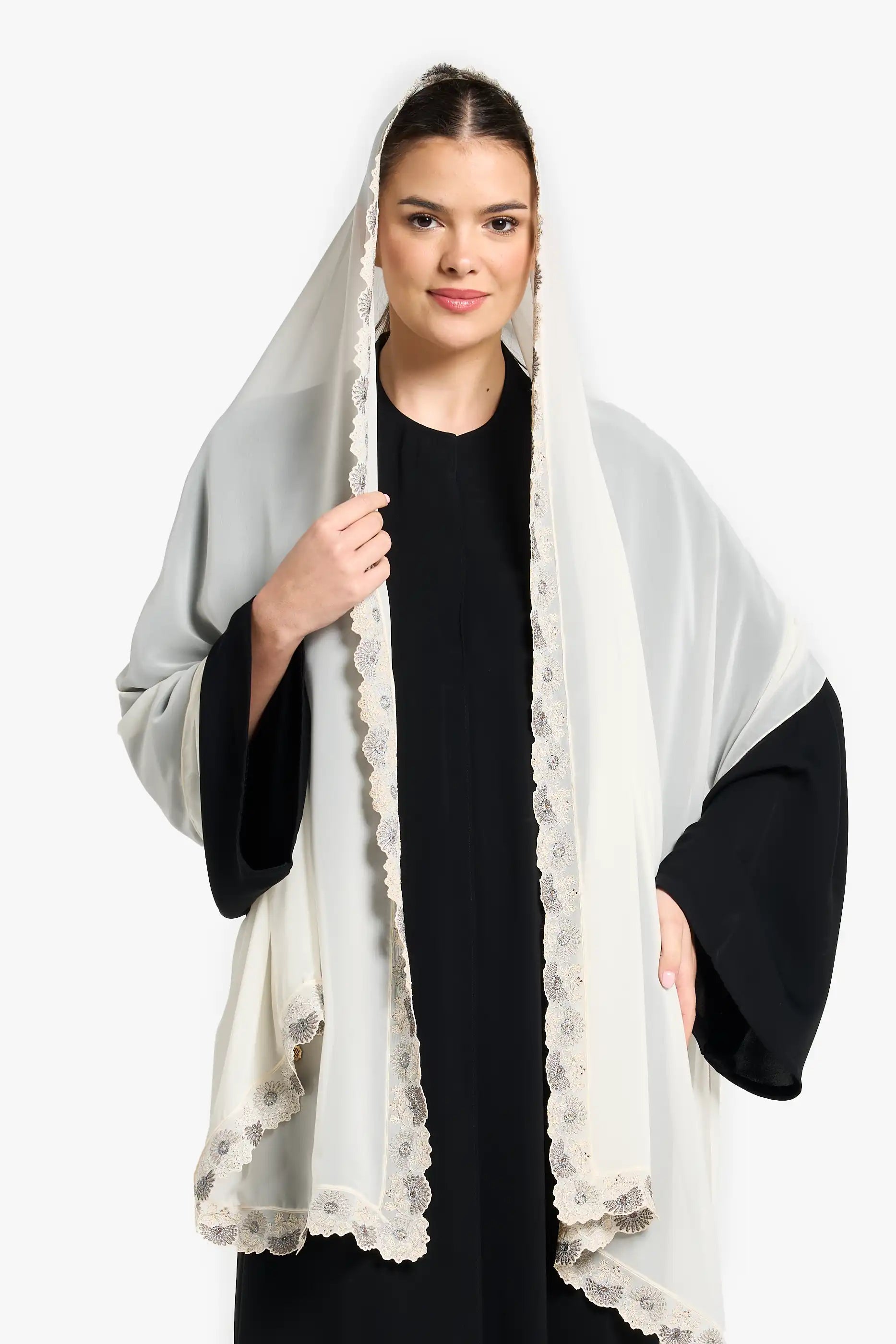 Elevate your look with the LOUZAN ABAYA. Featuring a unique DUJA LAIL hand-made design and a colorful SHEILA, this stunning abaya adds a personal touch to your outfit and creates a bold and elegant look. Hand-crafted for you, make a statement with this exclusive piece.