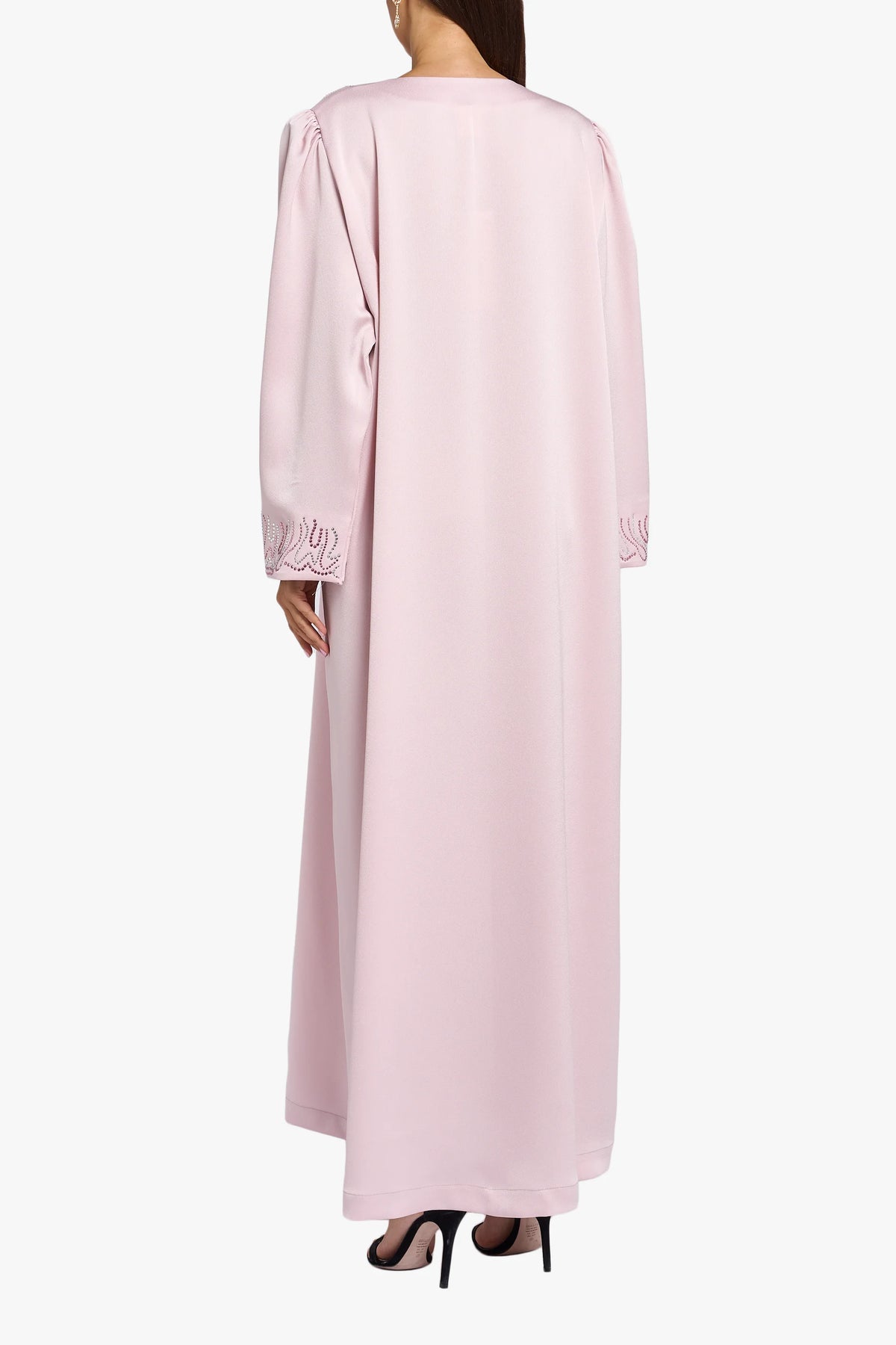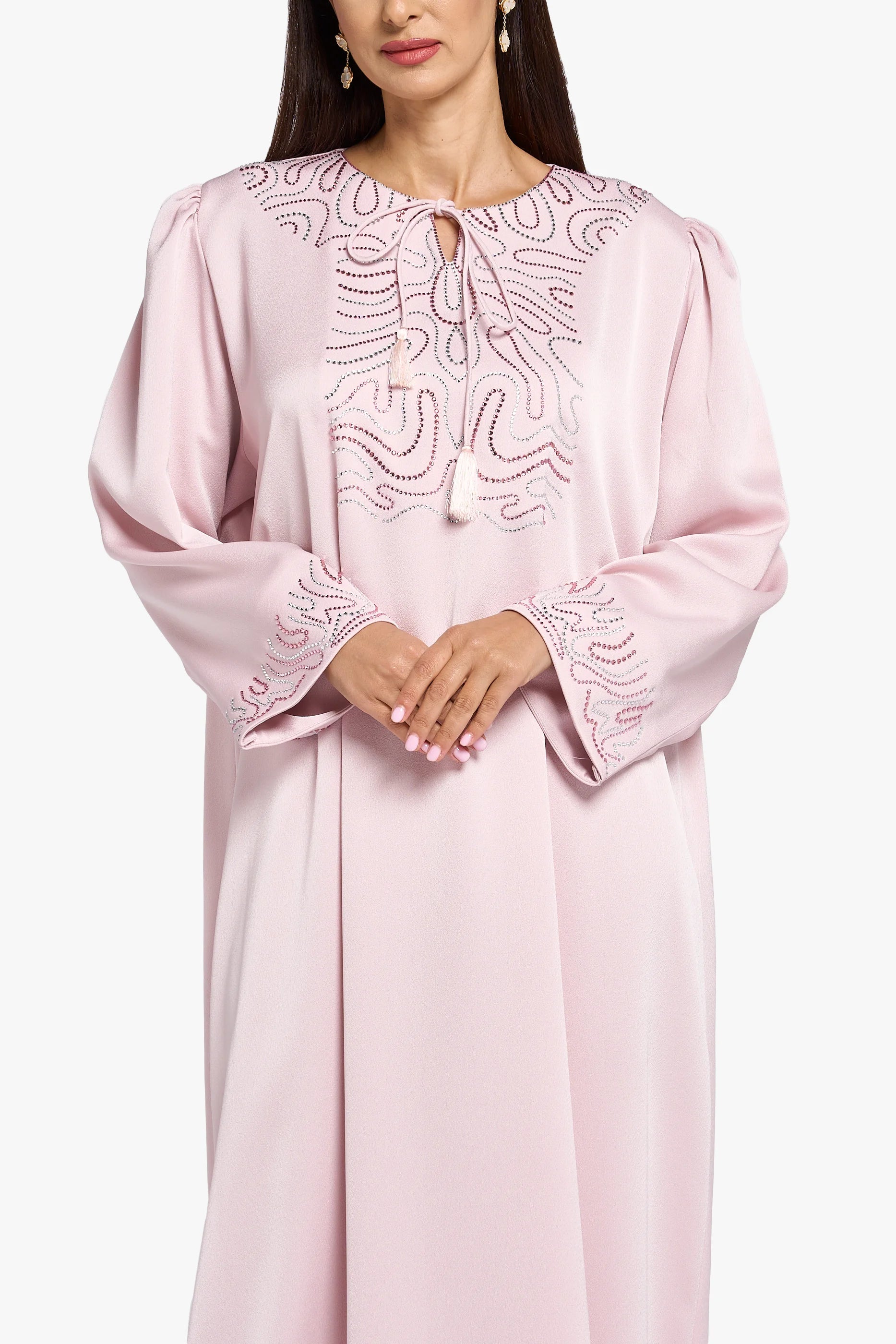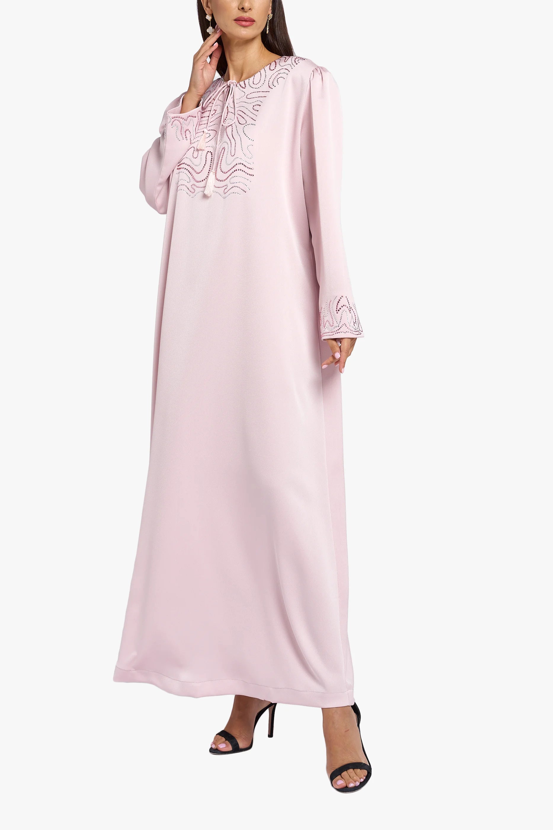 This Mkhawar is made of silky crepe fabric in a soft pink color, with crystal details on the neck and sleeves for a simple and elegant look.