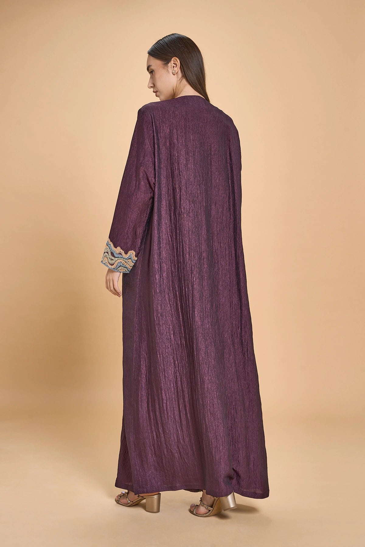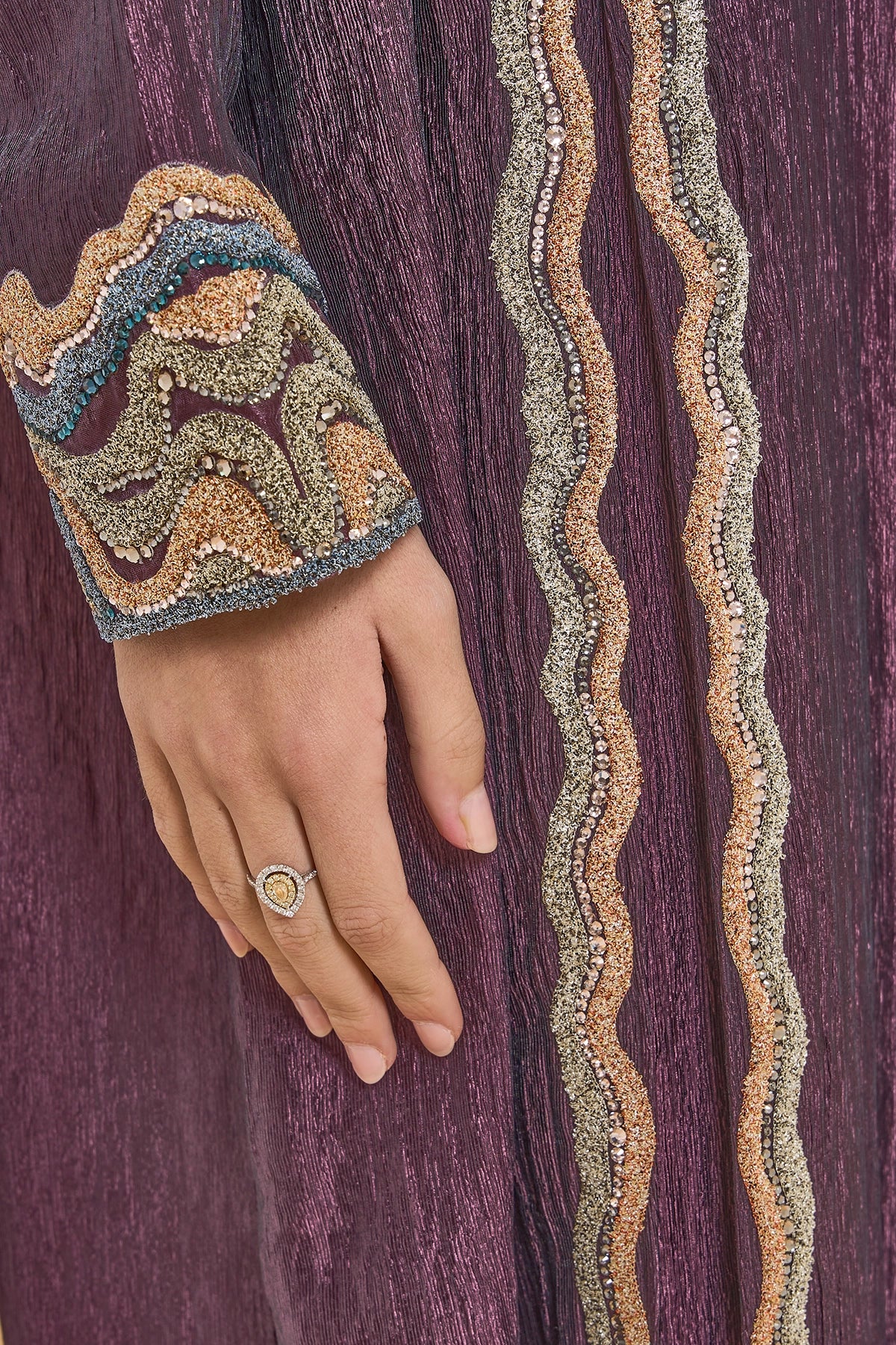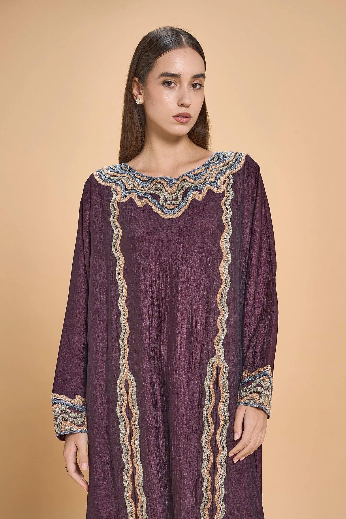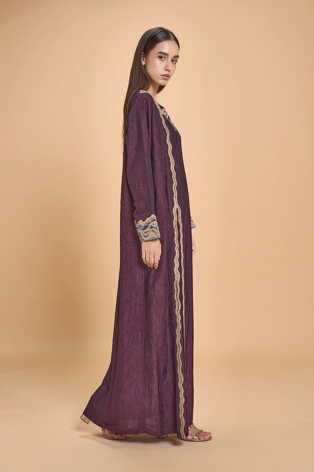 This Jalabiya Features Dimensional 3D Embroidery Tracing The Neckline And Sleeves, With Two Vertical Motifs Extending From The Neckline To The Hem To Frame The Soft Front Pleats. Crystals Are Set Between The Embroidered Elements, Adding A Controlled, Understated Shimmer That Moves Gently With The Fabric.