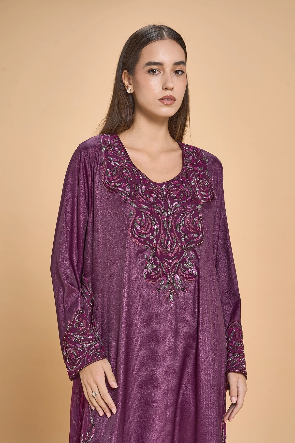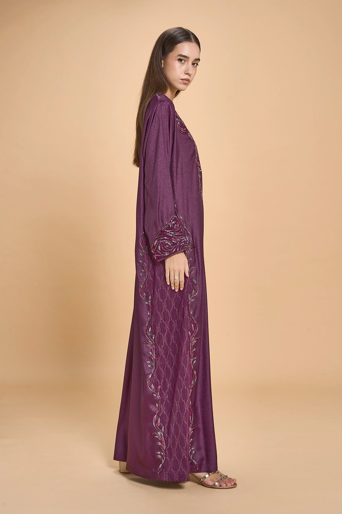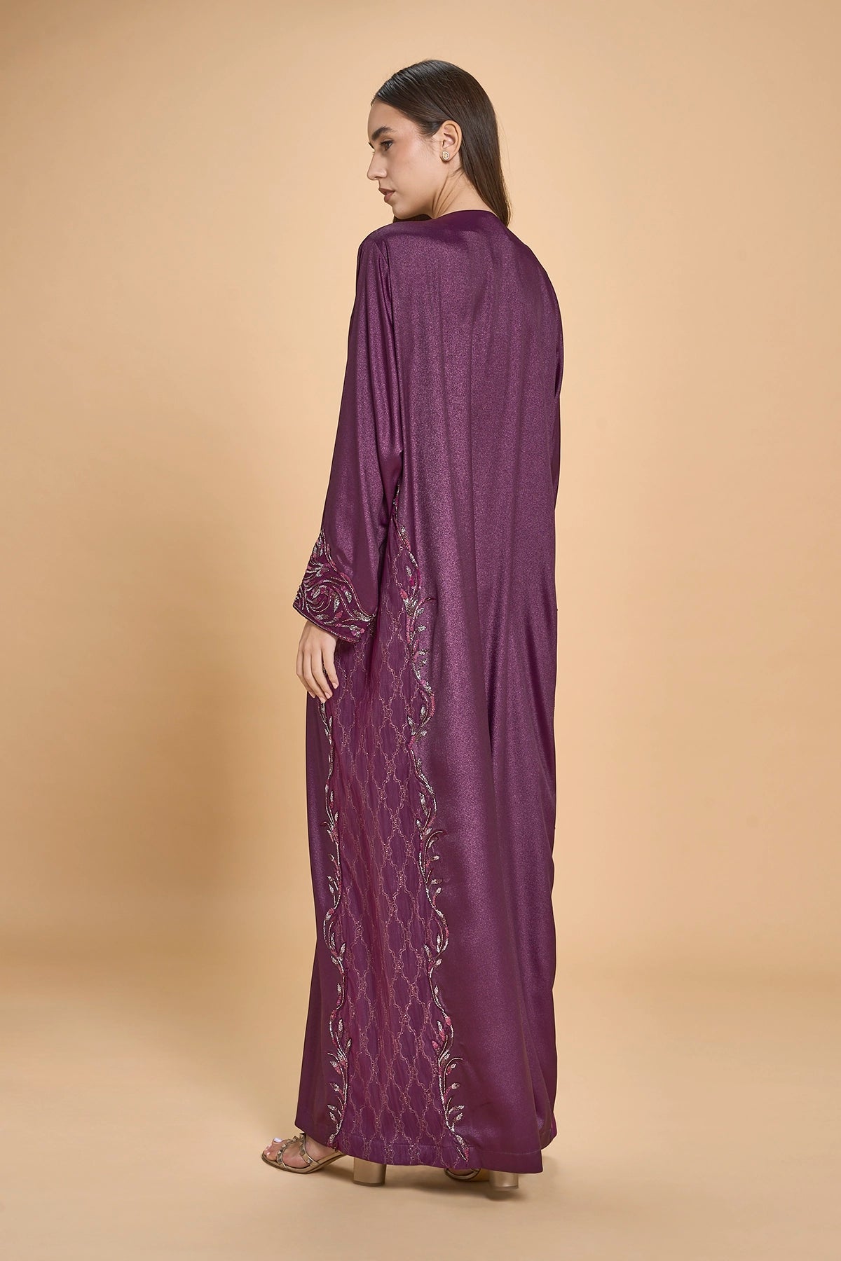 This Jalabiya Is Made From Shiny Crepe Satin That Gives The Silhouette A Smooth, Luminous Flow. Lace Side Panels Introduce Texture And Depth, Creating A Balanced Contrast With The Satin’S Clean Finish. Hand Embroidery Traces The Neckline, Sleeves, And Side Seams With Precise Detailing, Enhanced With Subtle Crystal Touches That Bring A Controlled Light Play To The Design.