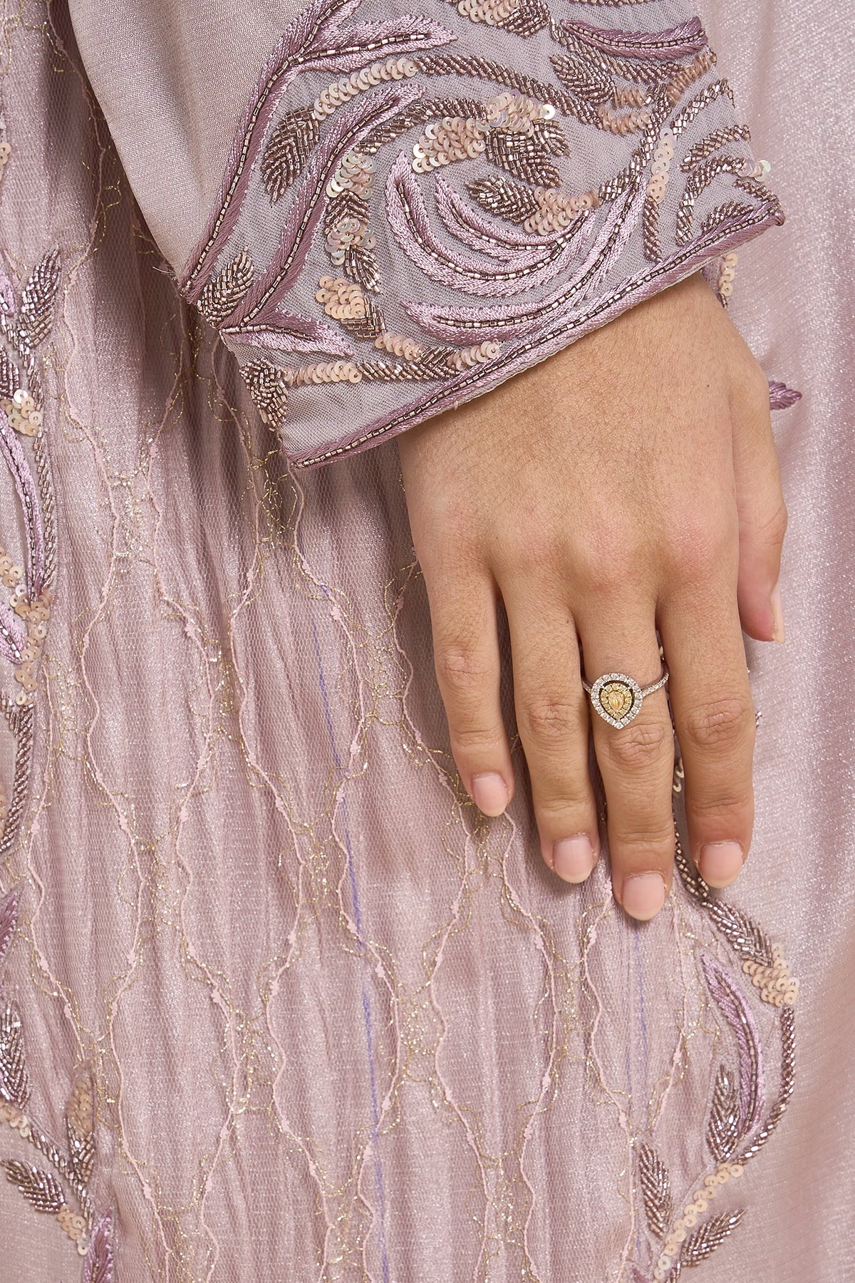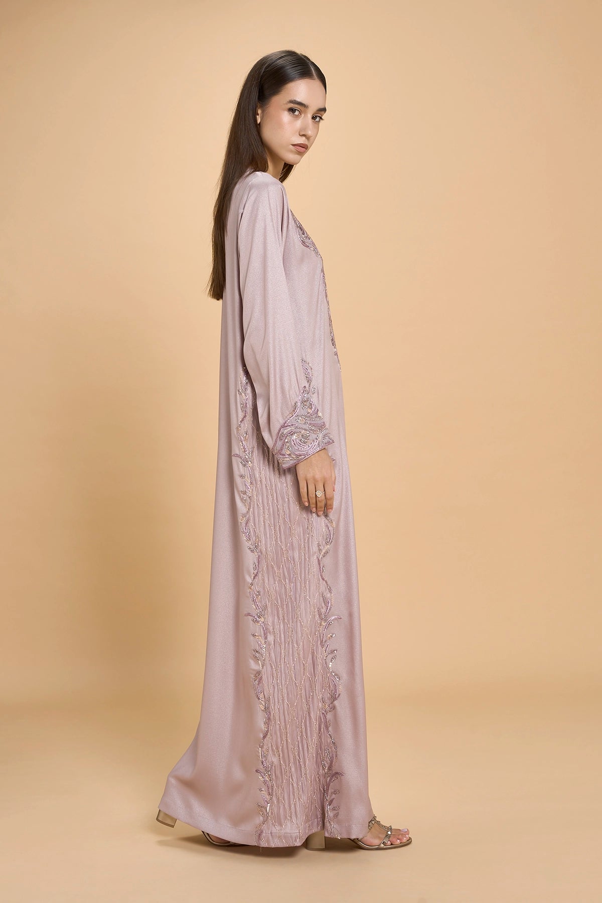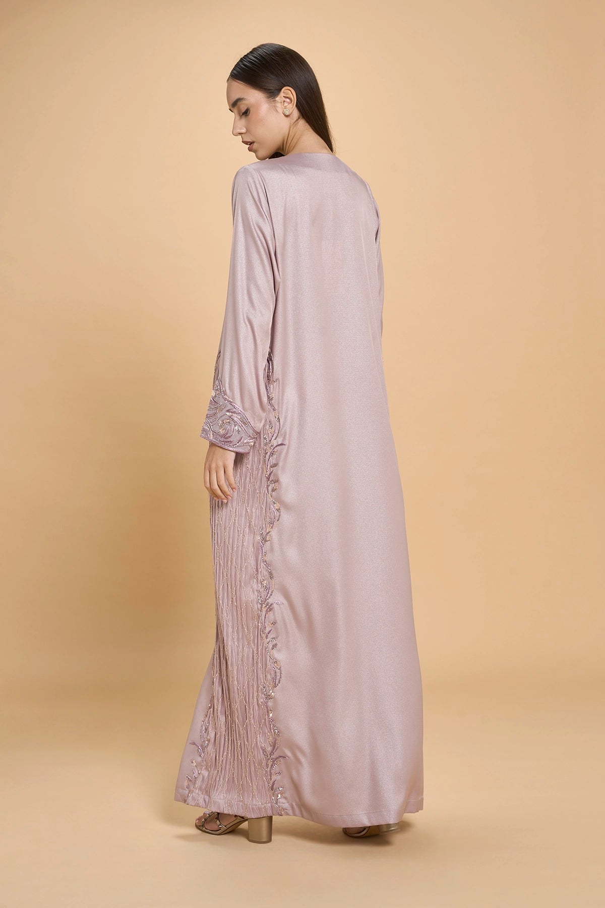 This Jalabiya Is Made From Shiny Crepe Satin That Gives The Silhouette A Smooth, Luminous Flow. Lace Side Panels Introduce Texture And Depth, Creating A Balanced Contrast With The Satin’S Clean Finish. Hand Embroidery Traces The Neckline, Sleeves, And Side Seams With Precise Detailing, Enhanced With Subtle Crystal Touches That Bring A Controlled Light Play To The Design.