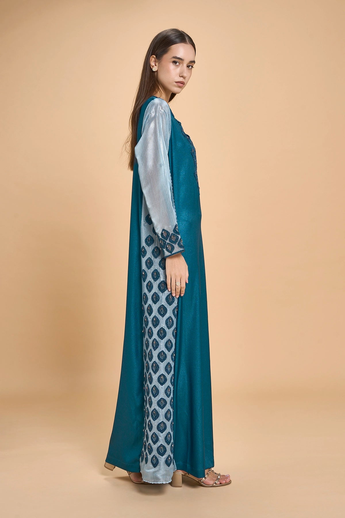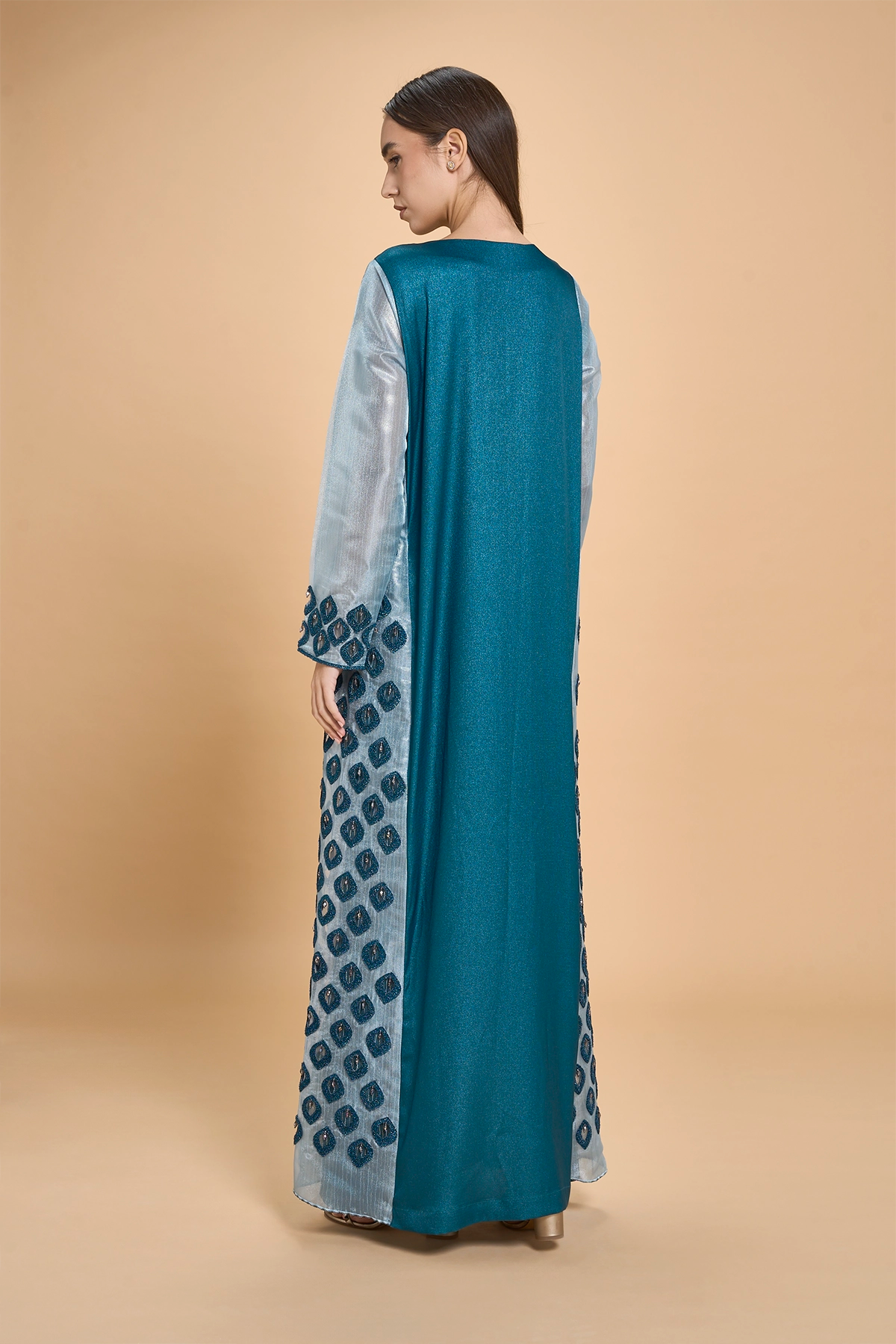 This Jalabiya Is Made From Shiny Crepe Satin For A Smooth, Polished Finish, Balanced With Organza Sleeves And Side Panels That Bring A Light, Airy Flow To The Silhouette. A Clean Round Neckline Frames The Design, While Embroidery, Laser-Cut Motifs, And Delicate Beadwork Are Placed Along The Neckline, Sleeves, And Side Panels With Thoughtful Precision.