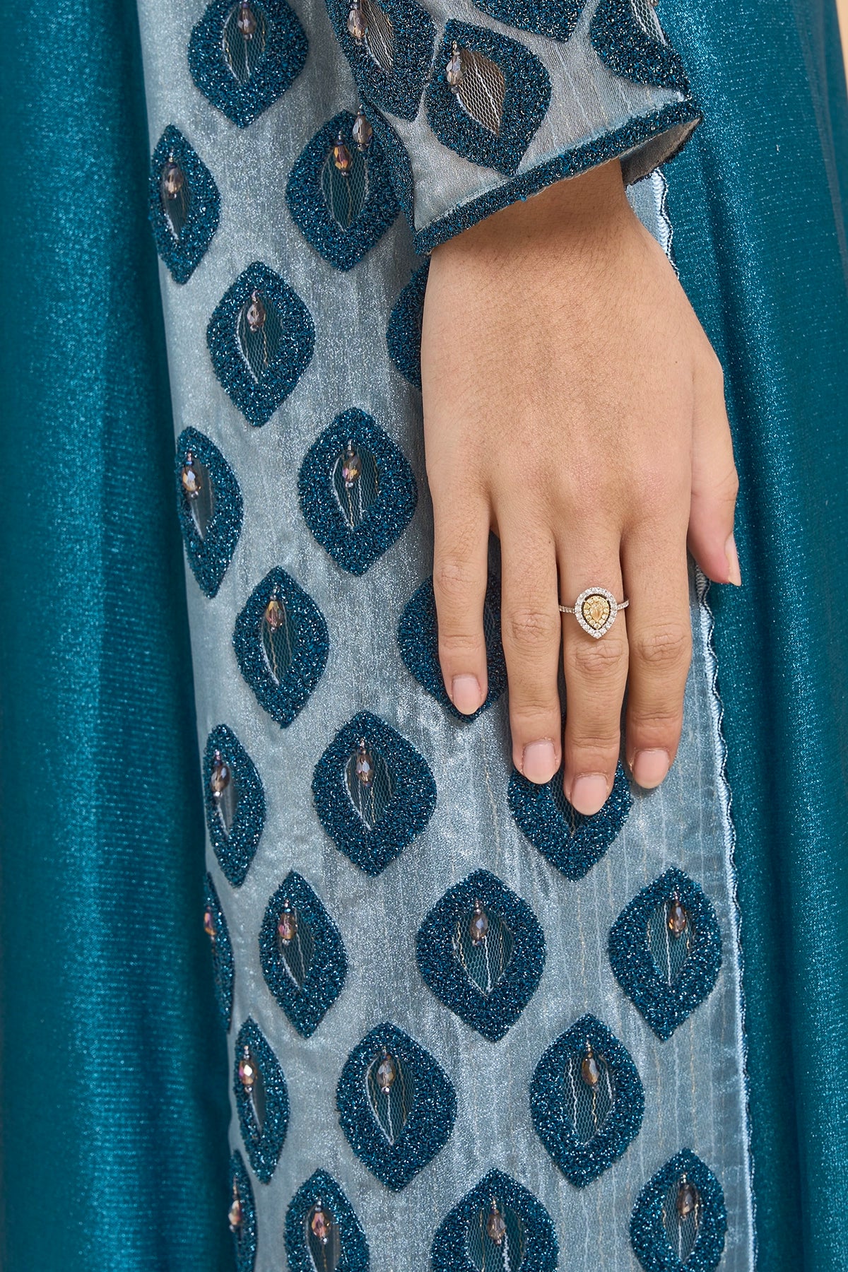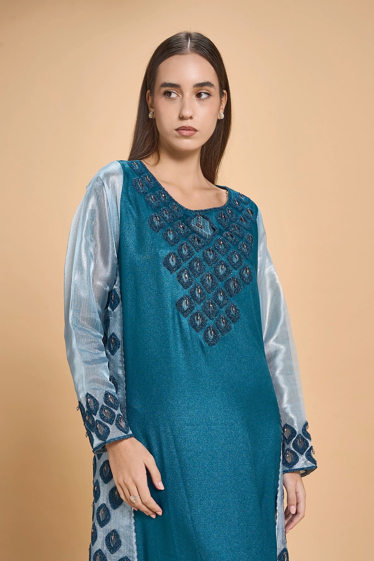 Available In Beige, Teal, And Lavender, The Piece Carries A Poised, Elevated Presence Ideal For Special Occasions.