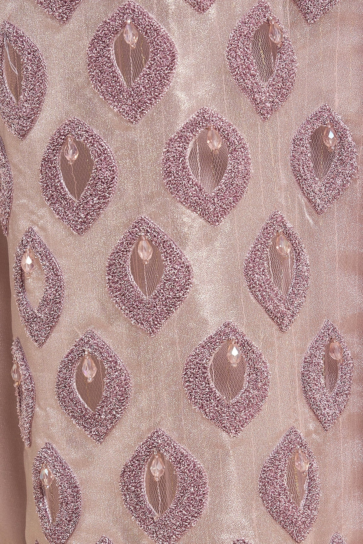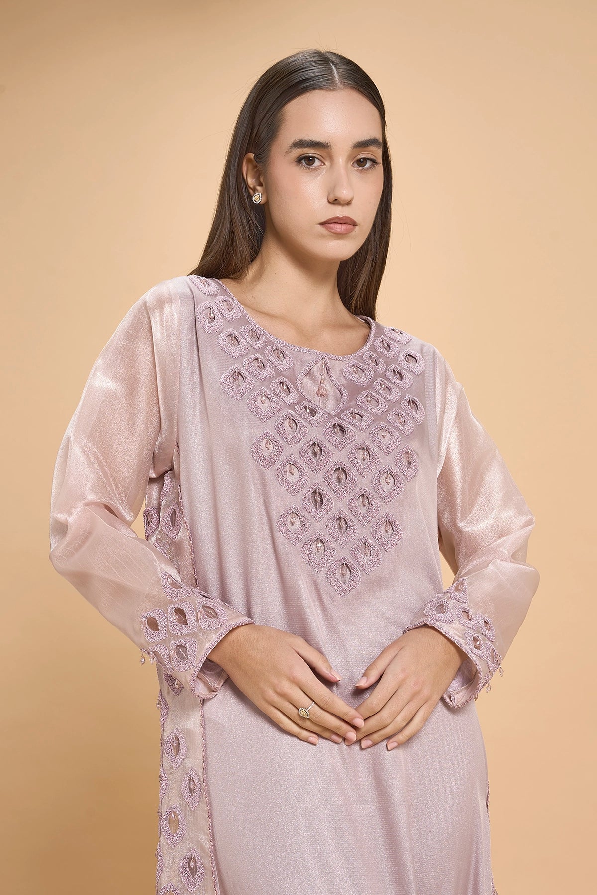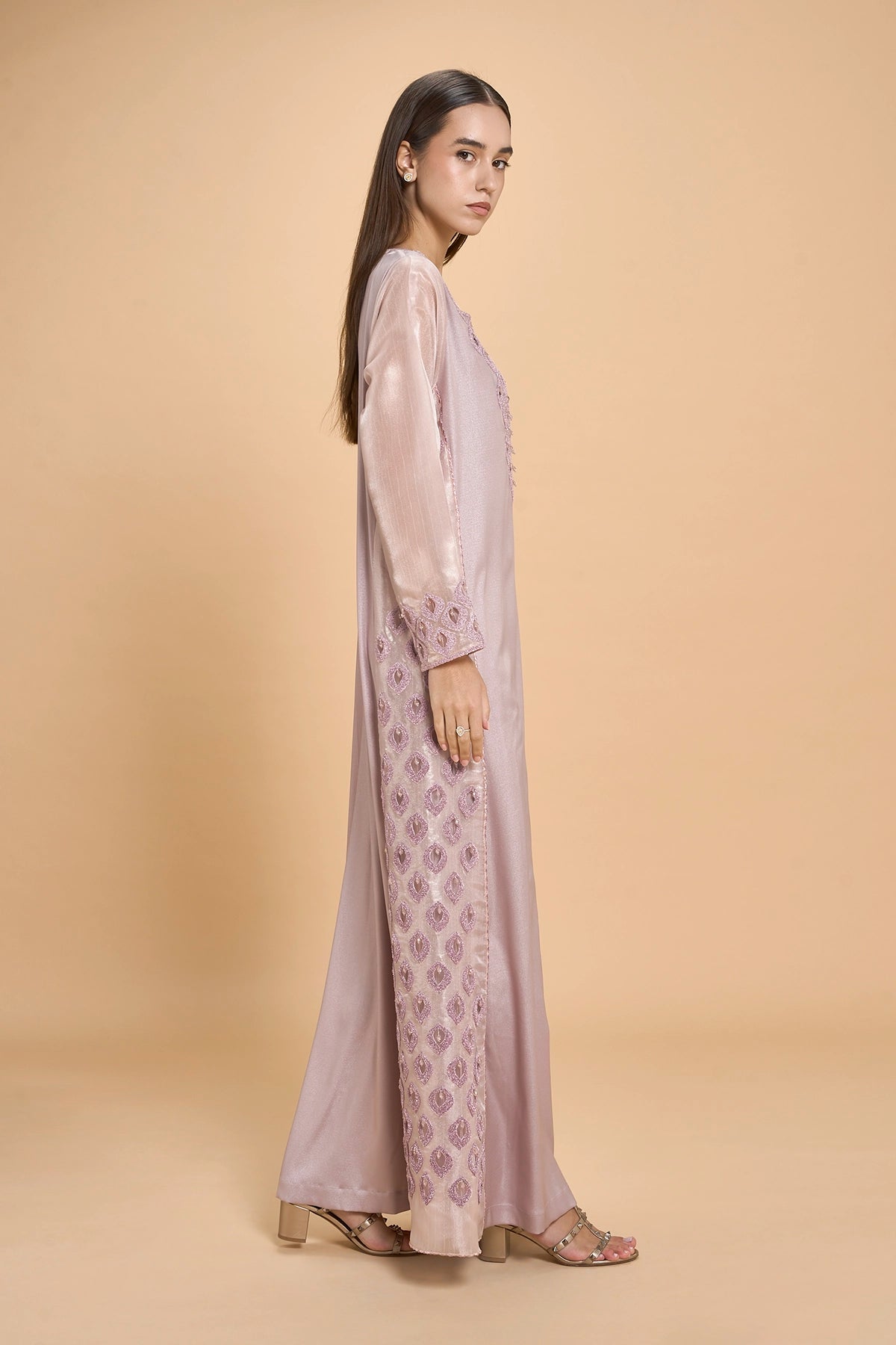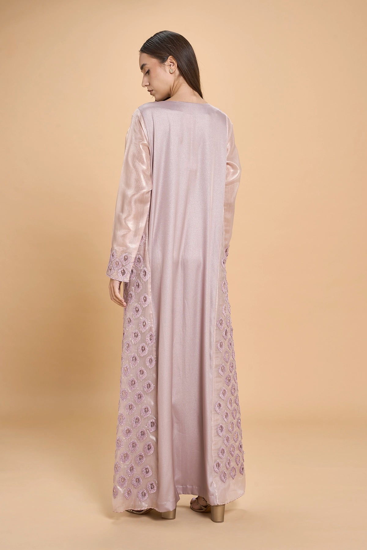 This Jalabiya Is Made From Shiny Crepe Satin For A Smooth, Polished Finish, Balanced With Organza Sleeves And Side Panels That Bring A Light, Airy Flow To The Silhouette. A Clean Round Neckline Frames The Design, While Embroidery, Laser-Cut Motifs, And Delicate Beadwork Are Placed Along The Neckline, Sleeves, And Side Panels With Thoughtful Precision.