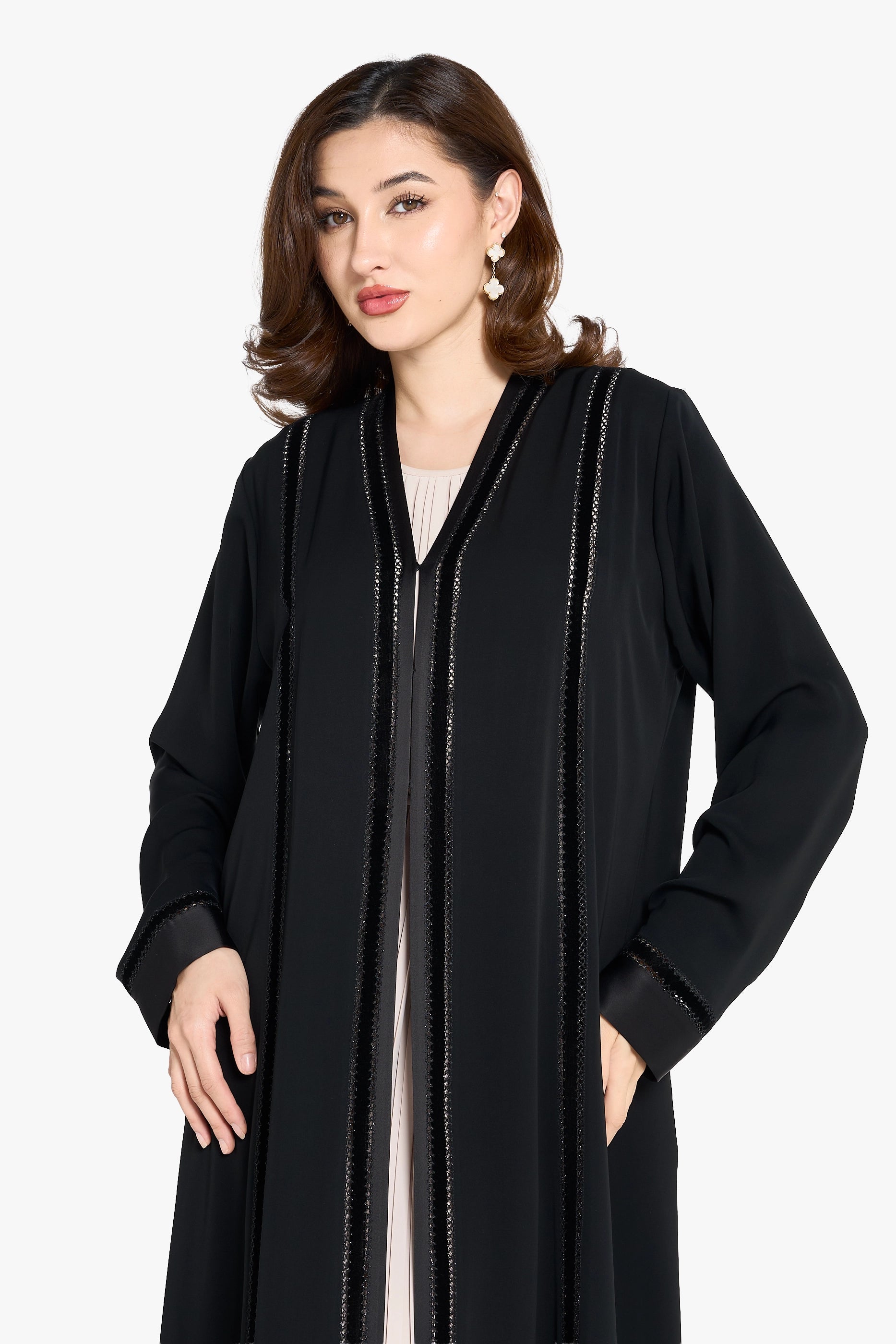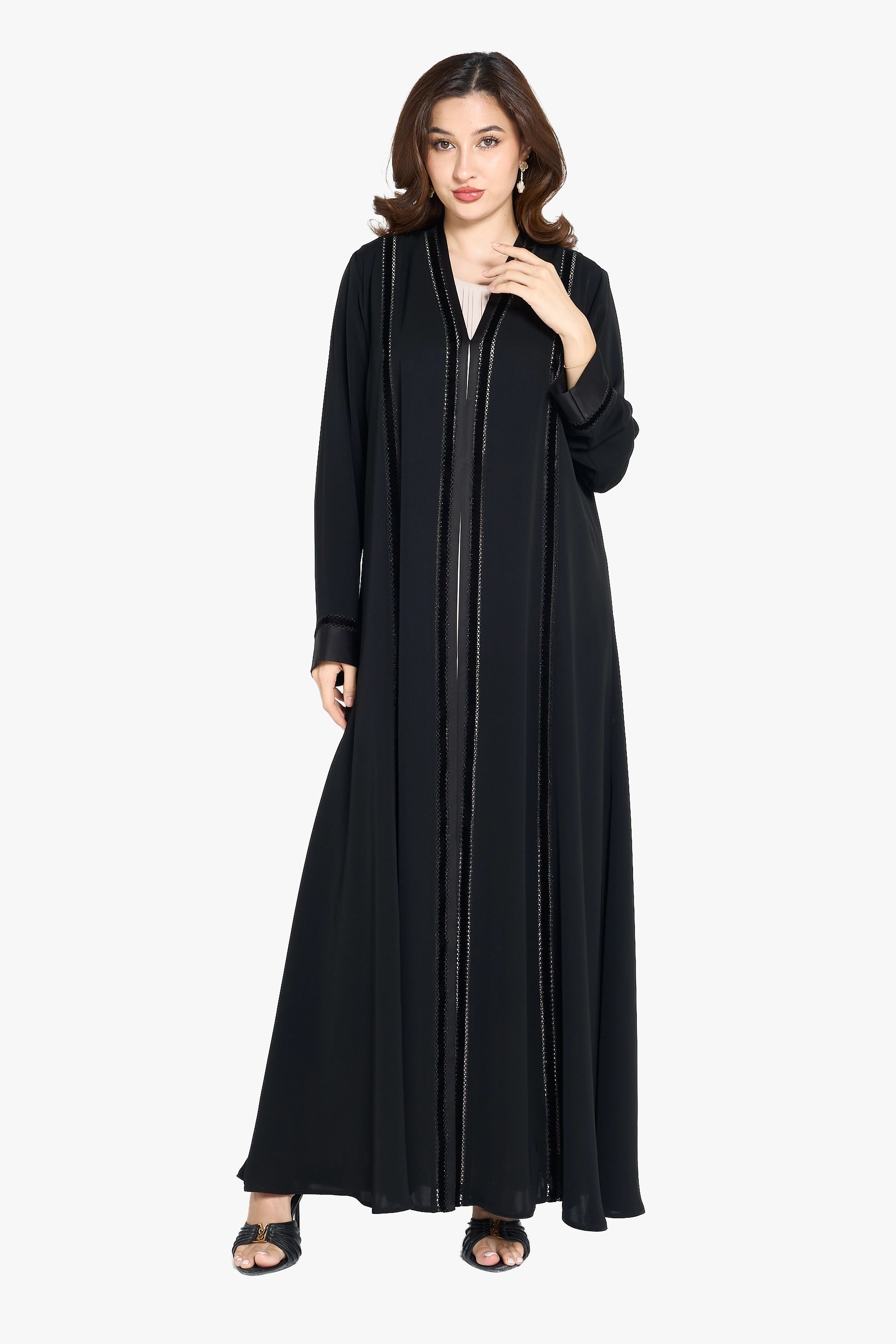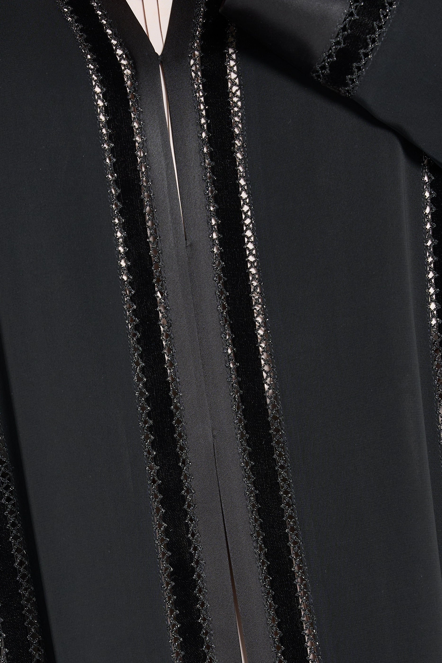 Louzan abaya features a refined blend of nida and velvet fabrics, offering a soft yet structured silhouette. Its elegant top-stitch embroidery adds subtle texture and sophistication, making it an impeccable choice for those seeking both comfort and timeless style in modest wear.