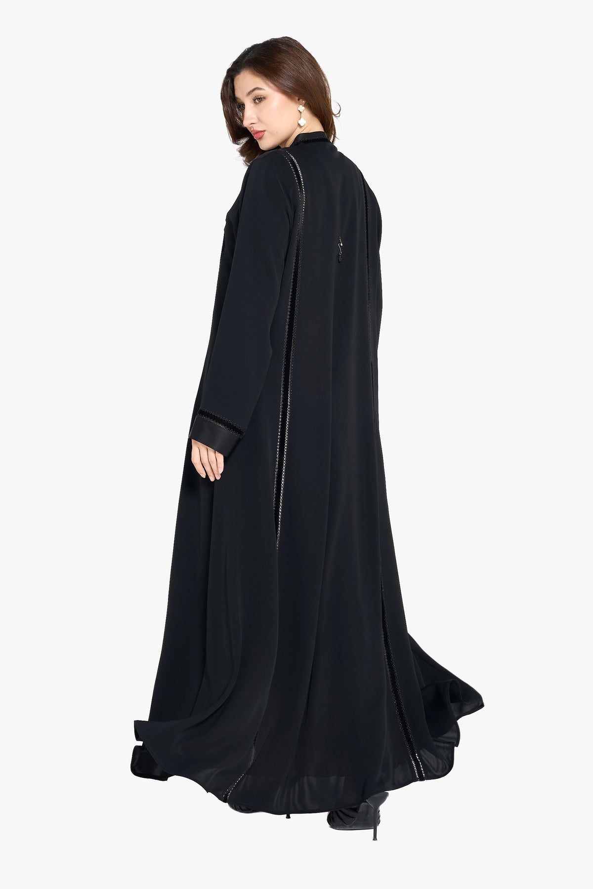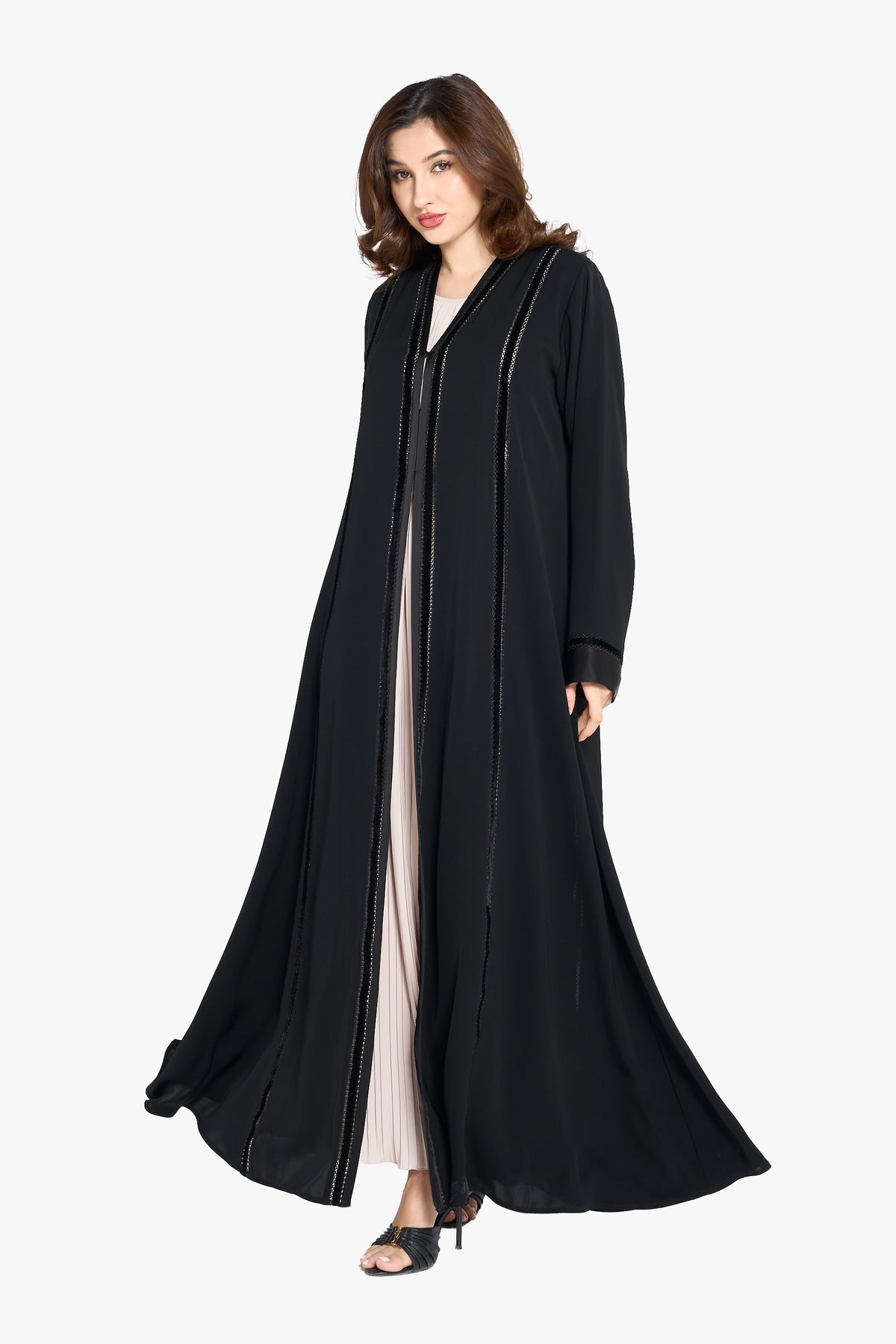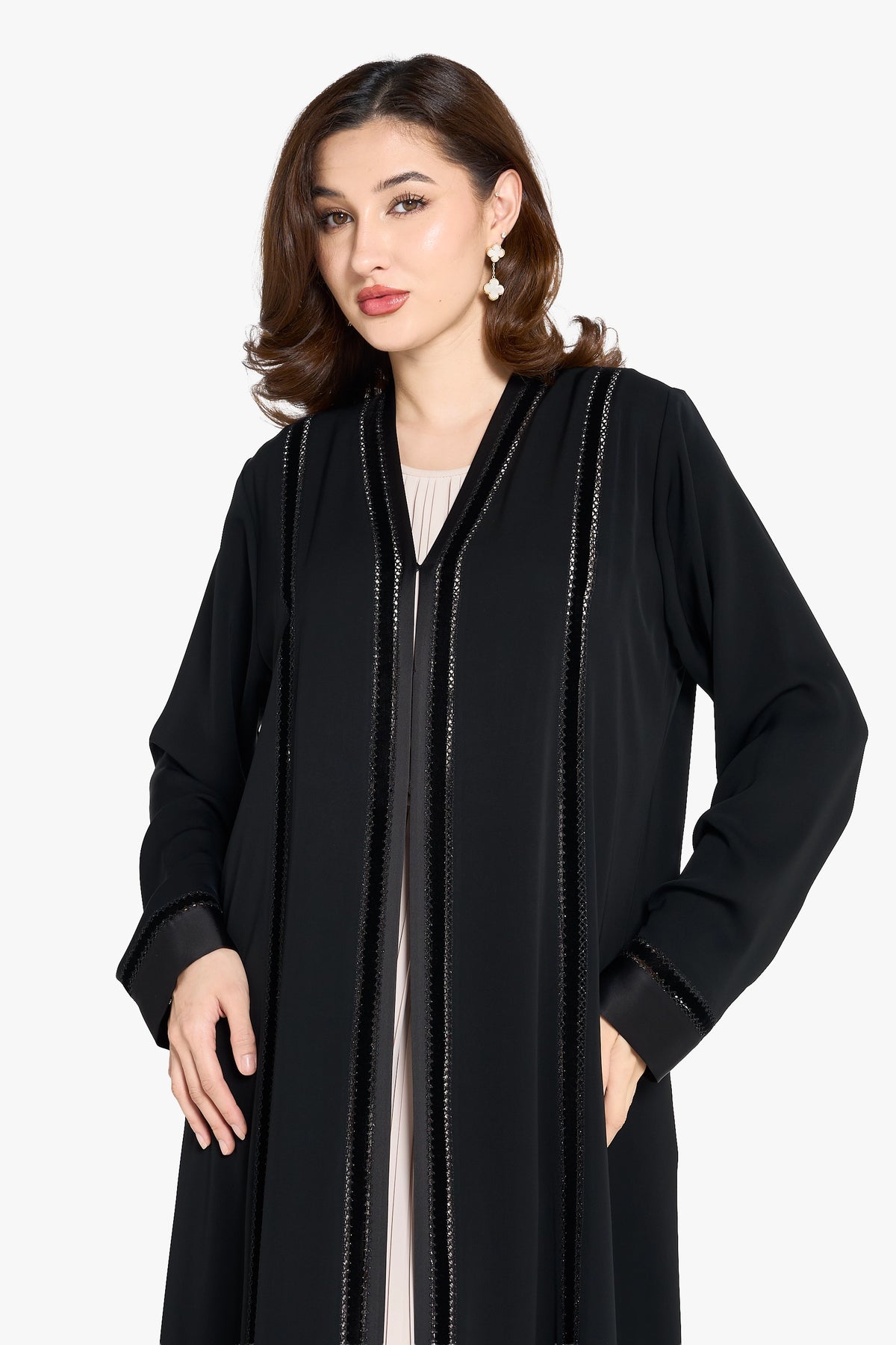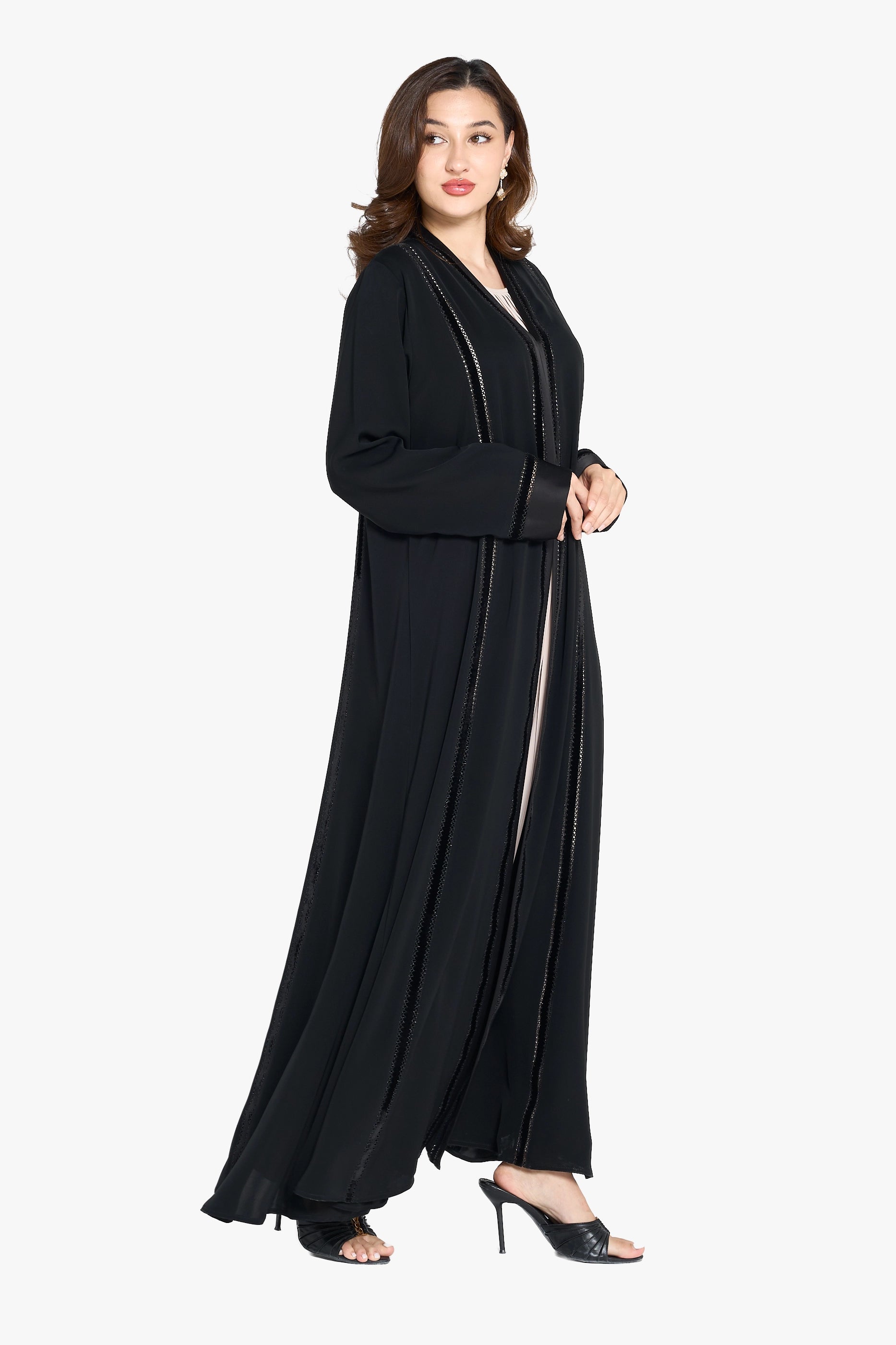 Louzan abaya features a refined blend of nida and velvet fabrics, offering a soft yet structured silhouette. Its elegant top-stitch embroidery adds subtle texture and sophistication, making it an impeccable choice for those seeking both comfort and timeless style in modest wear.