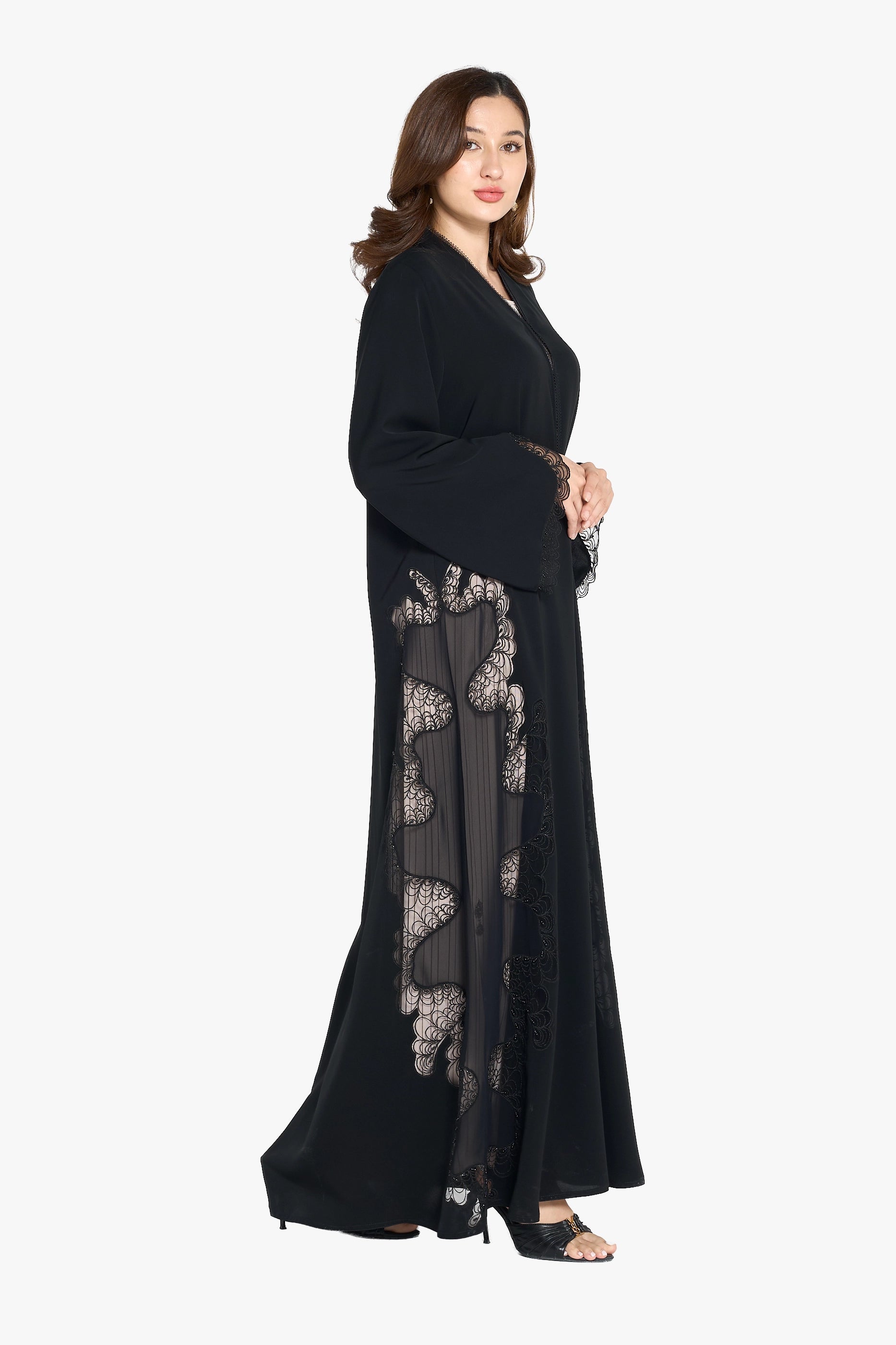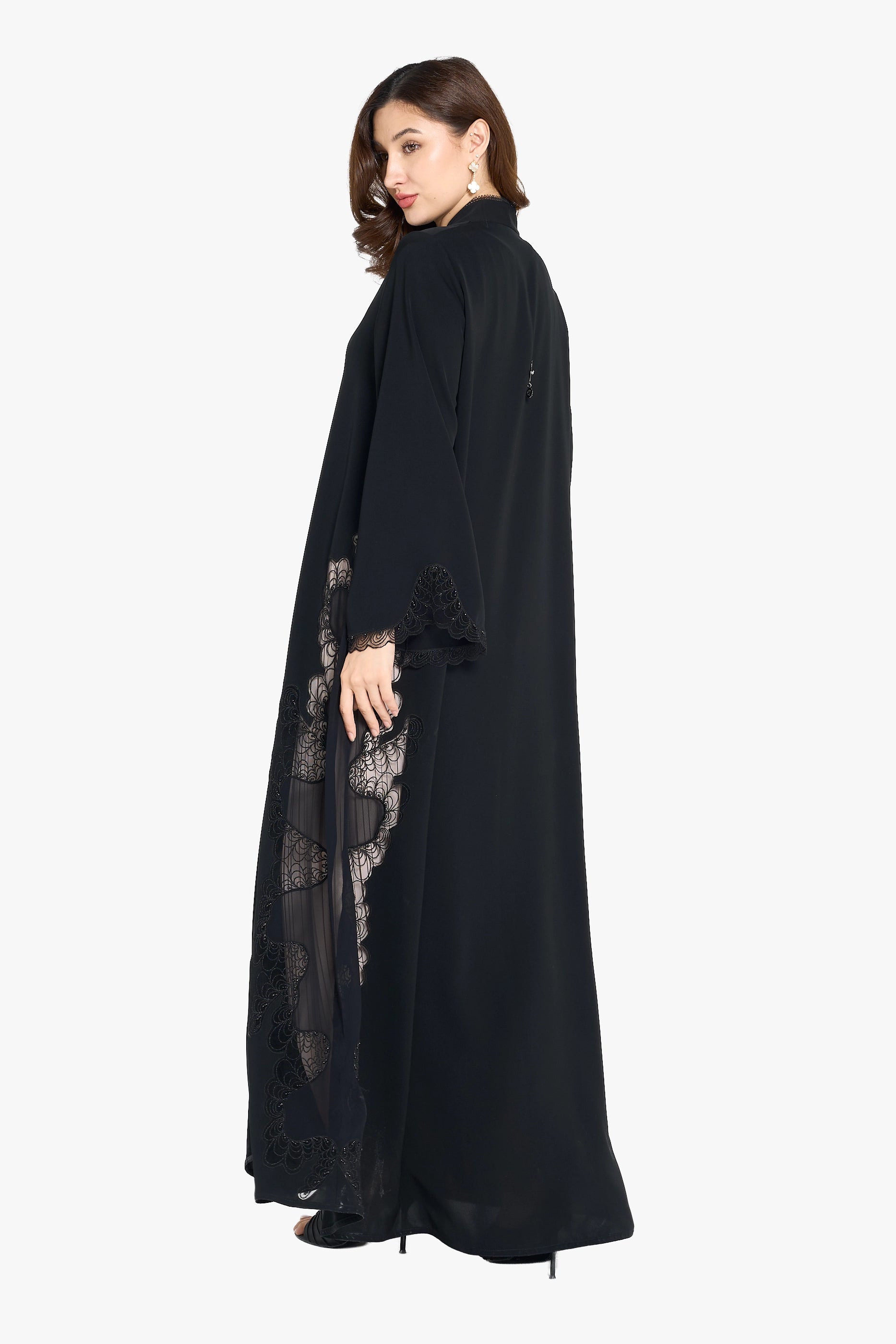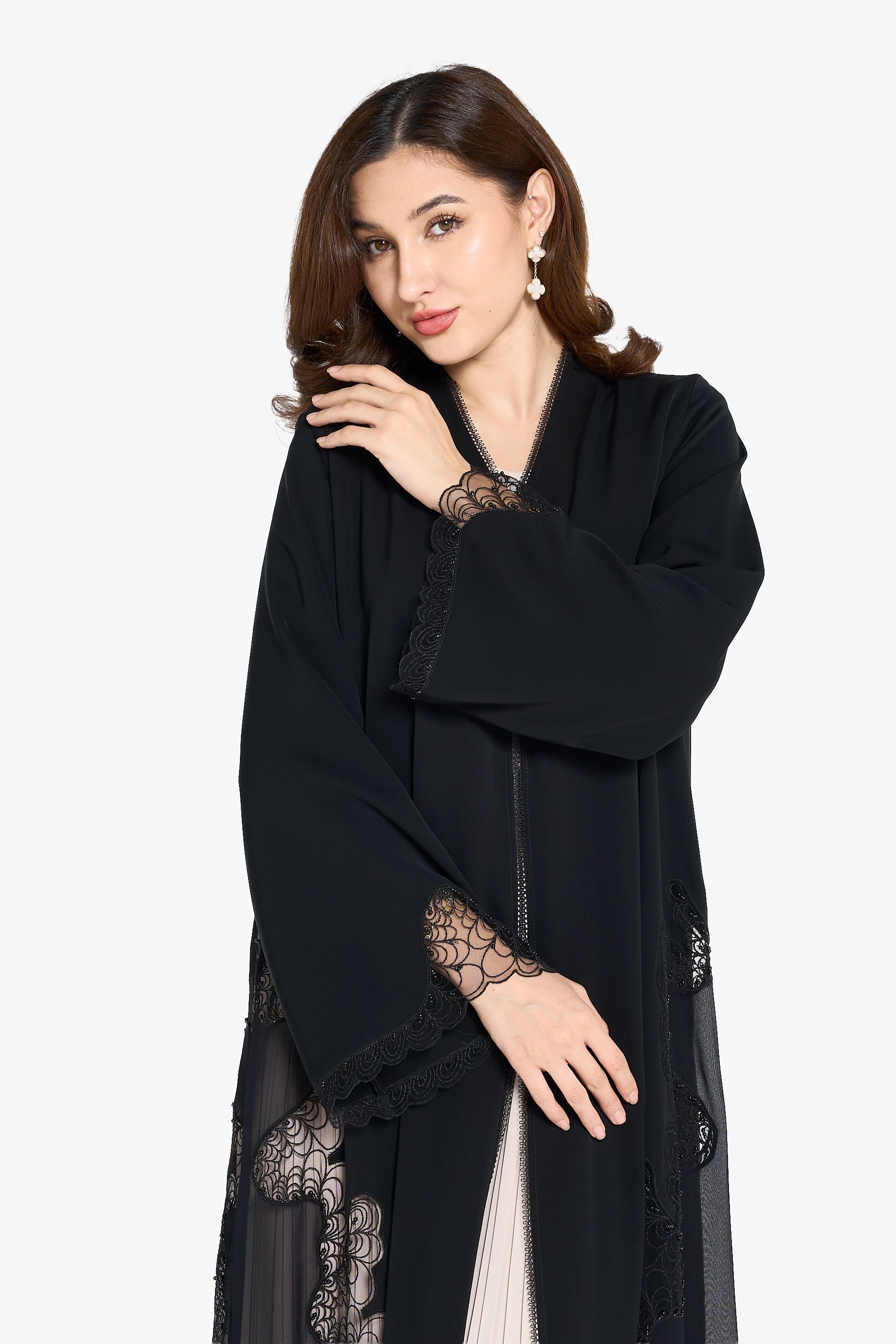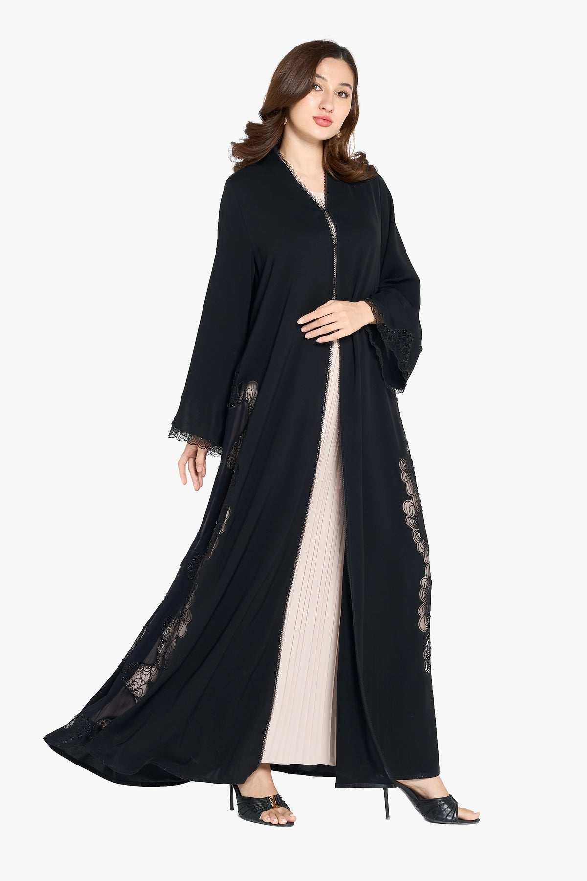 Louzan Abaya combines the softness of nida and chiffon fabrics with exquisite abstract swirl embroidery on the side panels and sleeves, subtly enhanced by delicate crystals. This expertly crafted piece offers a refined yet unique look, perfect for elevating your everyday wardrobe with understated elegance and comfort.
