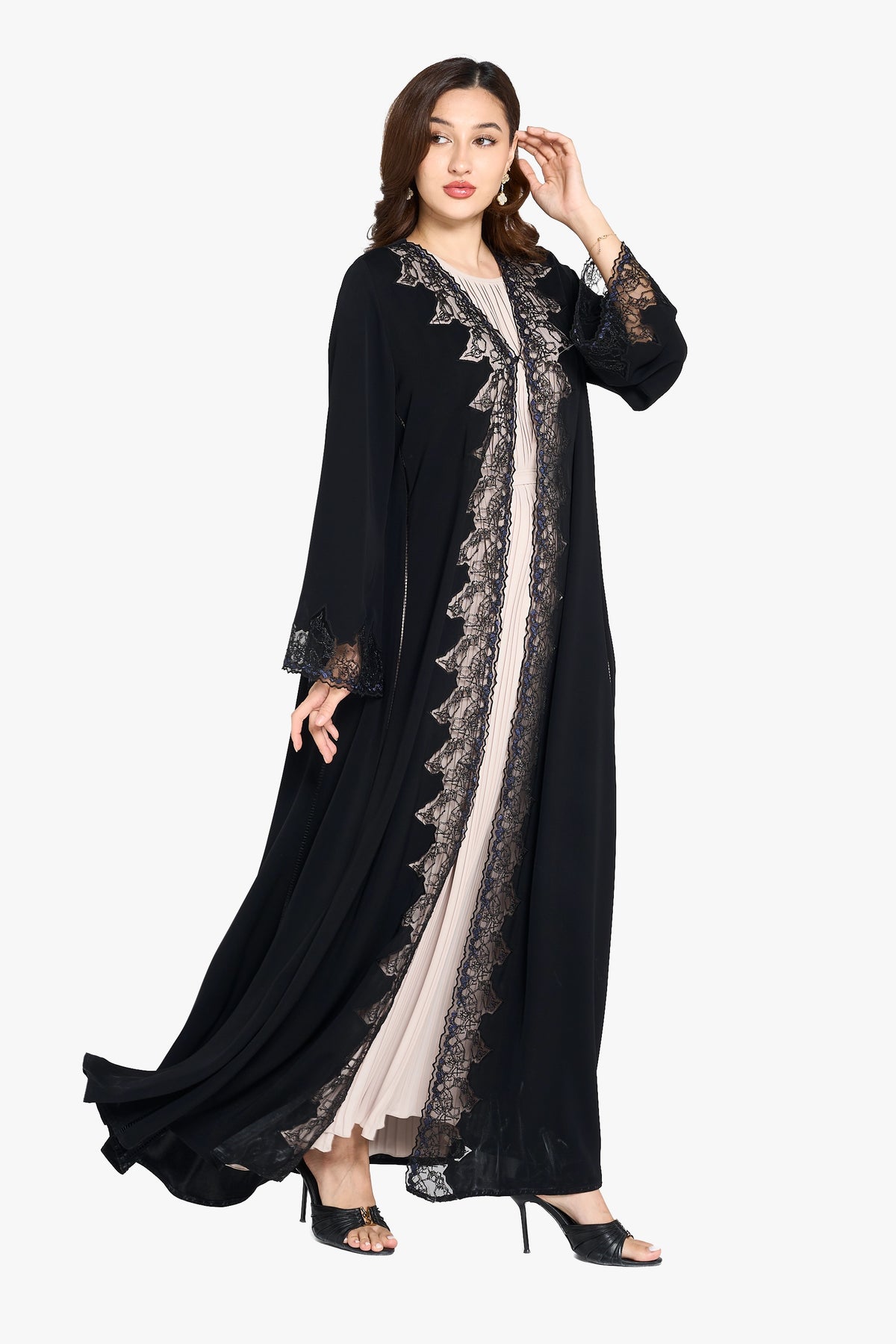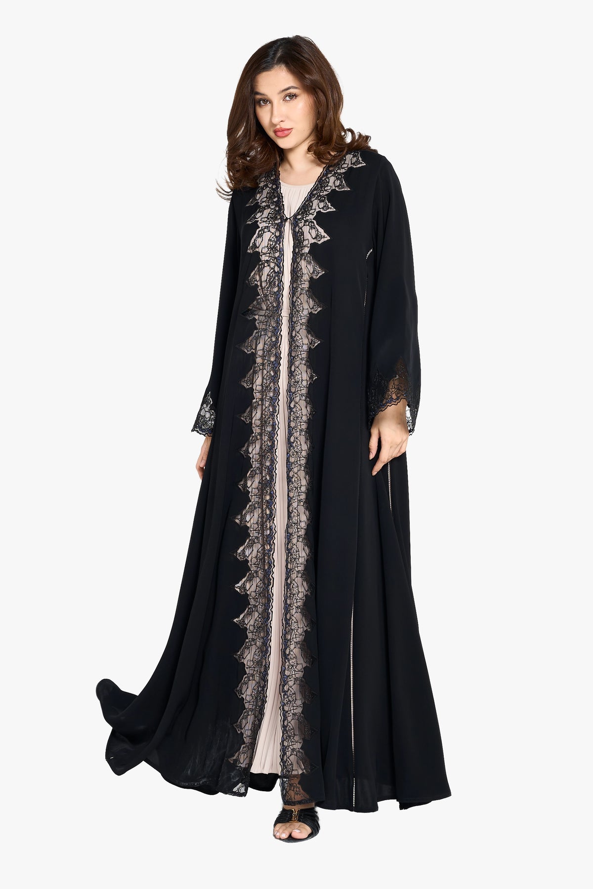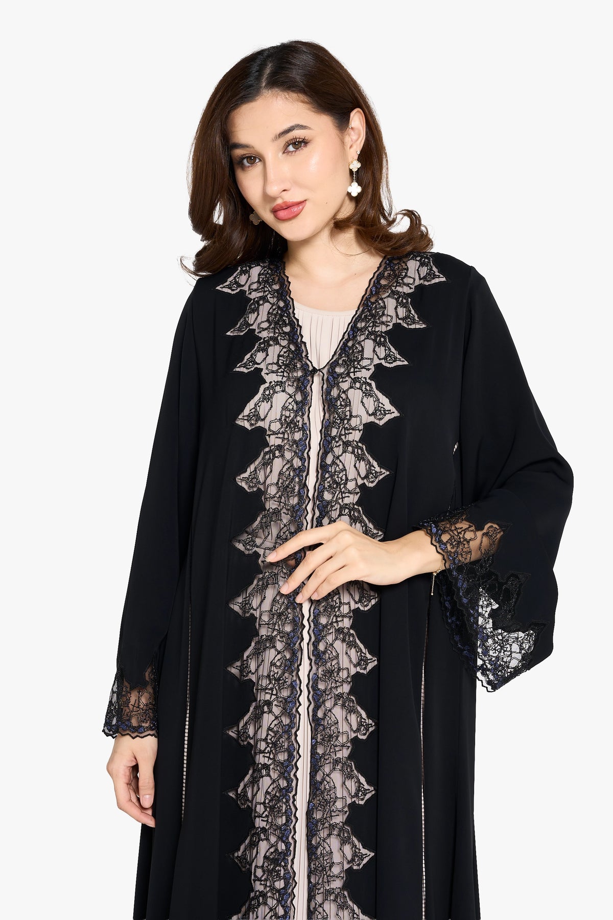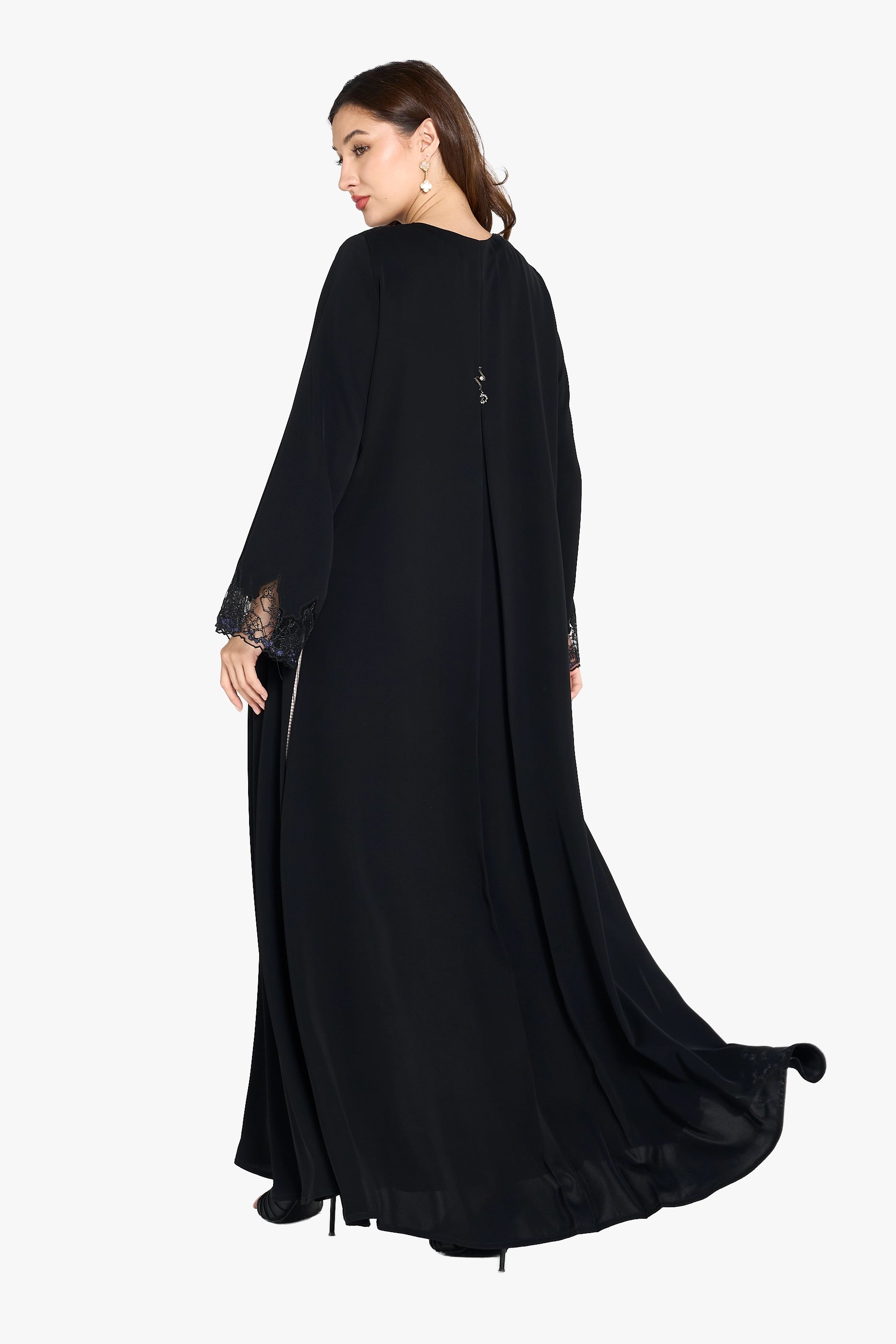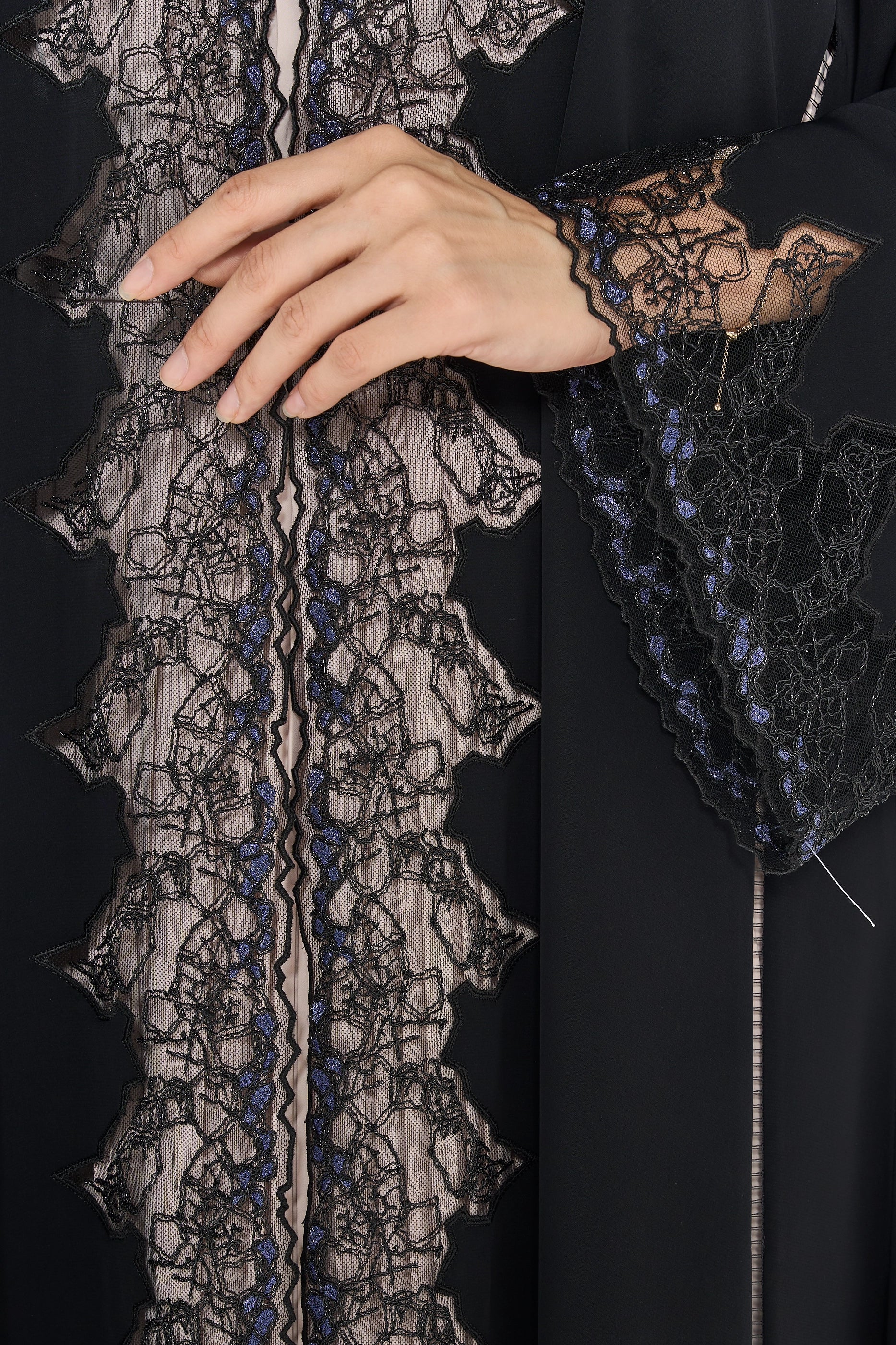 Louzan Abaya LN2388 is expertly crafted from luxurious nida fabric, featuring intricate abstract geometric dori embroidery accented with contrasting threadwork. Enhanced by delicately placed beads and crystals, this abaya offers a refined blend of contemporary design and timeless elegance, elevating modest fashion with sophisticated detail.