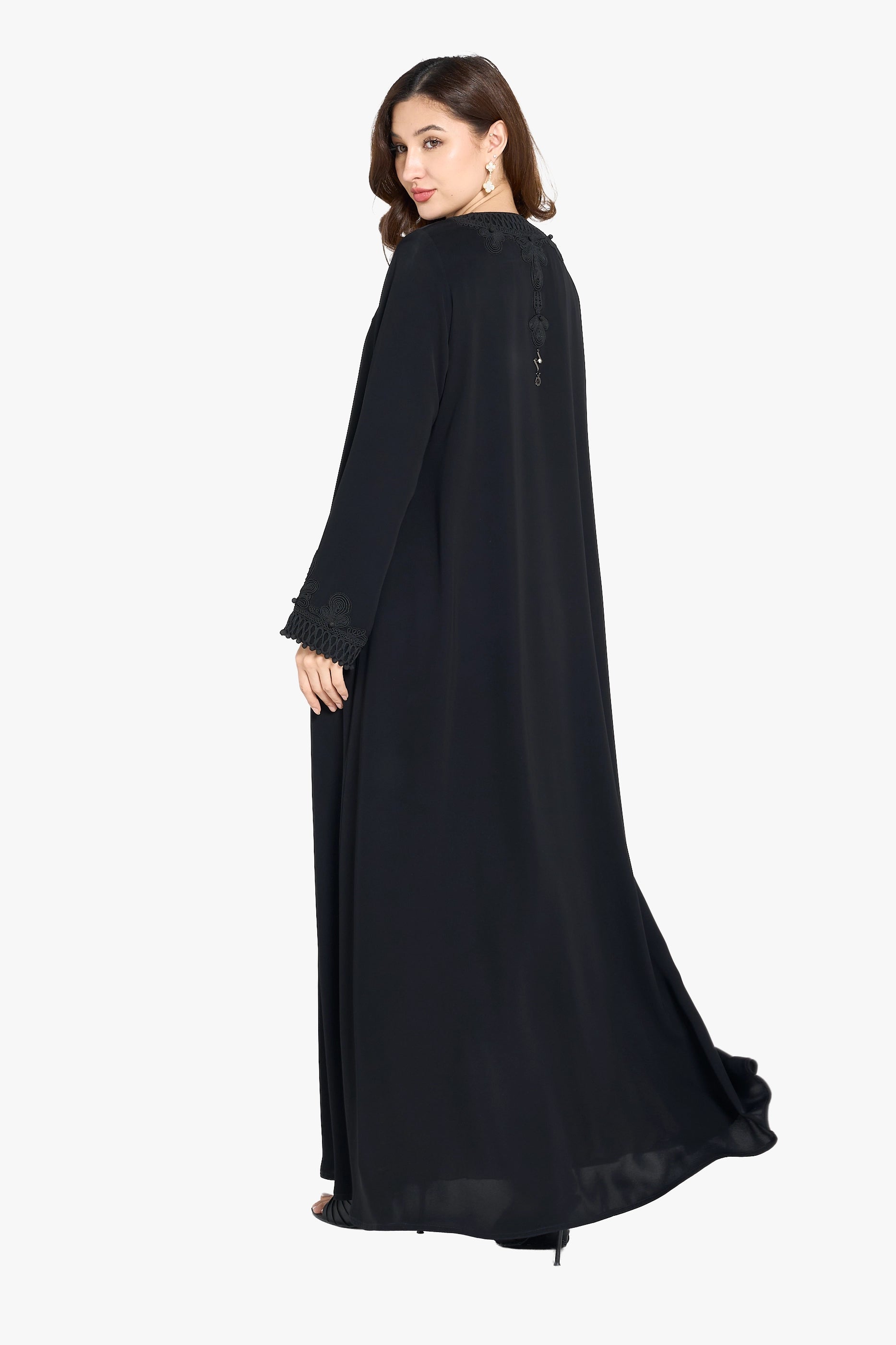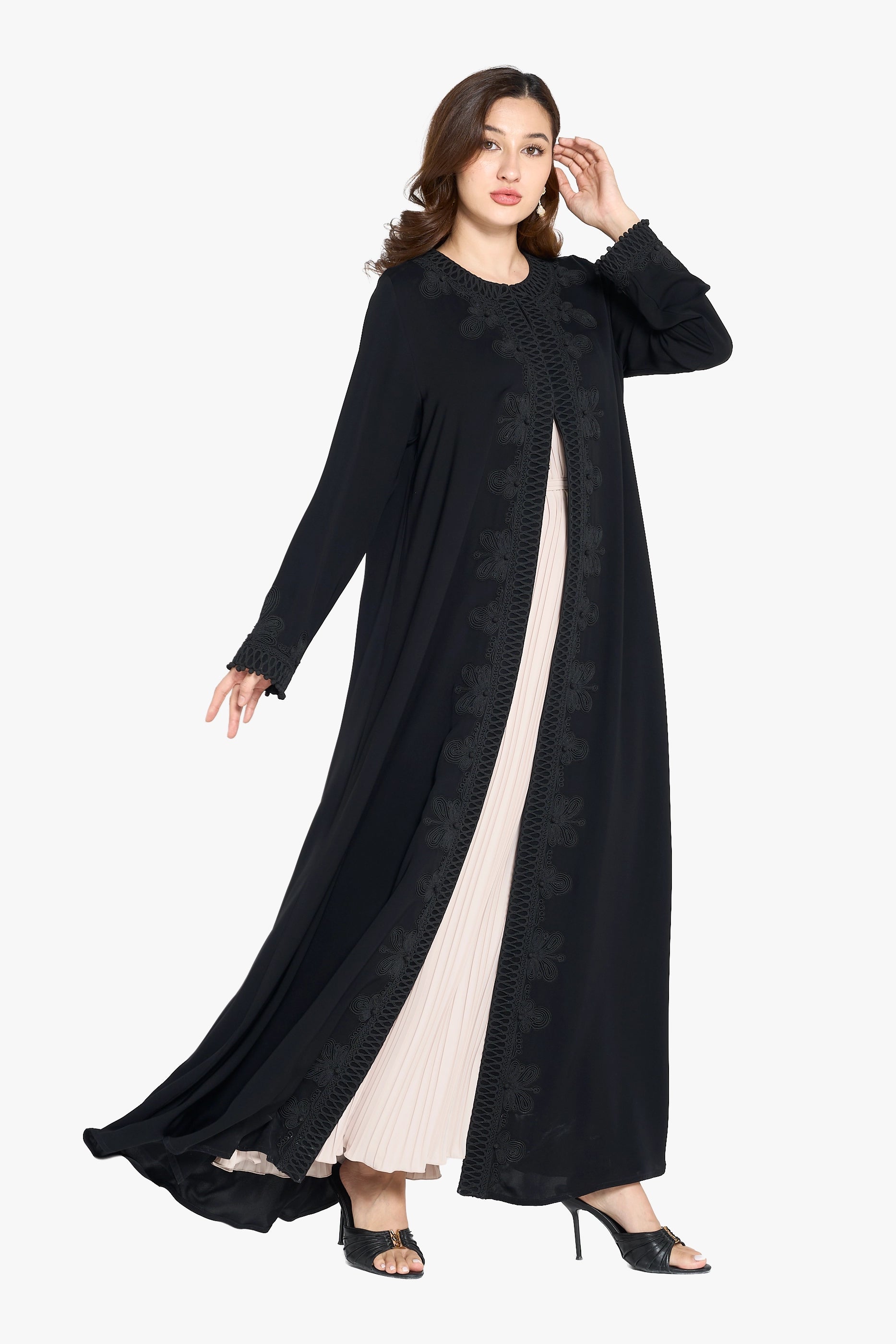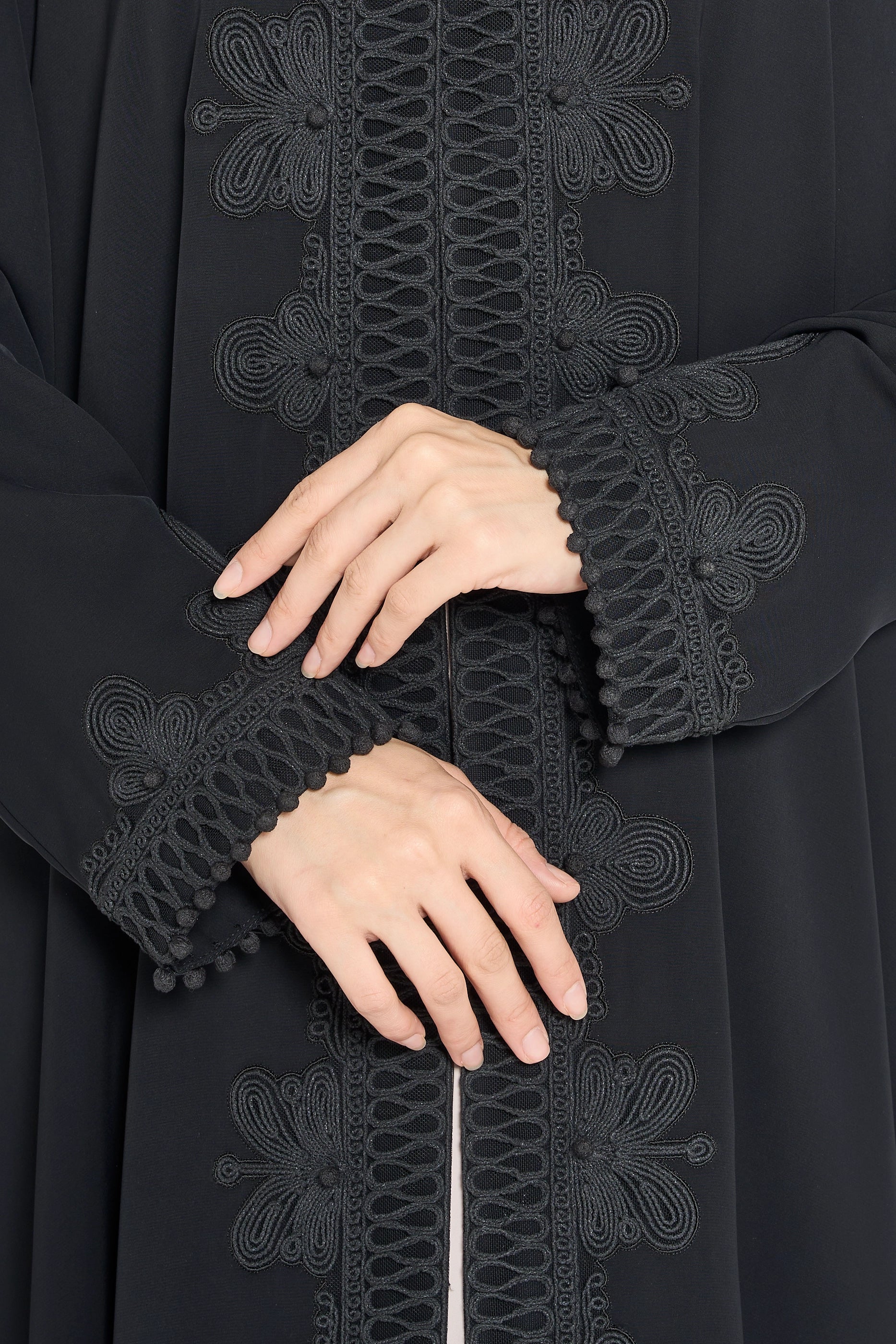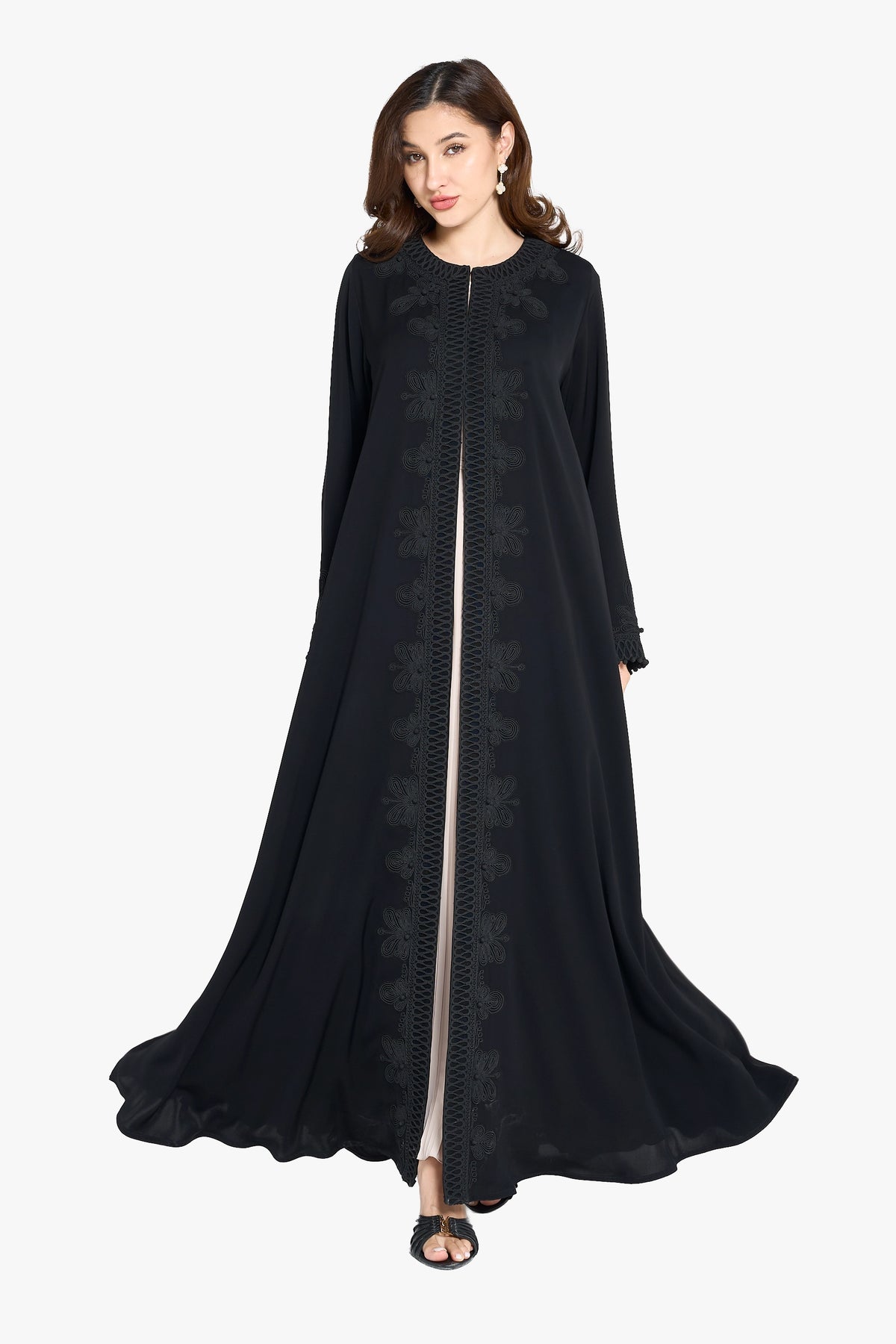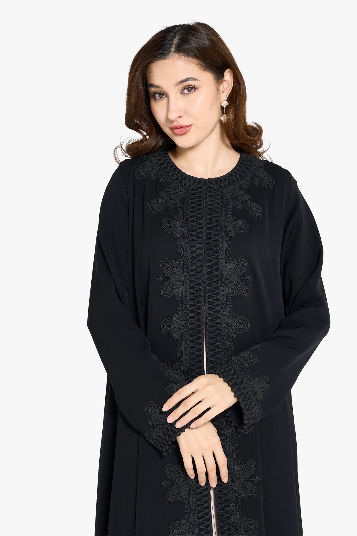 Louzan’s classic abaya is expertly crafted from soft nida fabric, ensuring a comfortable and elegant drape. Detailed with intricate baroque dori embroidery and delicate dori beadwork, it offers a refined aesthetic that elevates everyday wear. This timeless piece balances traditional craftsmanship with modern sophistication, making it a versatile addition to any wardrobe.