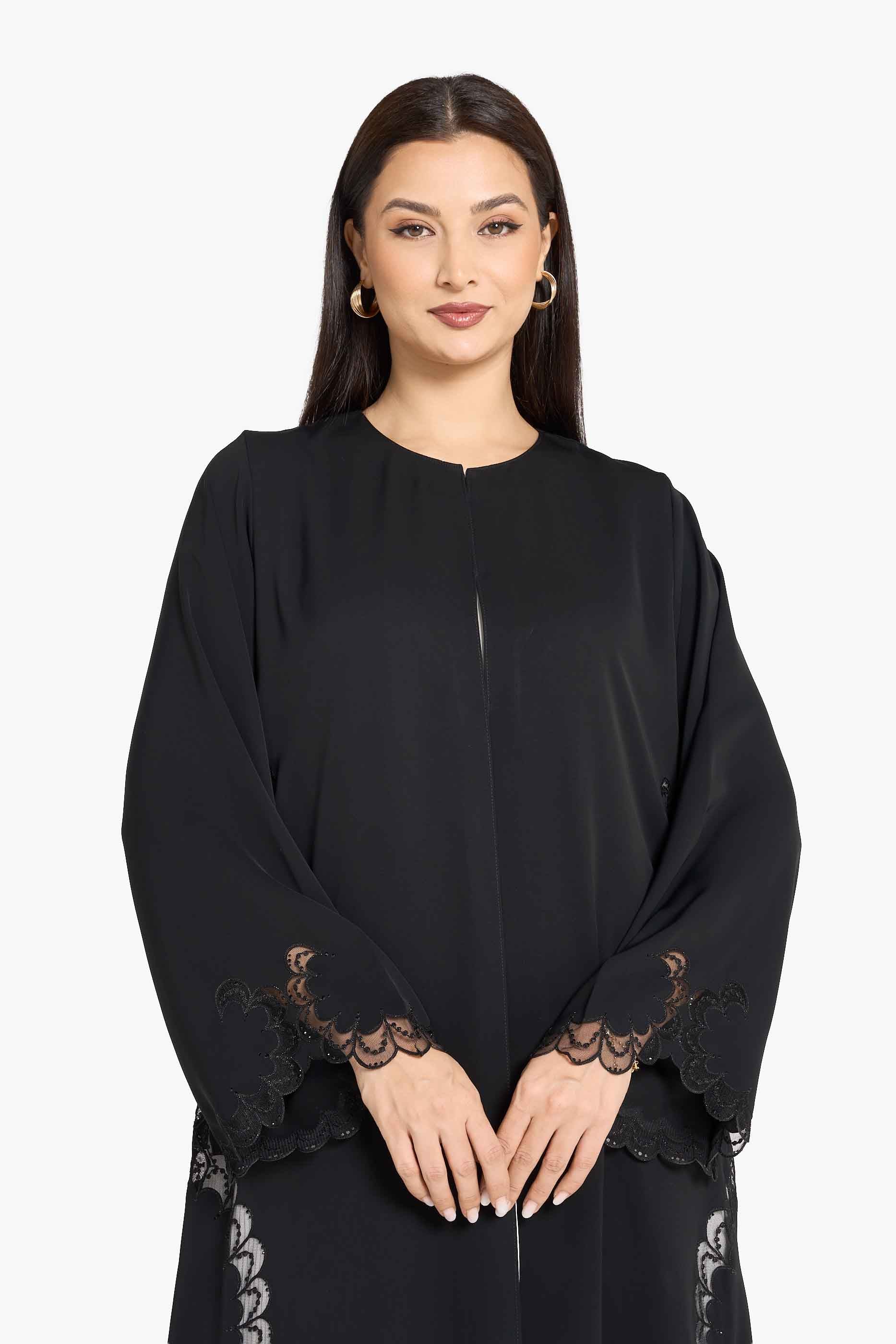 Louzan Abaya, crafted from premium nida fabric, featuring laser-cut detailing enhanced with intricate aari embroidery and delicately embellished with crystals, exuding contemporary elegance and refined sophistication.