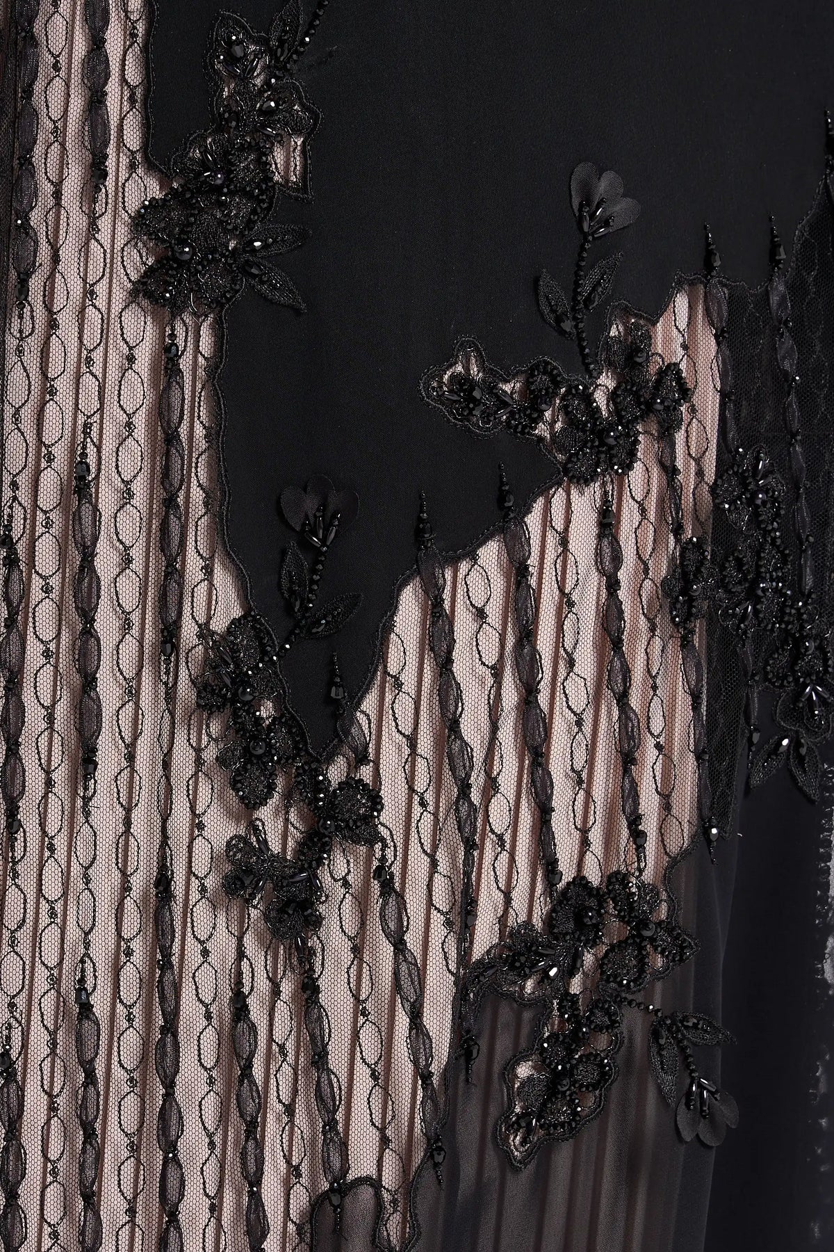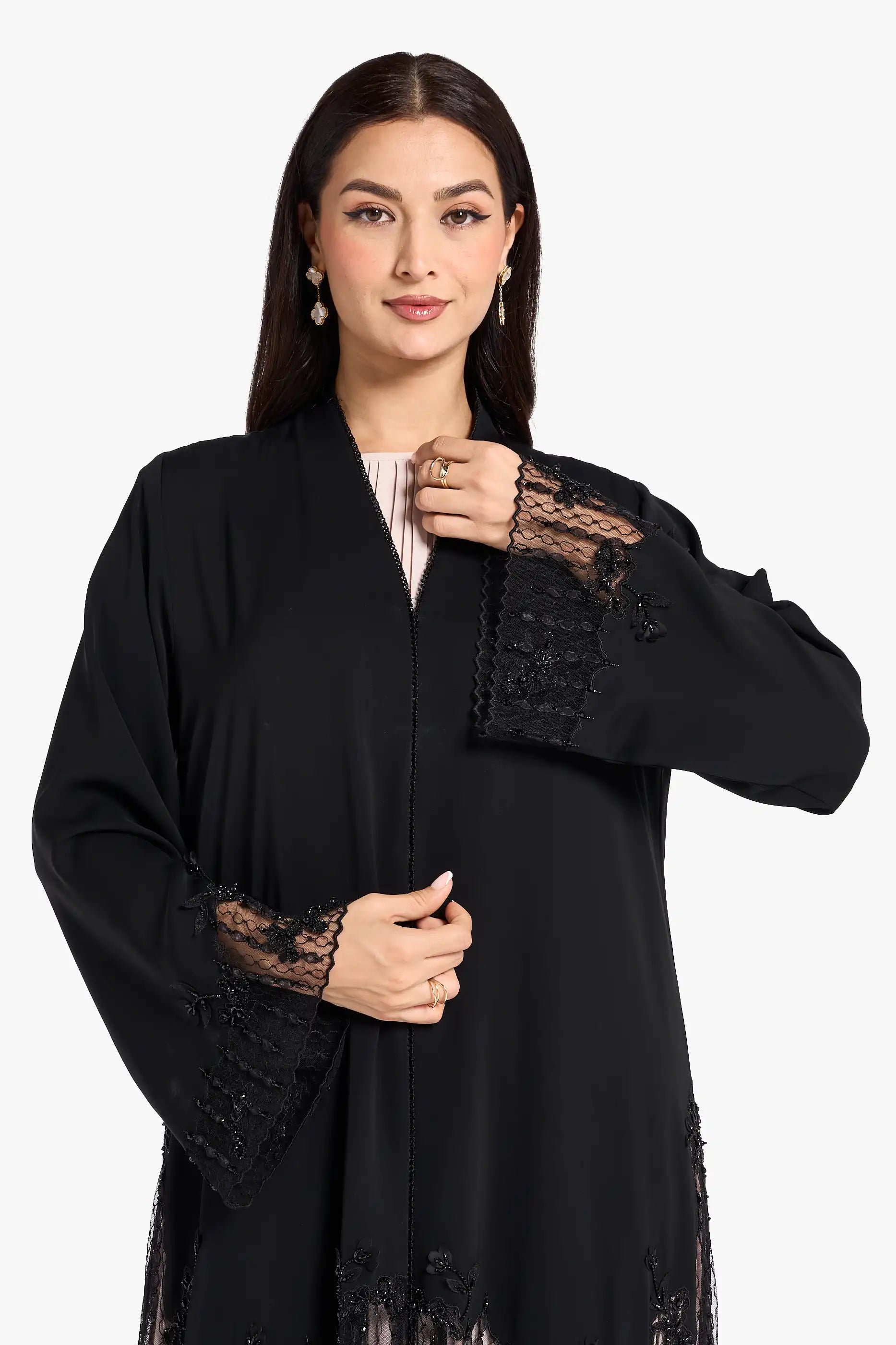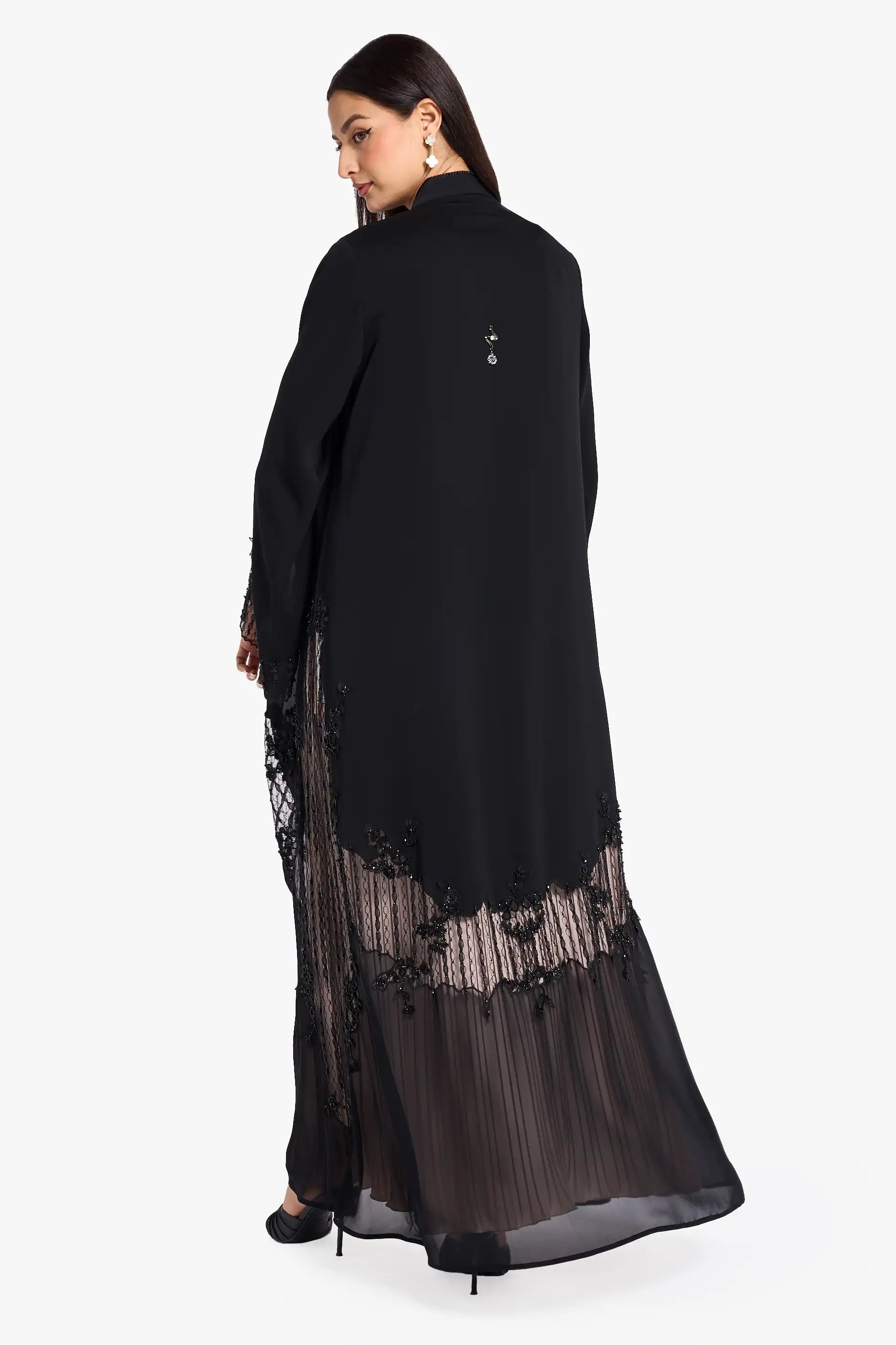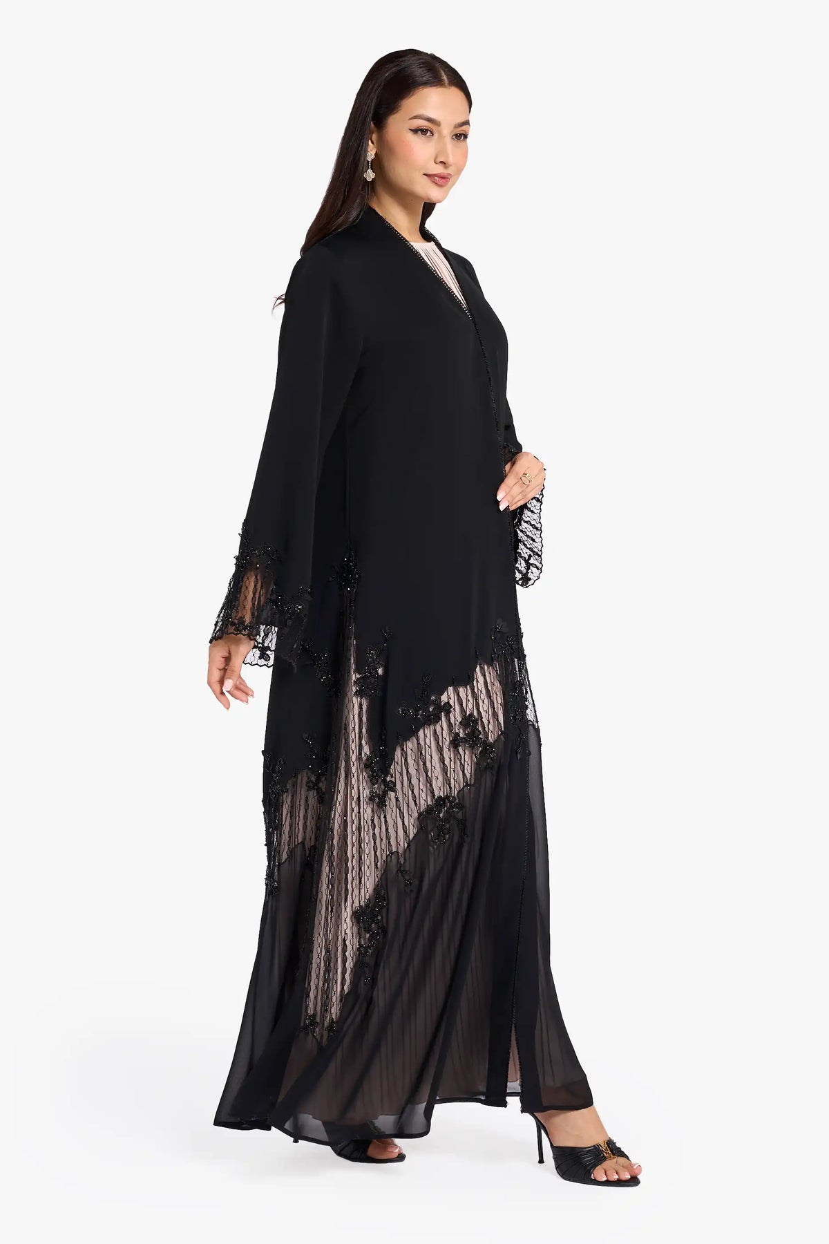 Louzan VIP abaya crafted in nida fabric with exquisite geometric dori embroidery, embellished with organza ribbons and crystals beads. A perfect blend of modesty, sophistication and contemporary flair.