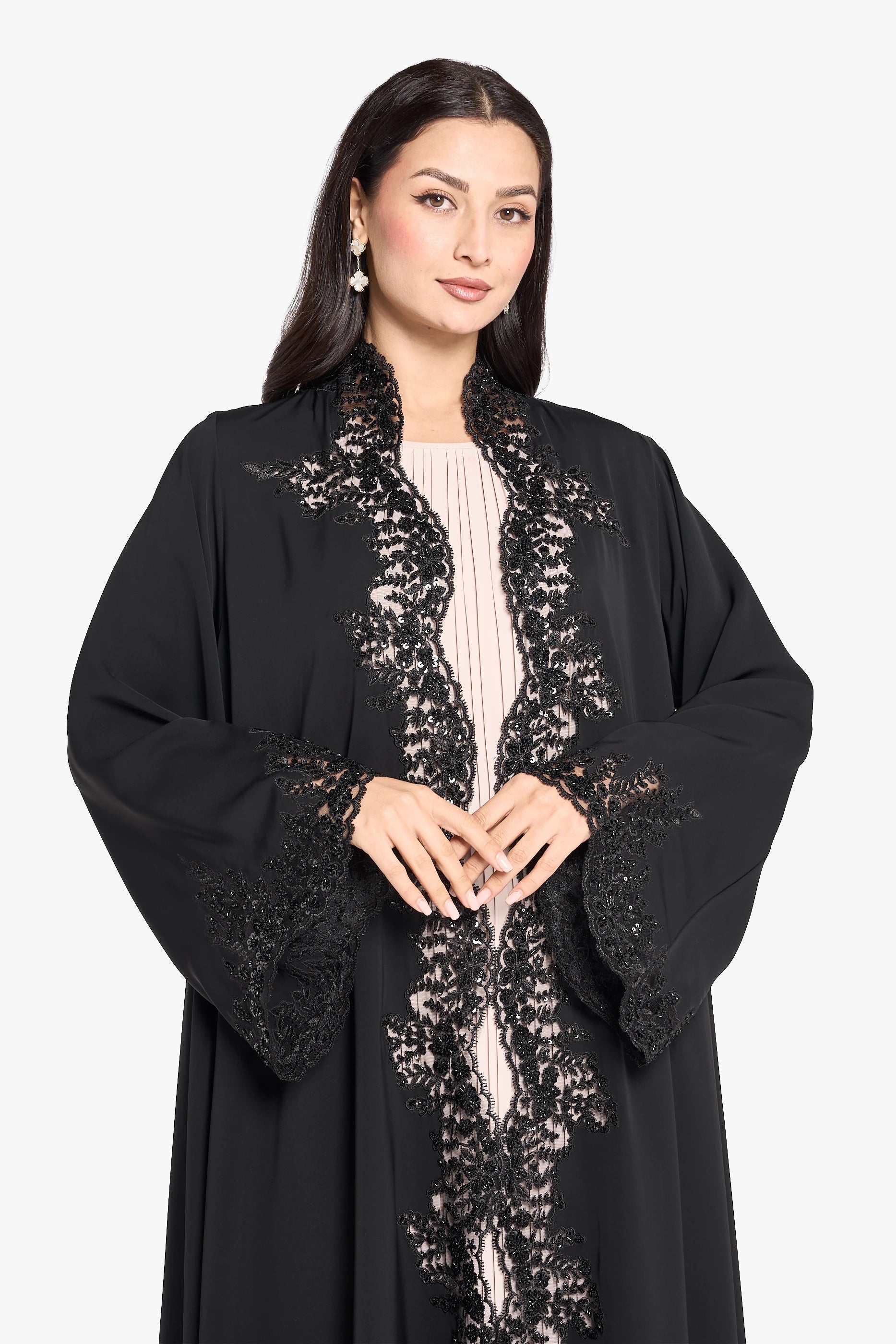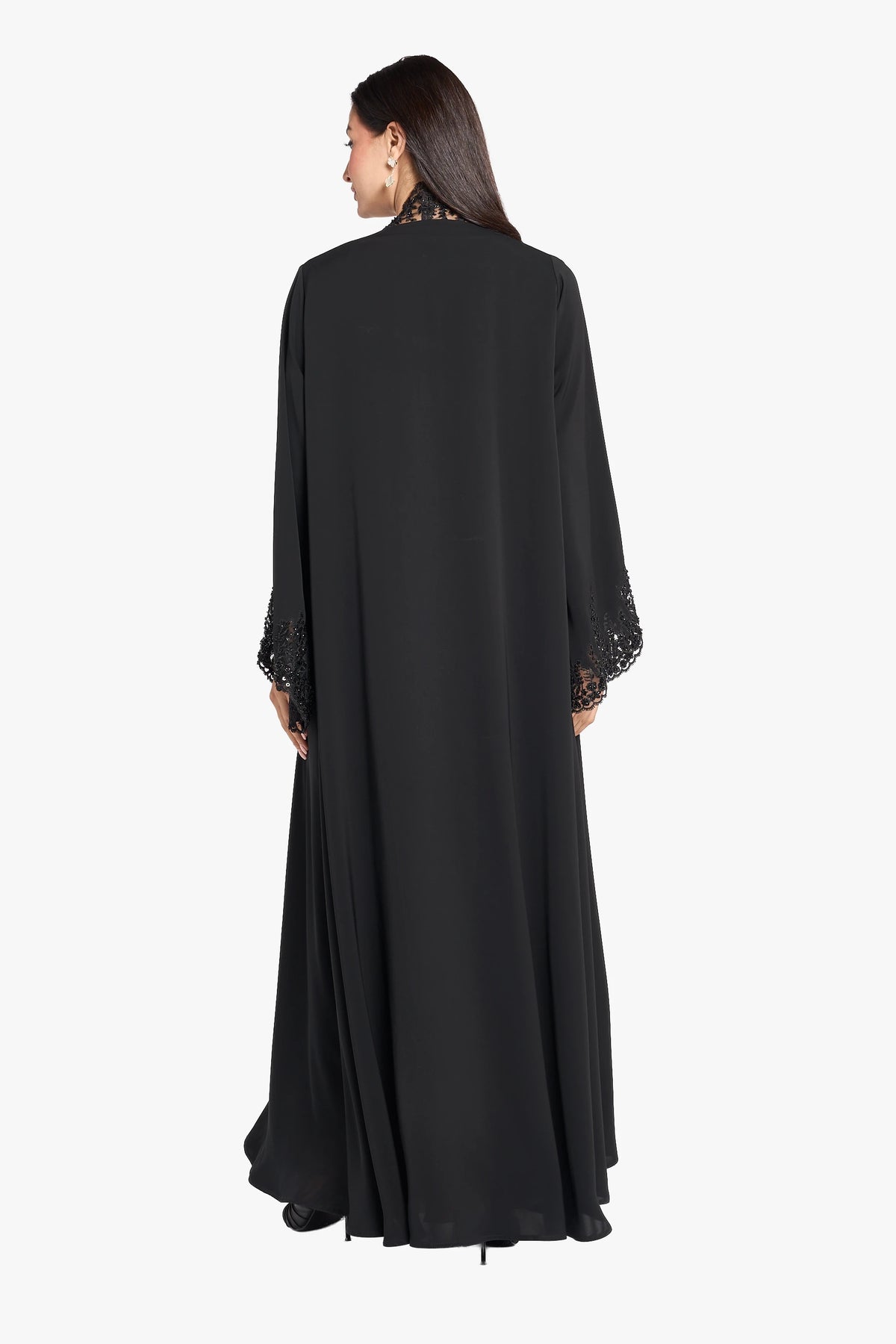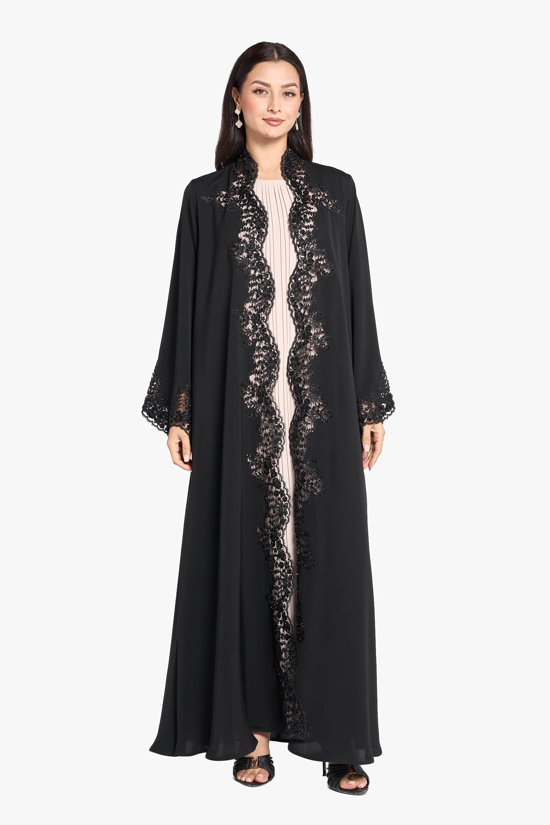 The OUSHA ABAYA merges elegance with intricate Dantel and exquisite handwork, offering a refined and timeless design. Expertly crafted, this abaya highlights delicate detailing that enhances its sophisticated silhouette, perfect for special occasions or elevated everyday wear.