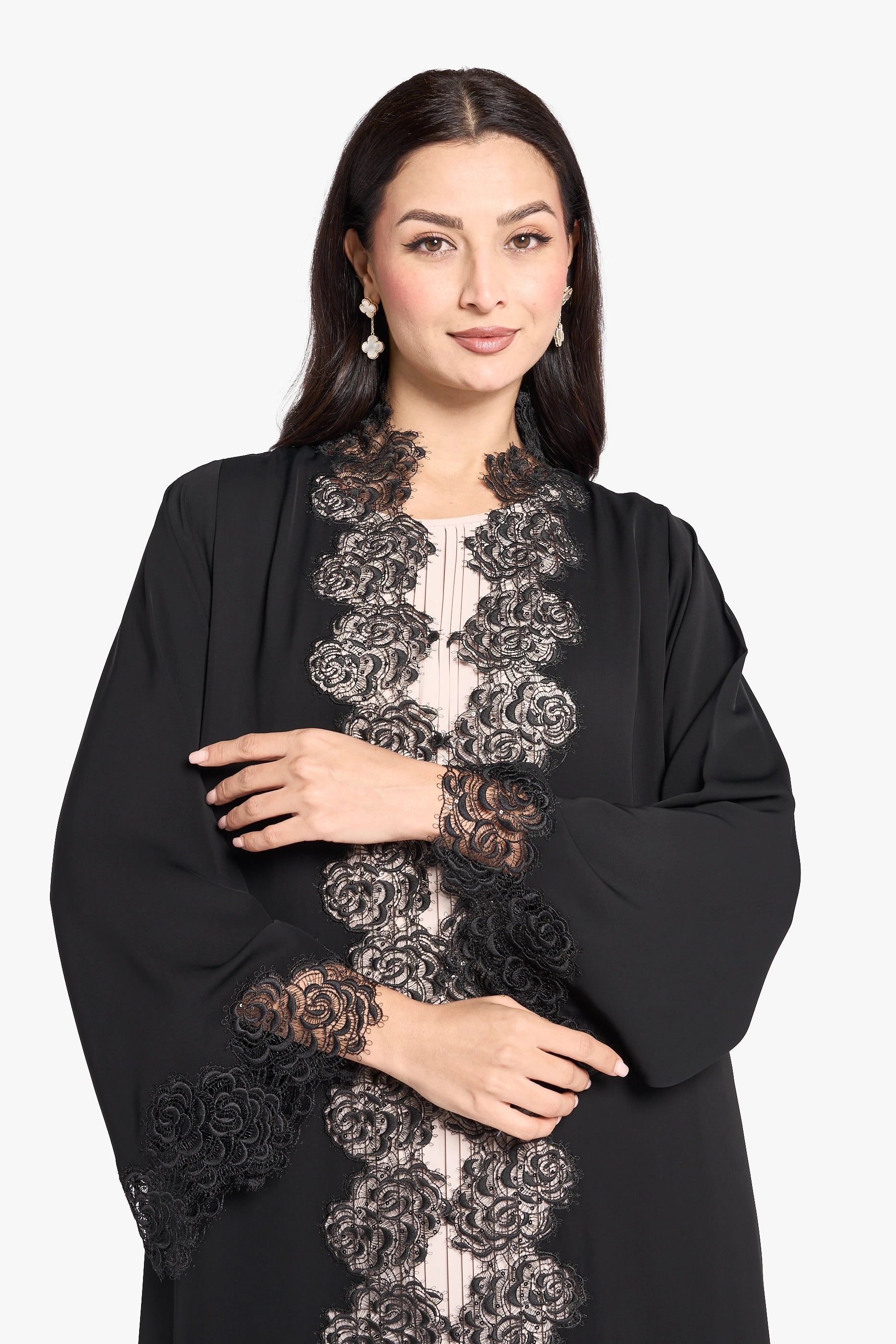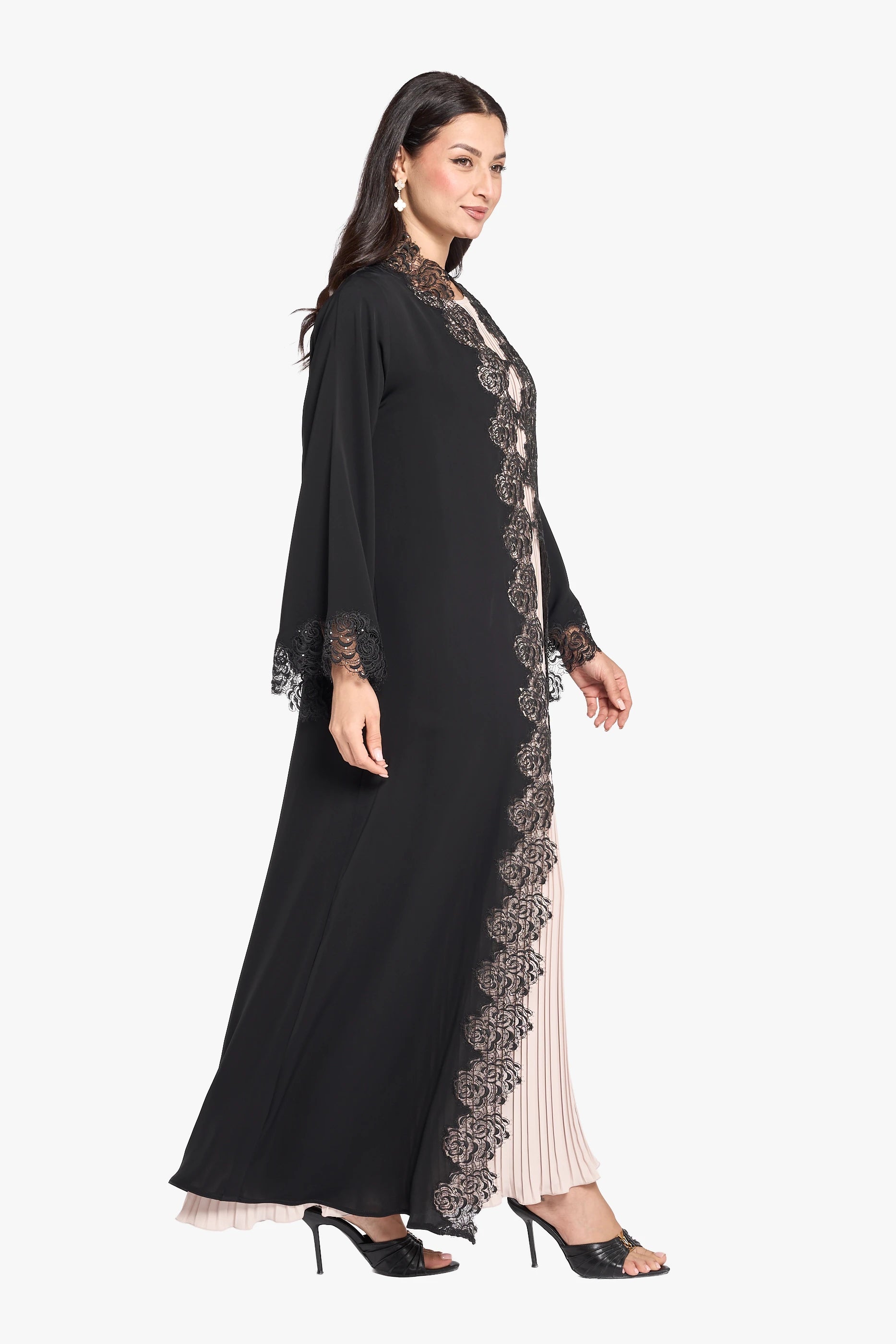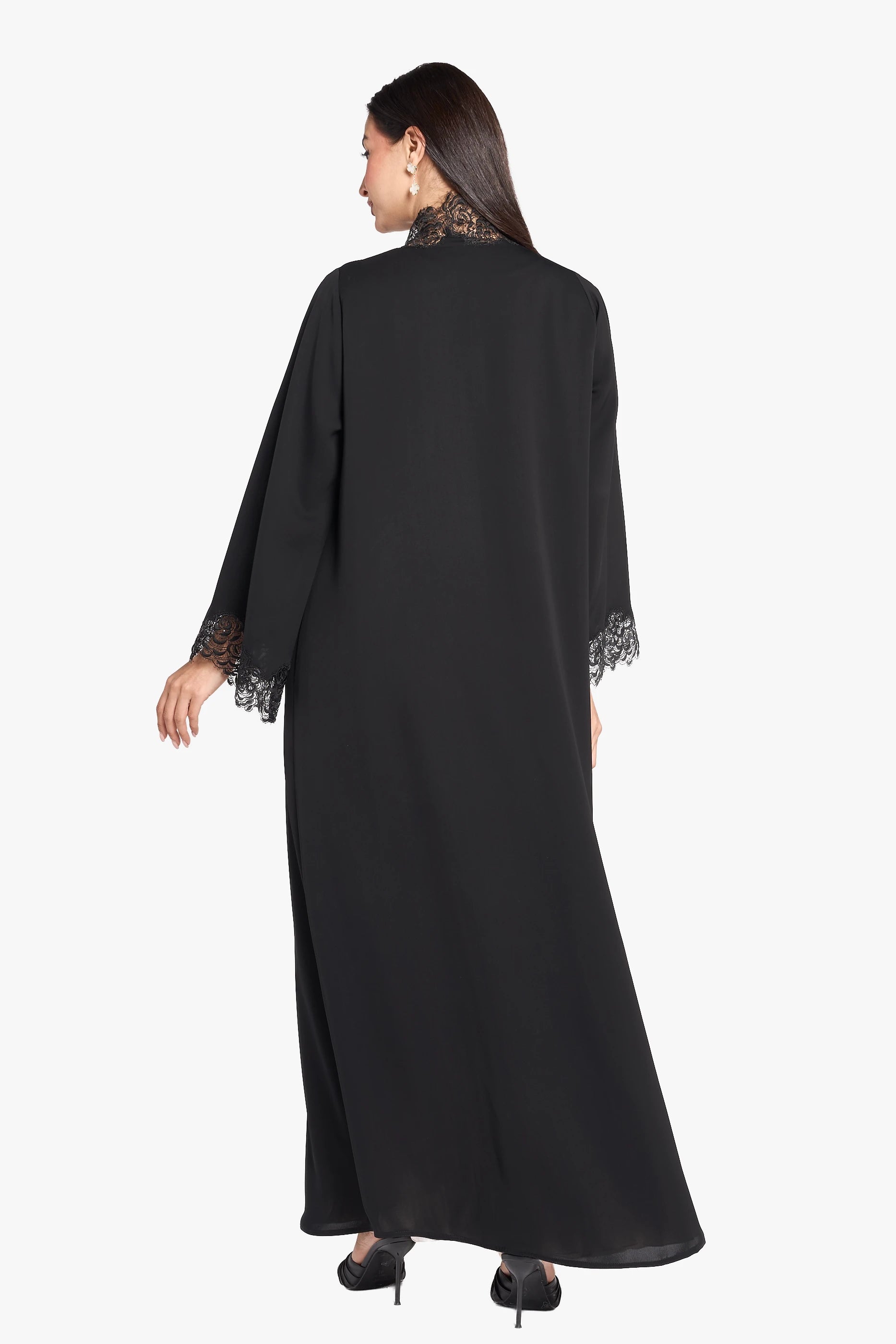 The OUSHA ABAYA merges elegance with intricate Dantel and exquisite handwork, offering a refined and timeless design. Expertly crafted, this abaya highlights delicate detailing that enhances its sophisticated silhouette, perfect for special occasions or elevated everyday wear.