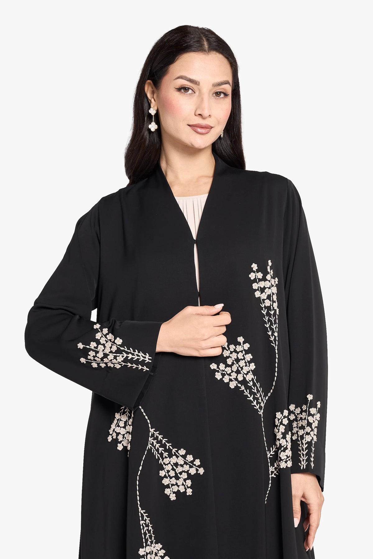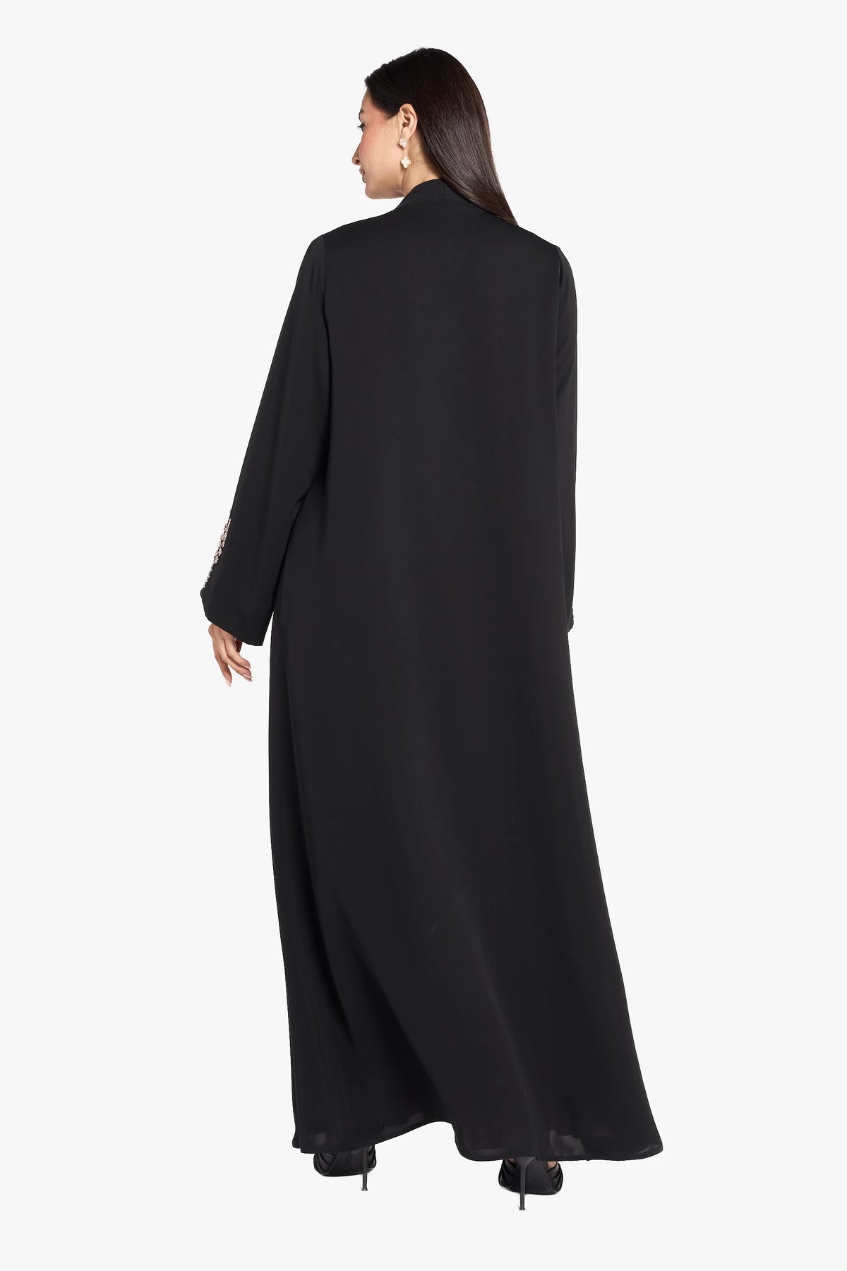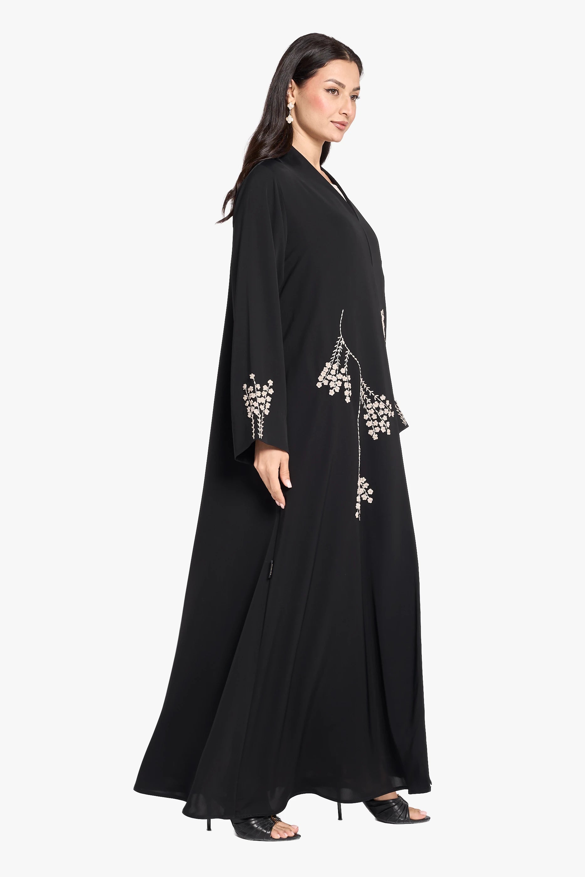 The OUSHA ABAYA exemplifies elegance with intricate embroidery along the sides and expert handwork on the sleeves. This thoughtfully crafted design combines detailed artistry with a refined silhouette, offering a sophisticated and graceful choice for formal occasions or elevated everyday wear.