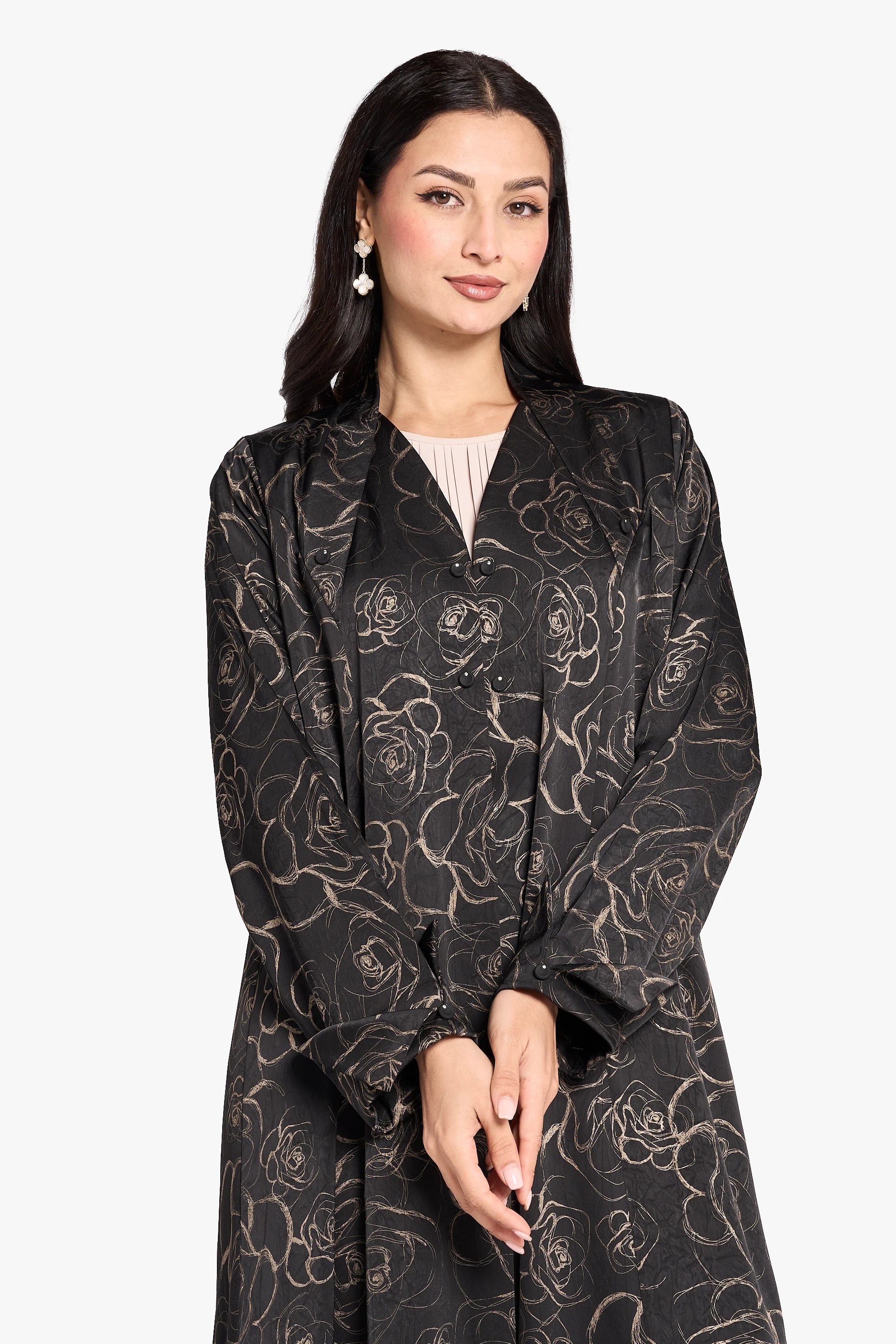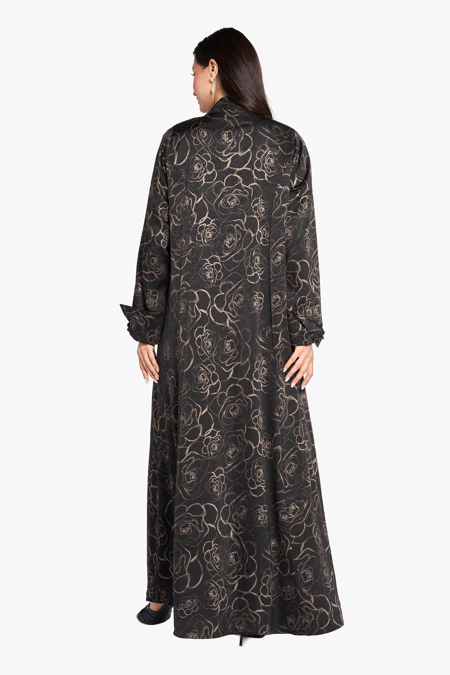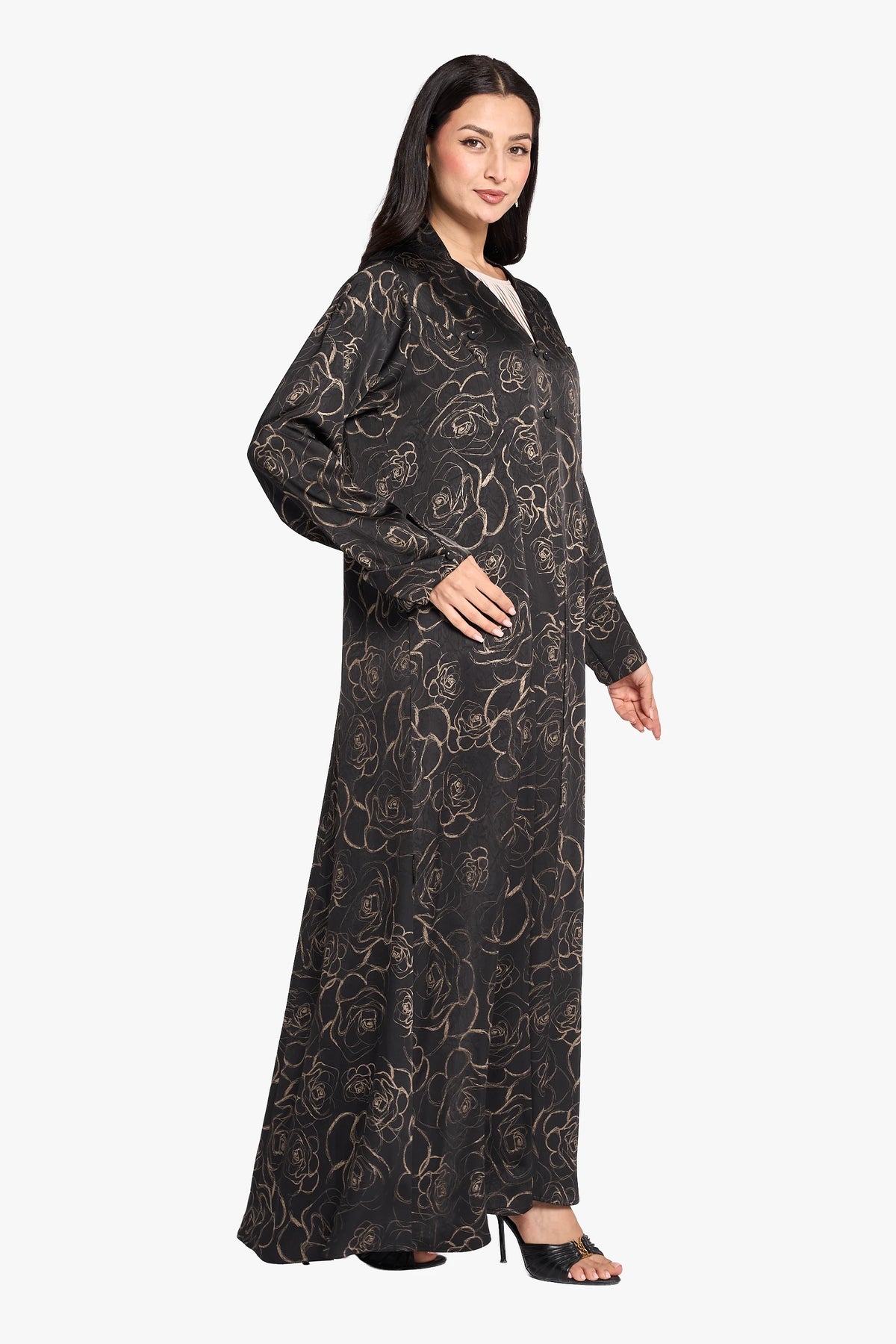 The OUSHA ABAYA showcases an A-line cut crafted from elegantly printed fabric. This design offers a flattering silhouette that drapes gracefully, combining comfort with refined style for versatile everyday wear.