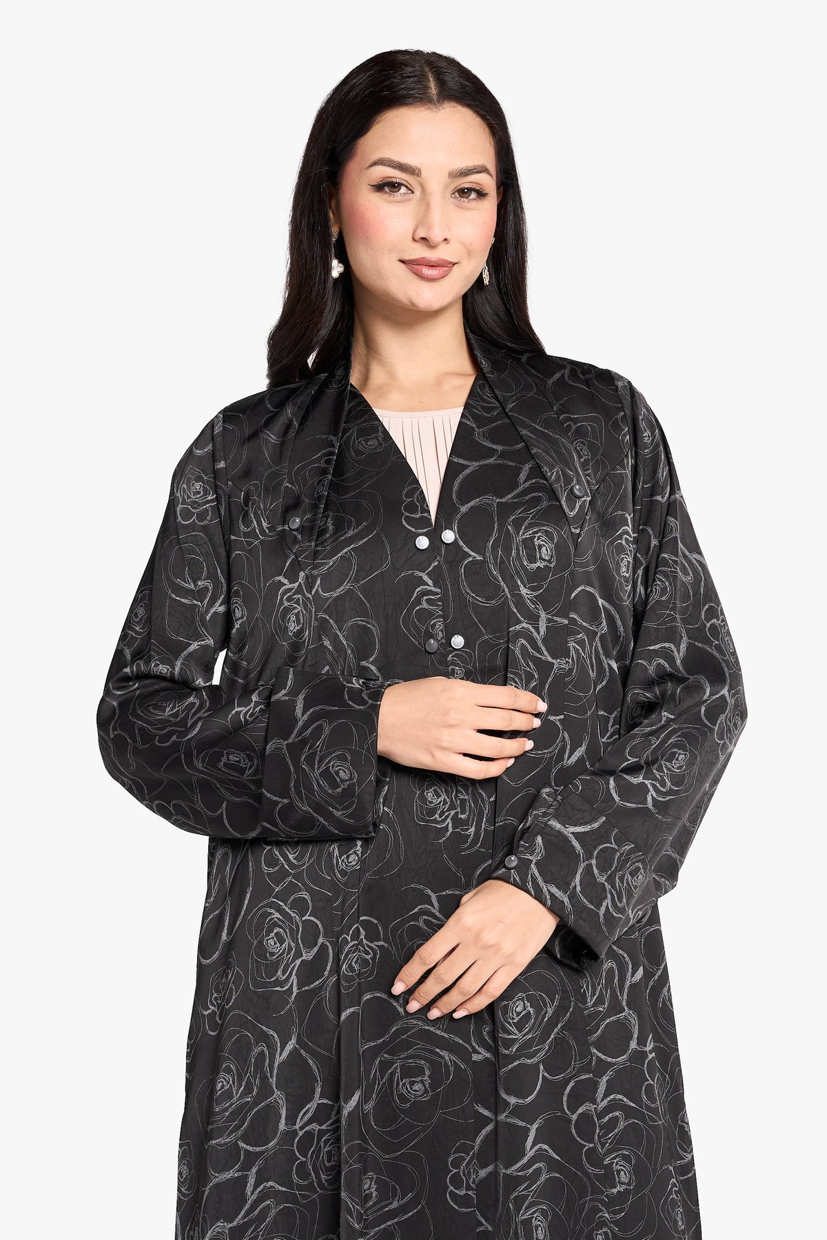 The OUSHA ABAYA features a contemporary sleeve cut designed for daily comfort and style. Expertly tailored, this abaya balances modern detailing with traditional elegance, providing a distinctive yet practical garment perfect for everyday wear.
