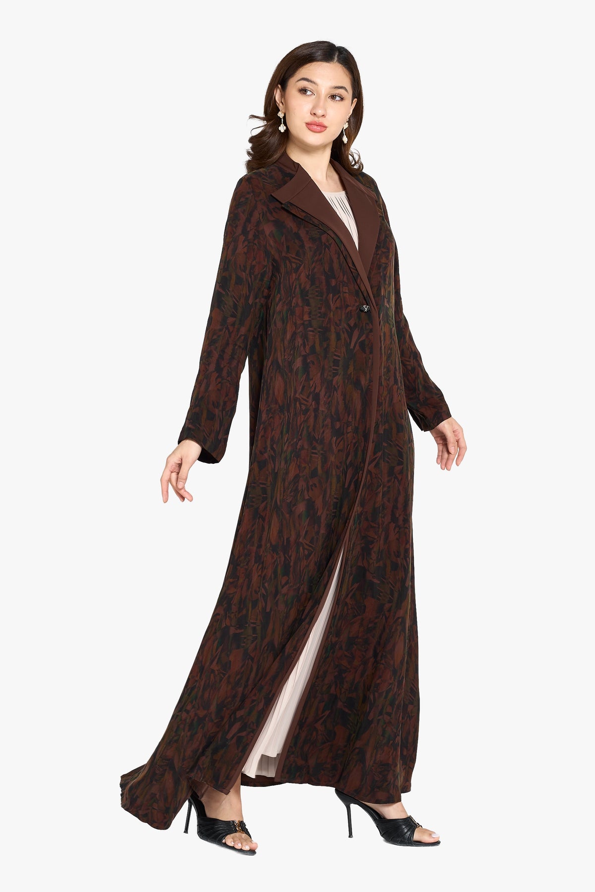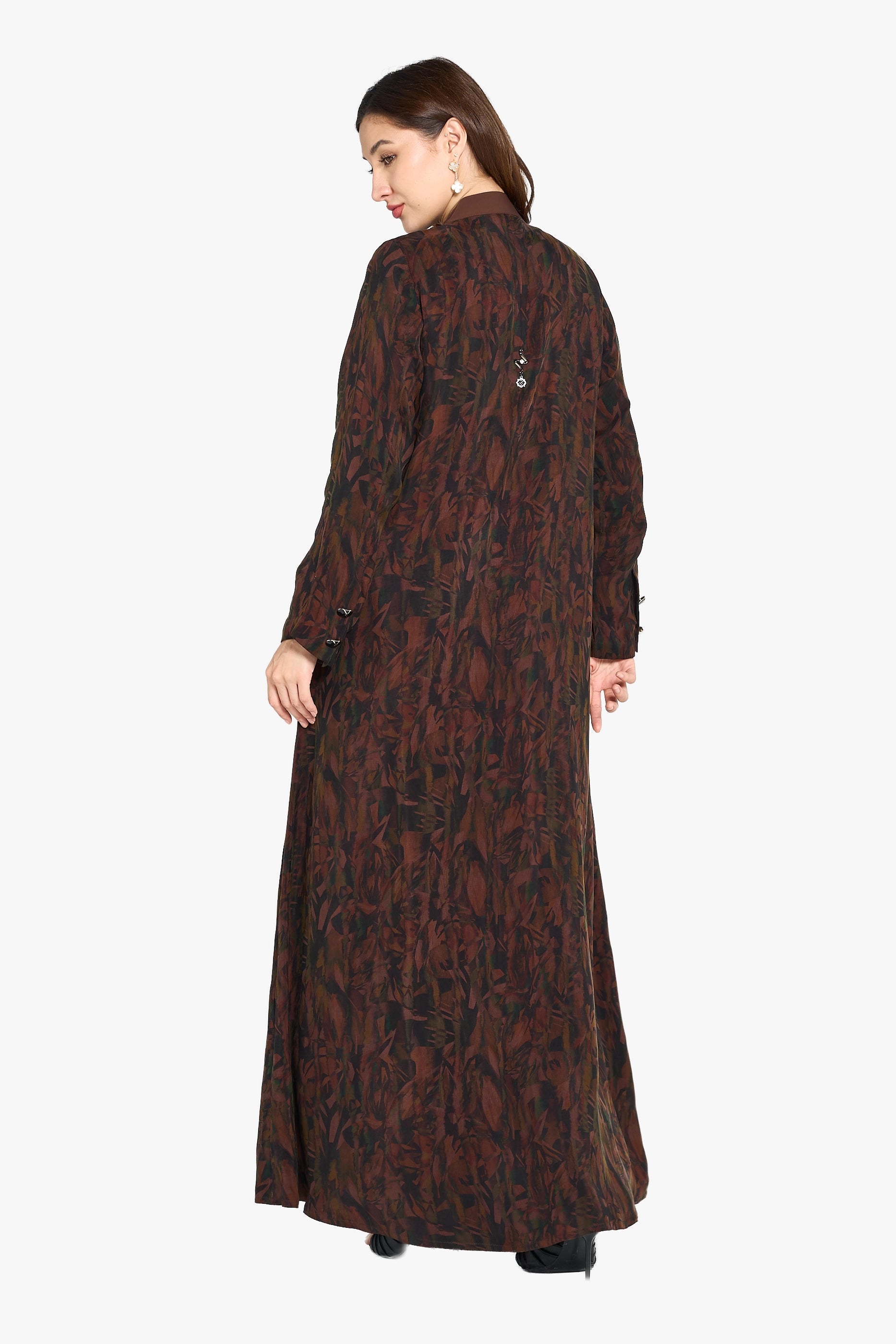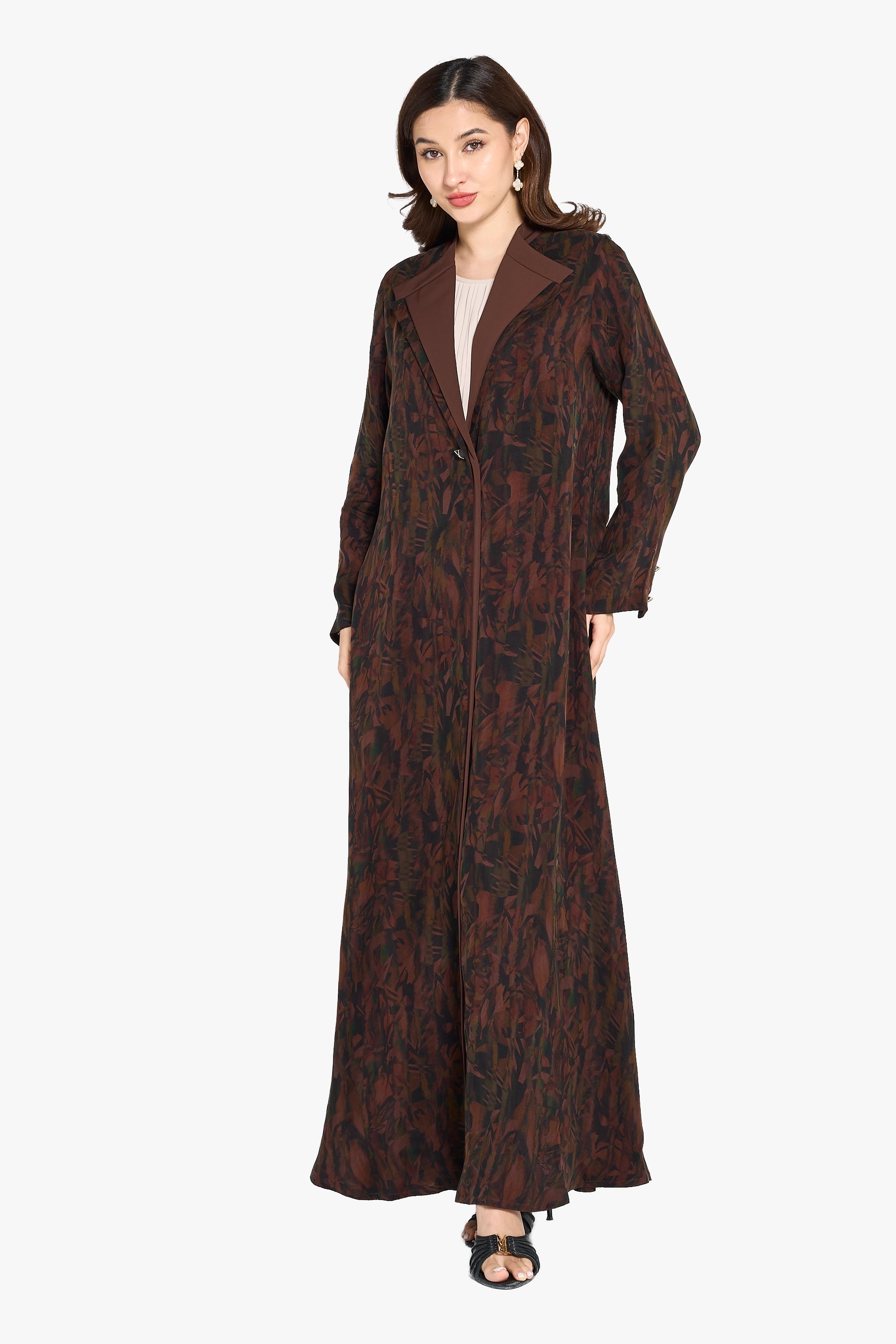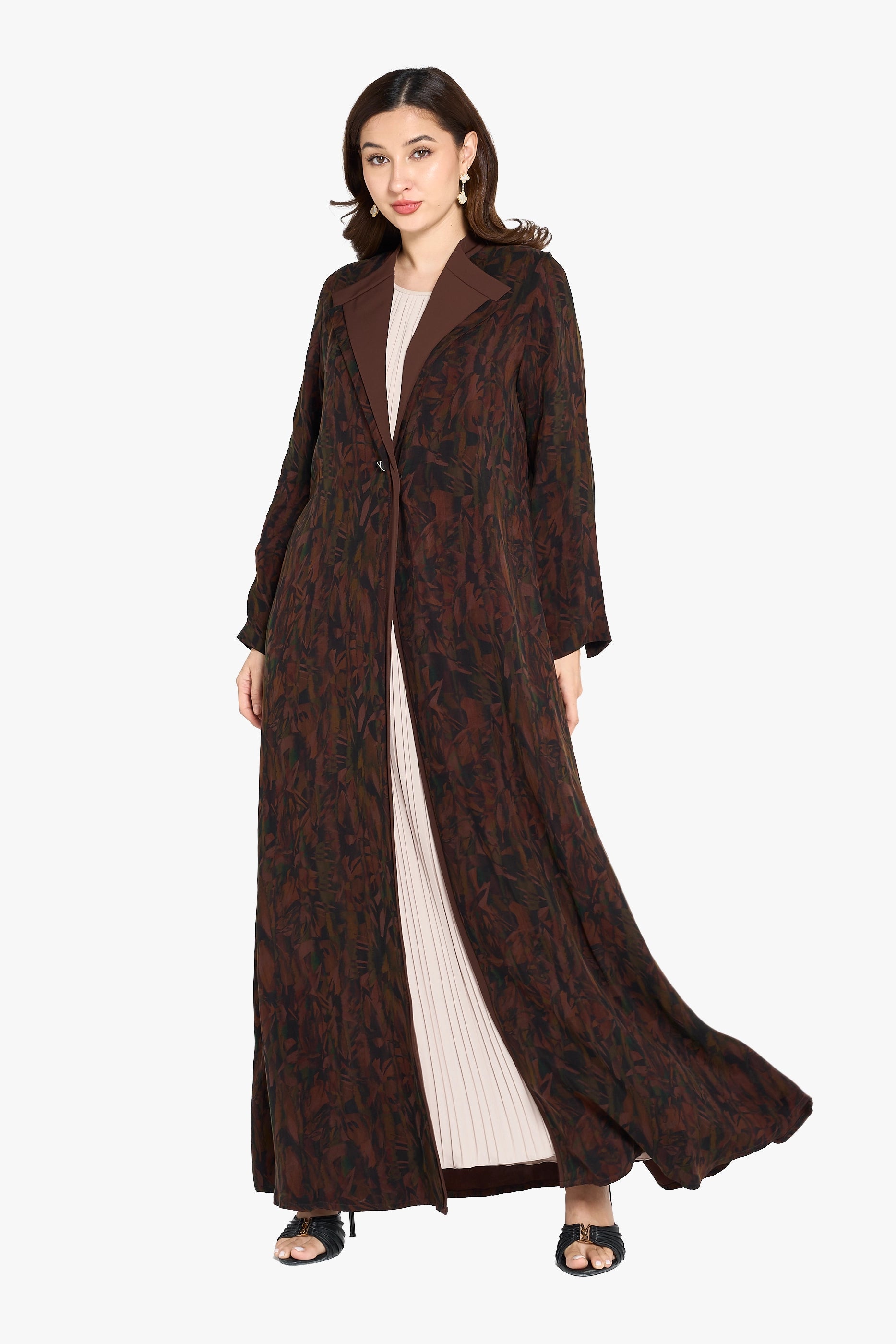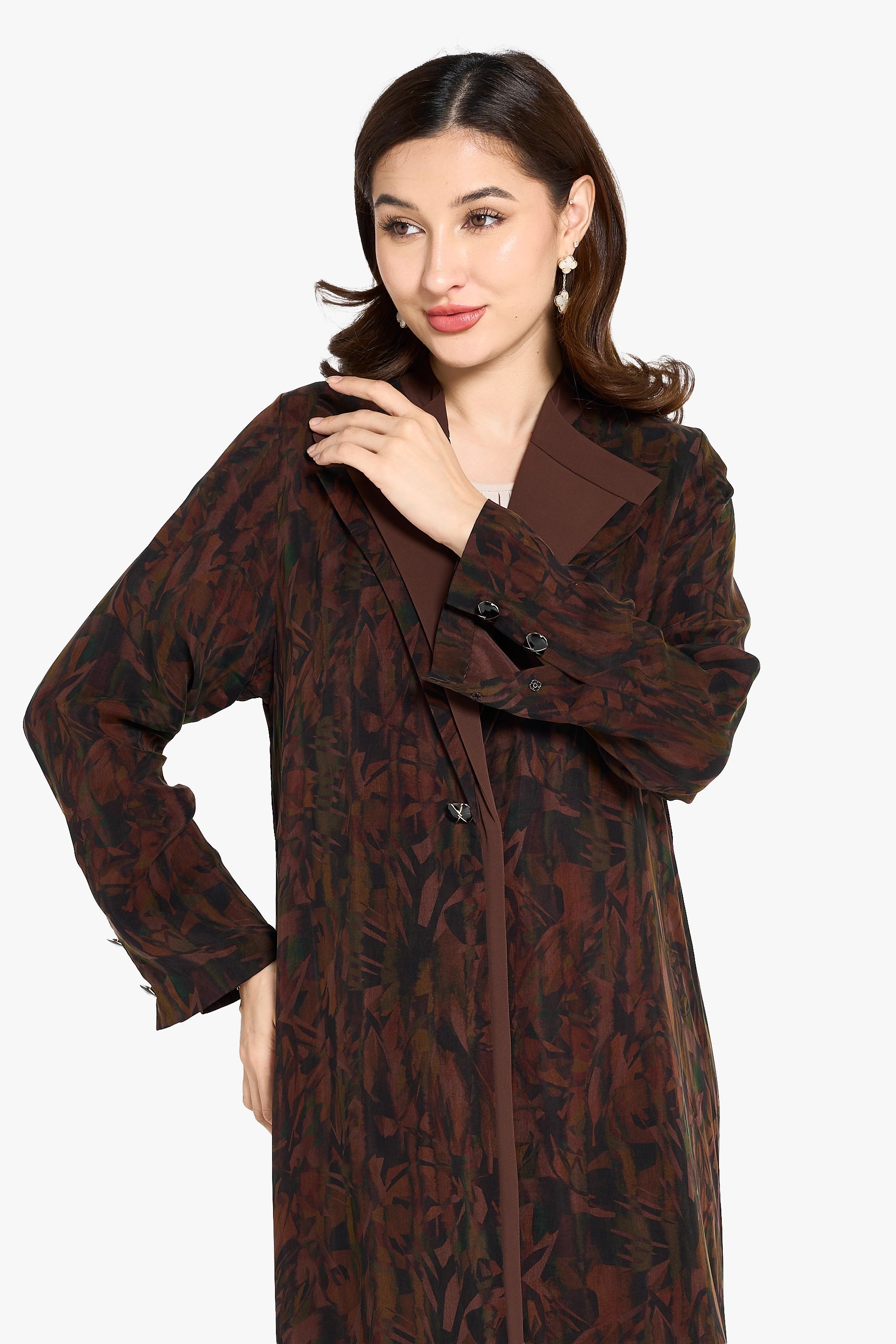 Louzan abaya showcases expert craftsmanship in a unique blend of abstract tie-dye printed soft cupro fabric, offering a lightweight and breathable feel. The contrast knotch collar in premium nida fabric adds structure and refinement, while delicate metal button accents elevate its sophisticated aesthetic. Ideal for those seeking an elegant yet comfortable garment with distinctive detailing.