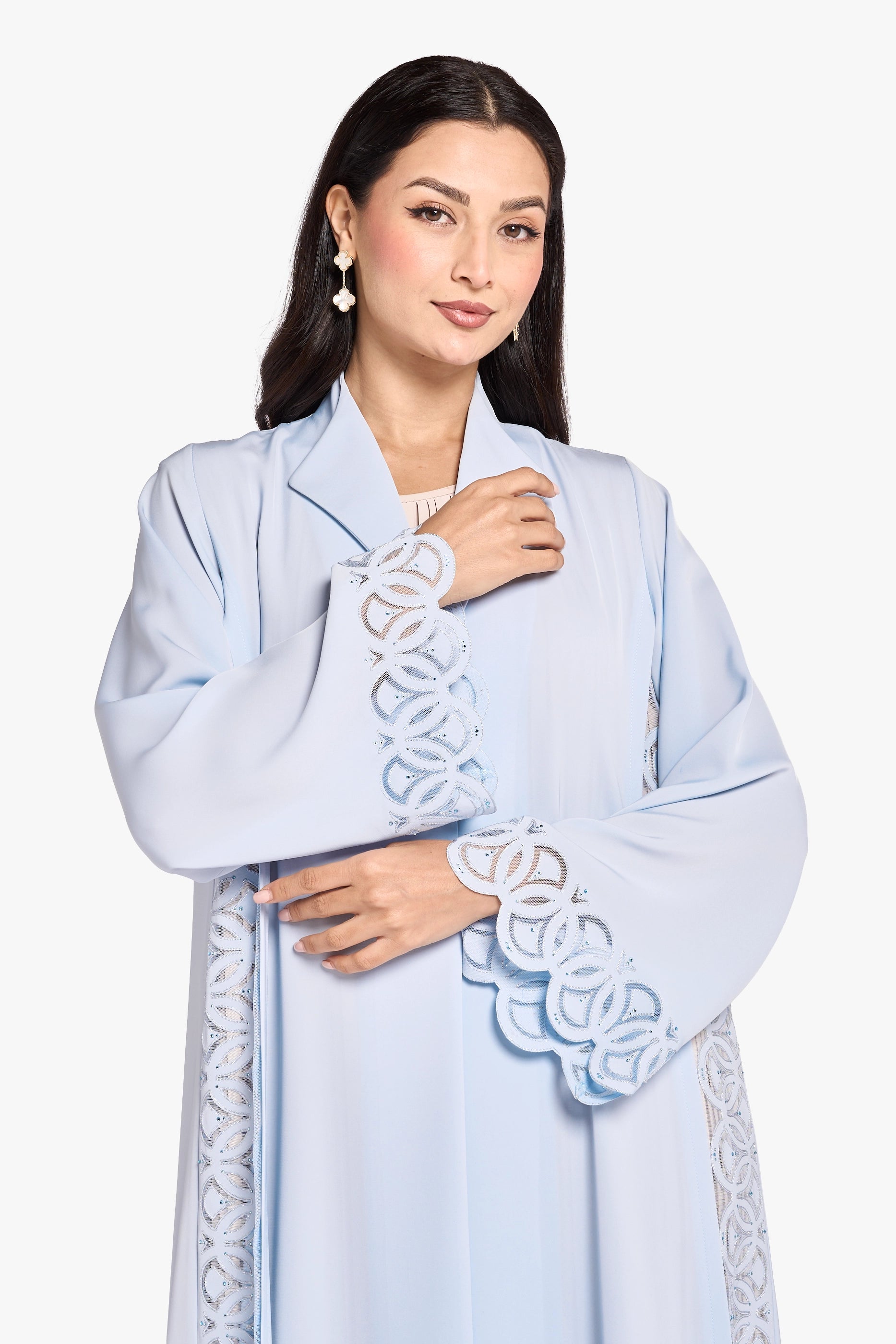 Louzan collar abaya crafted in nida fabric with intricated circular design pattern with precise laser cut detailing, enhance with delicate aari embroidery, embellished with crystals, blending modern craftsmanship with timeless elegance.