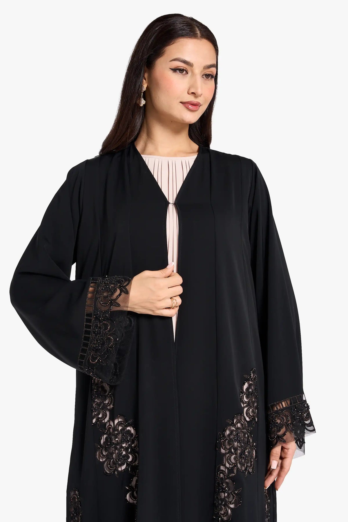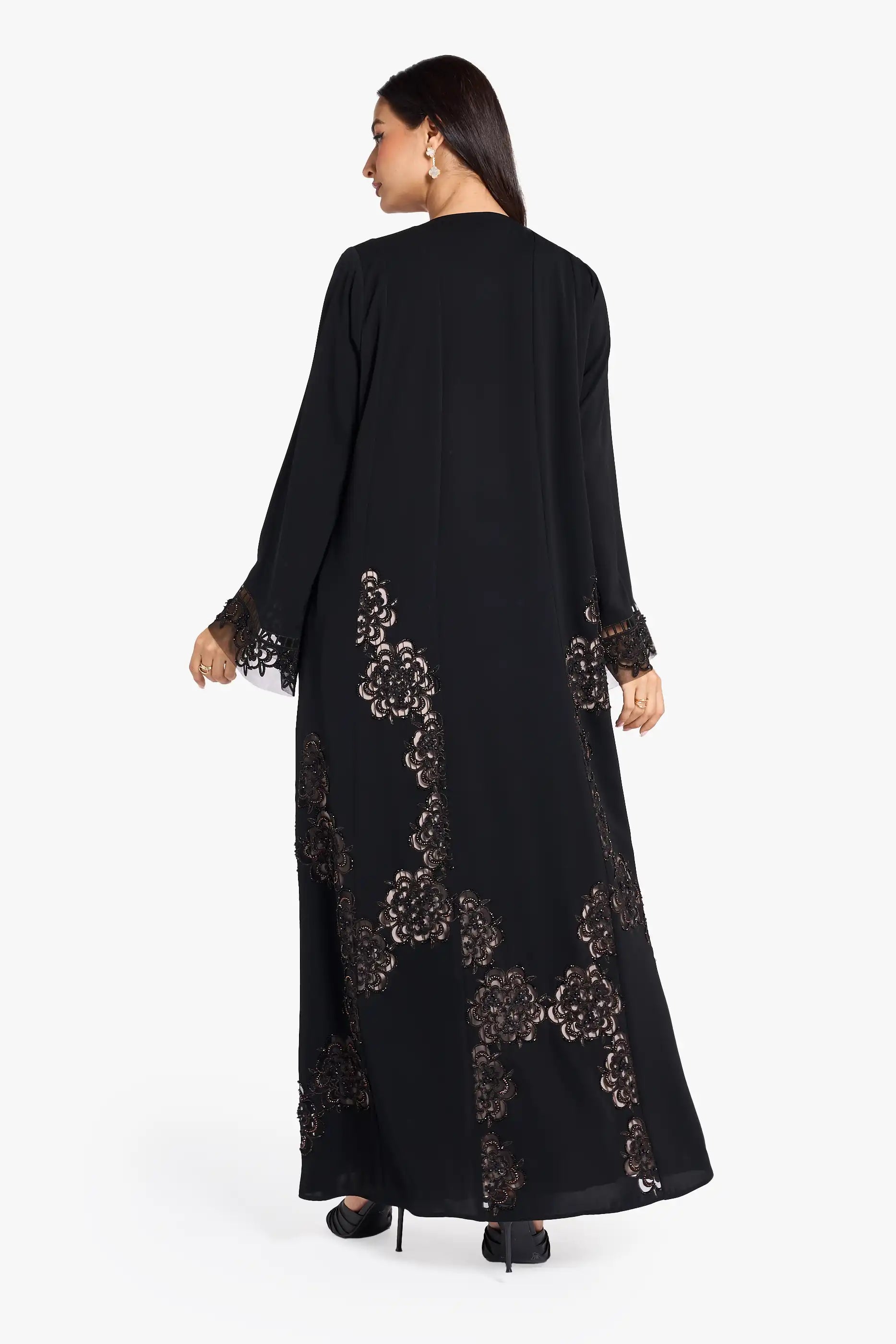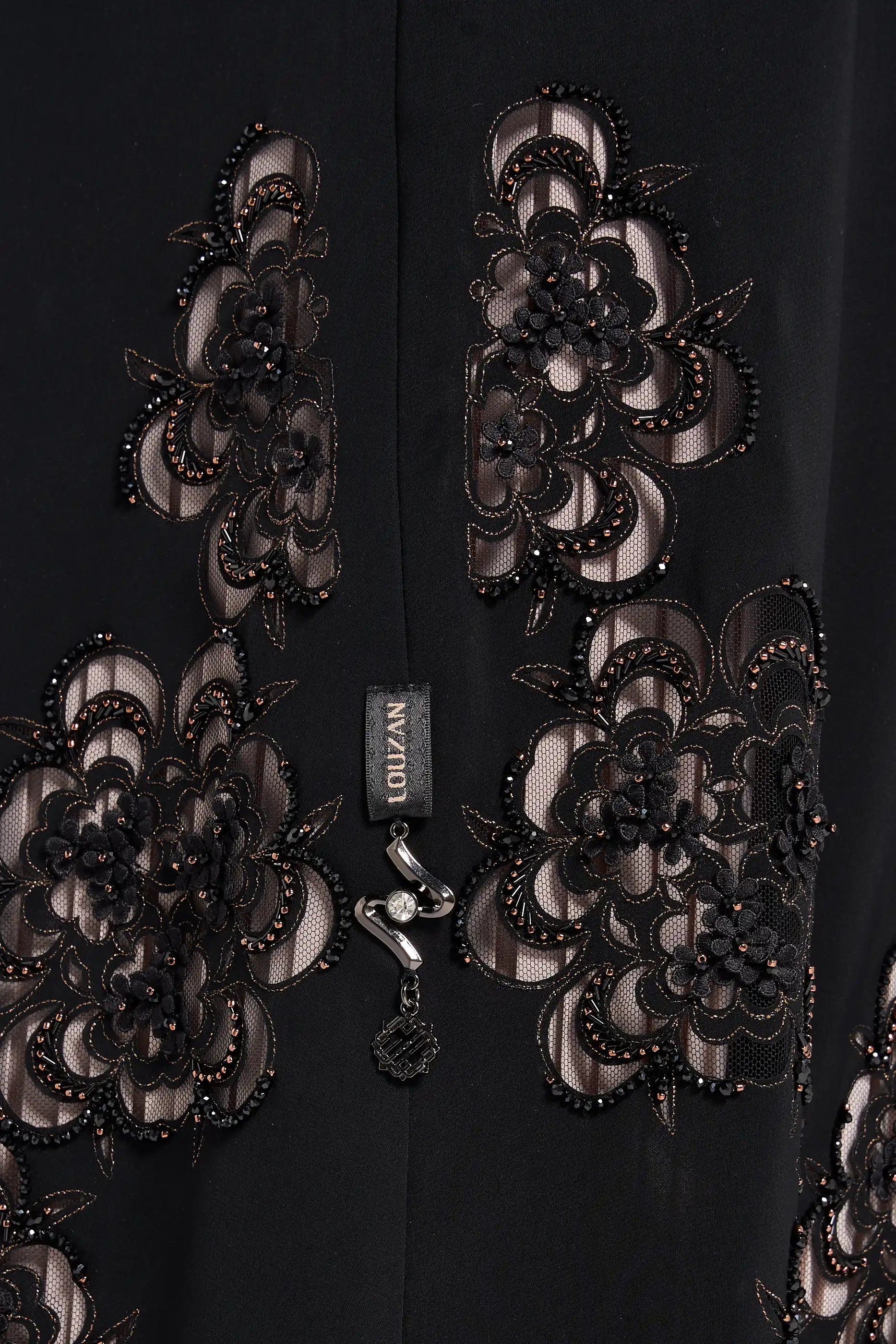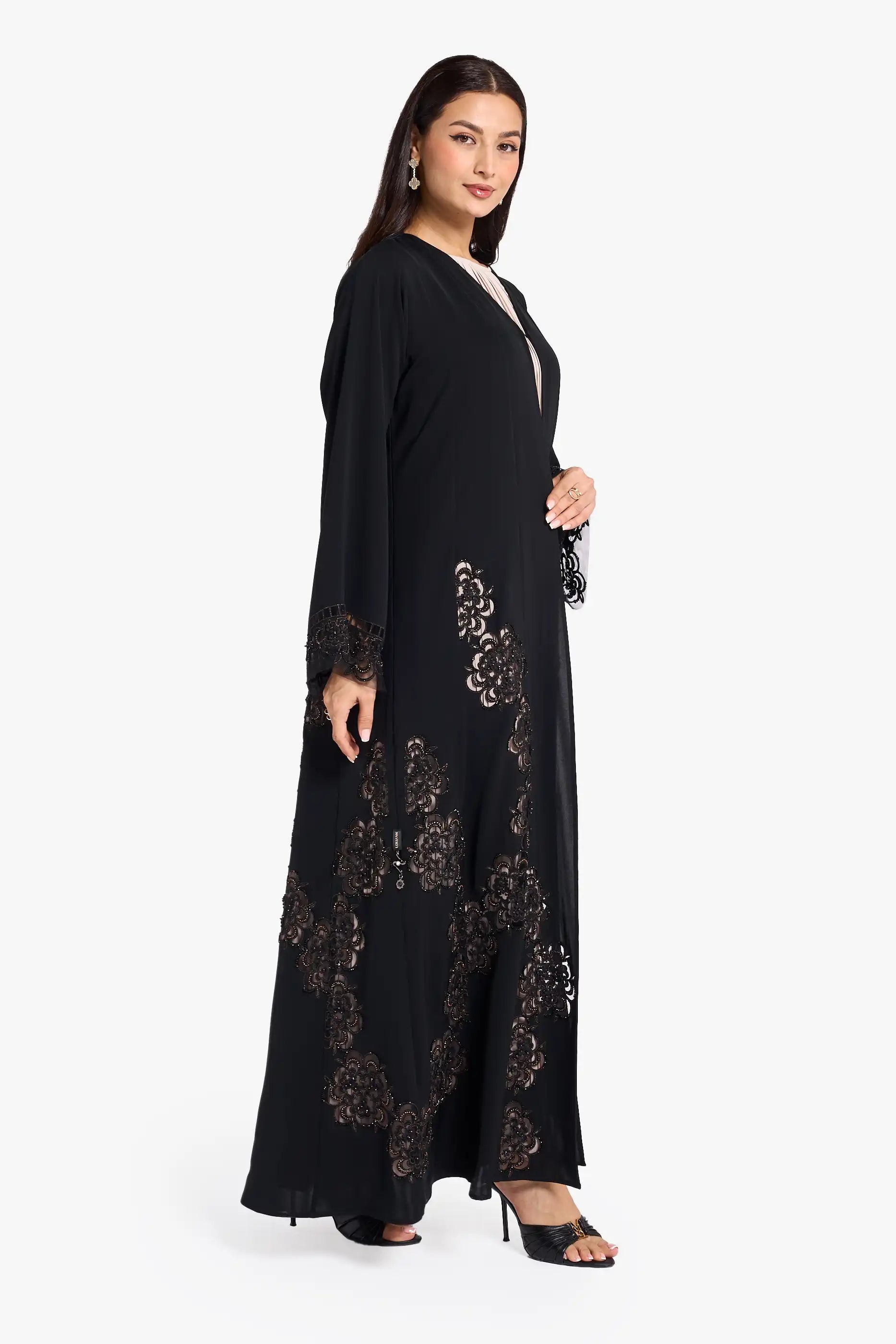 Louzan VIP abaya crafted in nida fabric with intricate laser-cut floral deign, enhanced with elegant dori embroidery and delicated beadwork. Perfect for special occasions.