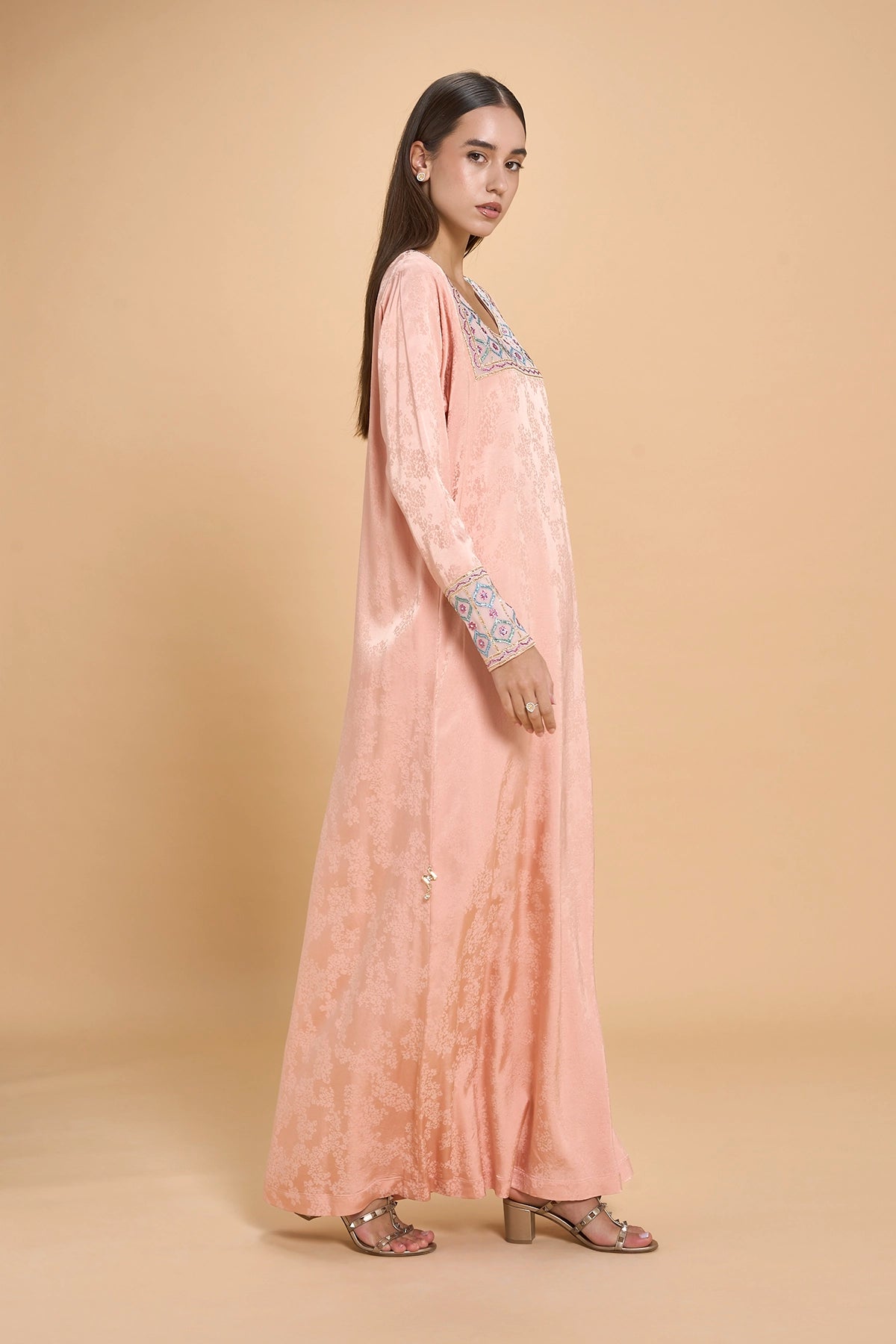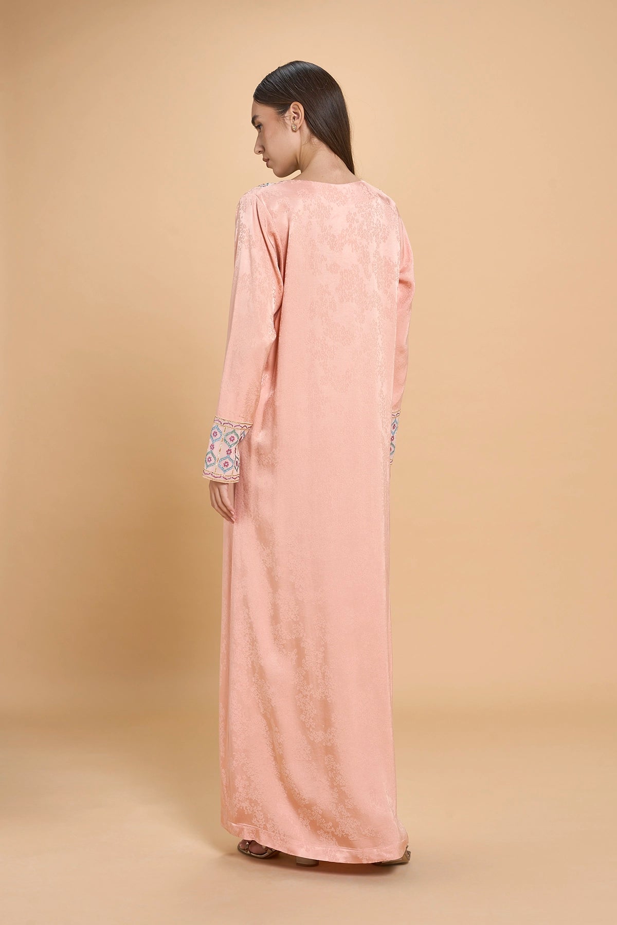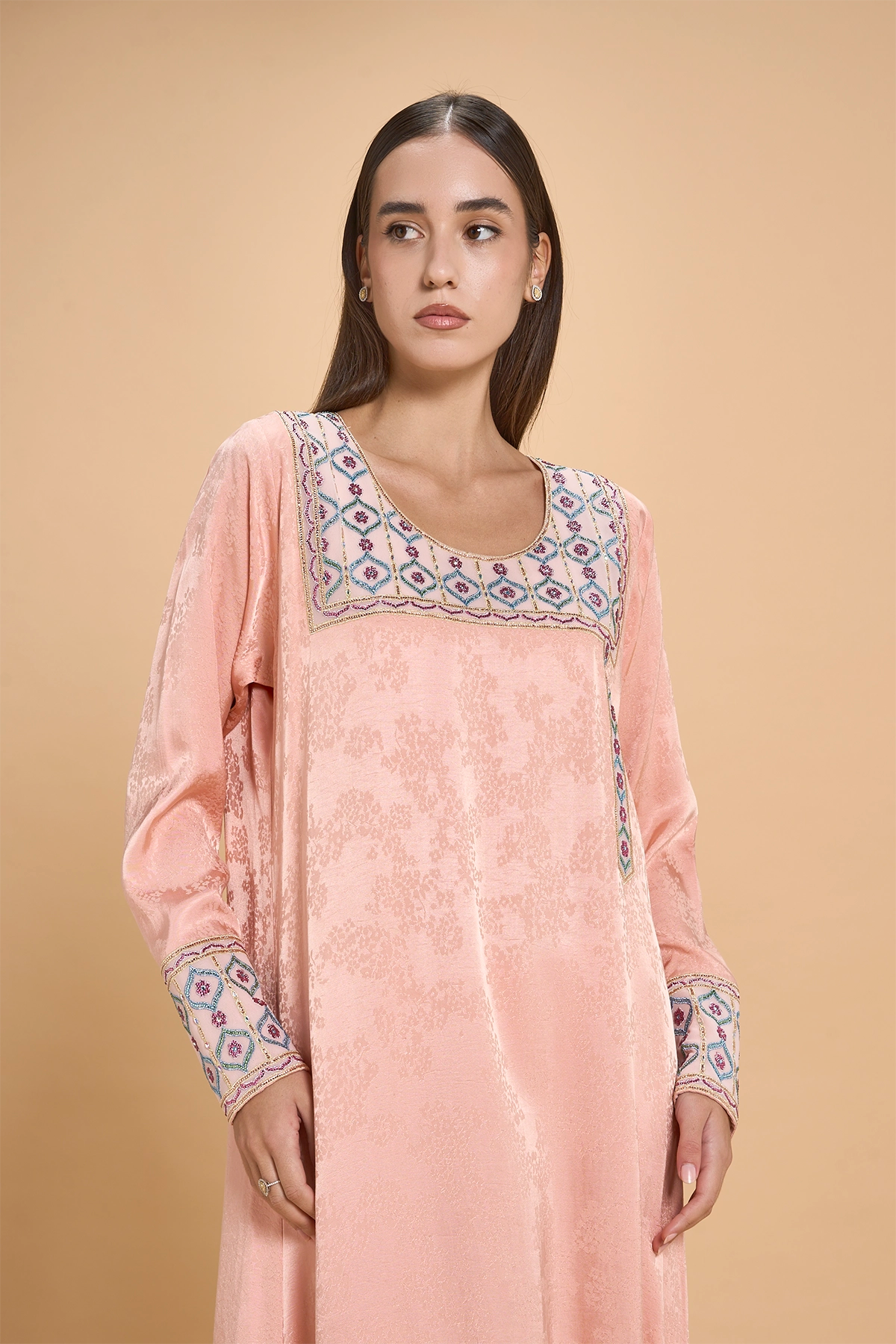 This Daily Wear Jalabiya Is Made From Soft Linen Jacquard, Offering Light, Breathable Ease Throughout The Day. Embroidery Along The Neckline And Sleeves Is Finished With Subtle Crystal Touches That Bring A Quiet, Refined Sparkle. The Design Features Traditional Arabic-Style Sleeves, Giving The Piece A Timeless, Grounded Character.
