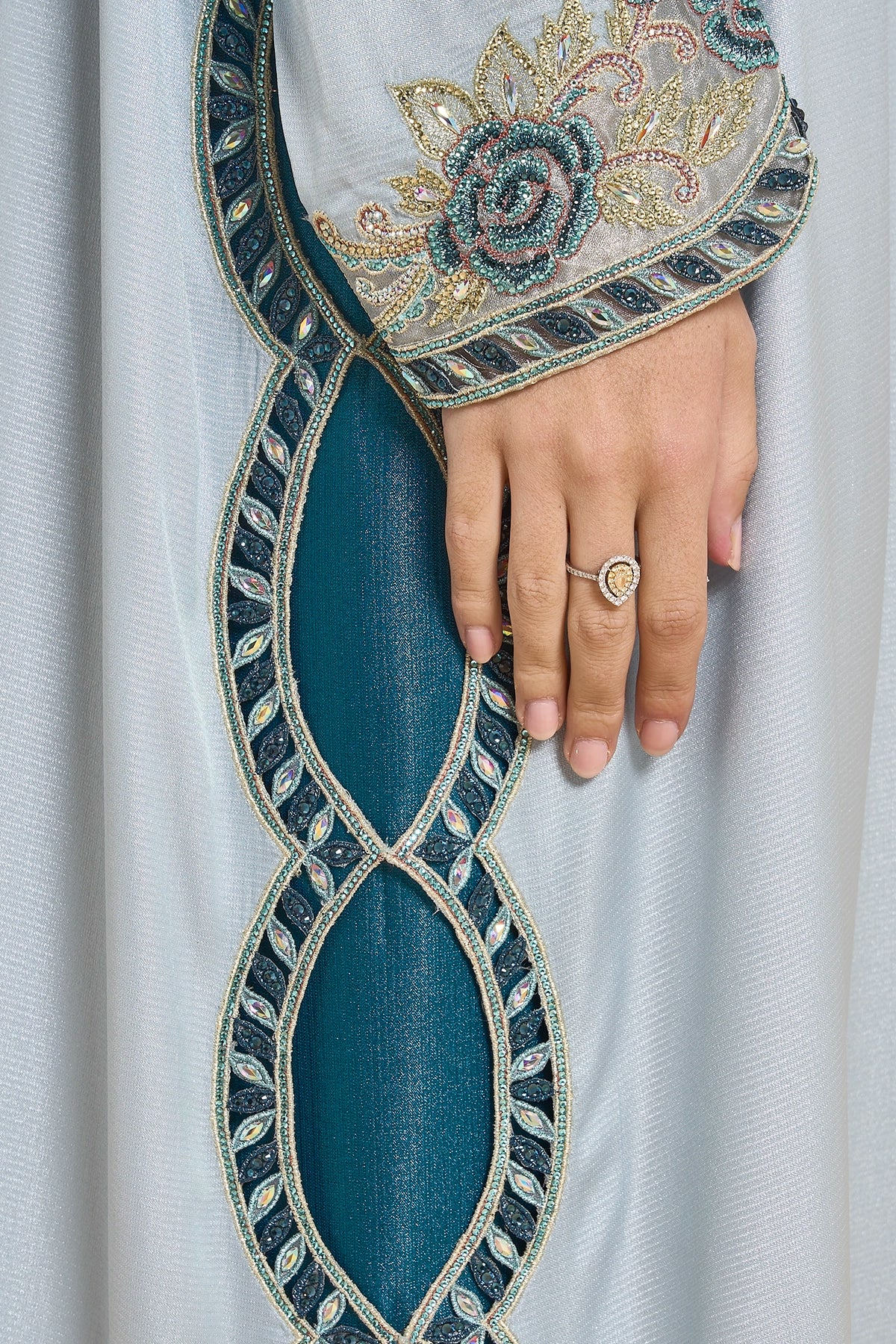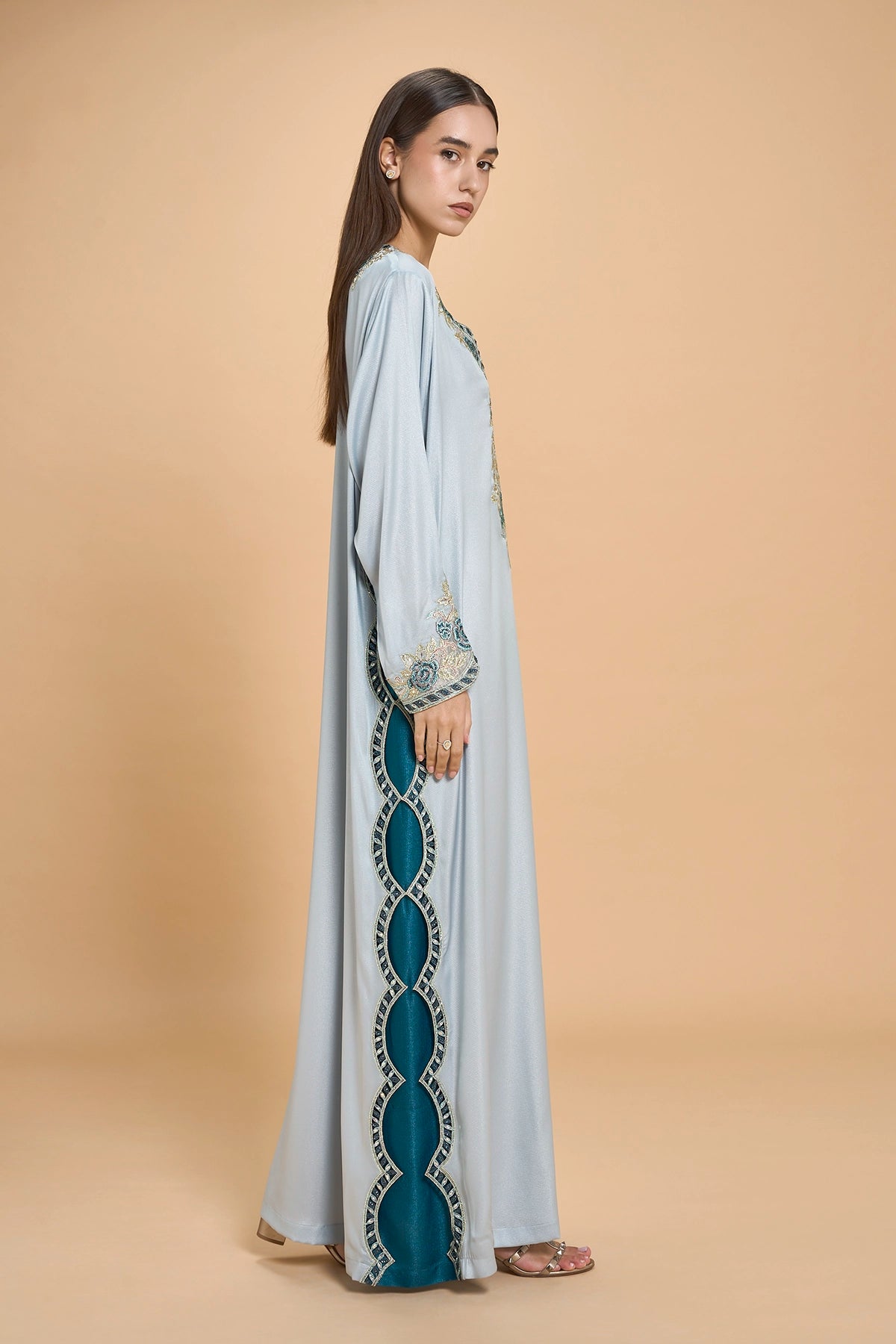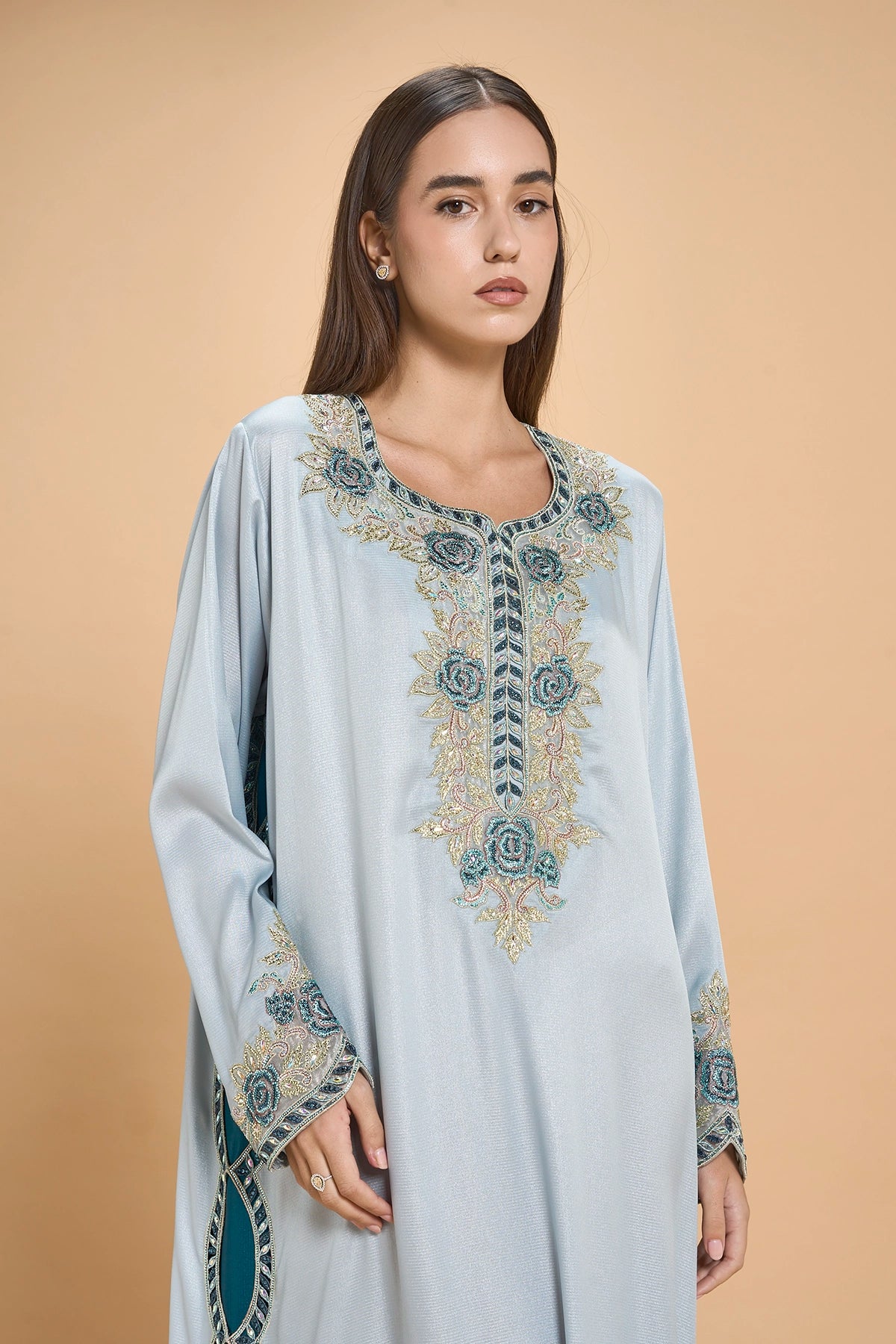 This Jalabiya Is Designed For Special Occasions, Made From Shiny Crepe Satin That Offers A Smooth, Polished Flow. Embroidery And Crystal Detailing Trace The Neckline, Sleeves, And Side Slit With Precise Placement, Creating A Gentle Light Play Without Overwhelming The Silhouette.