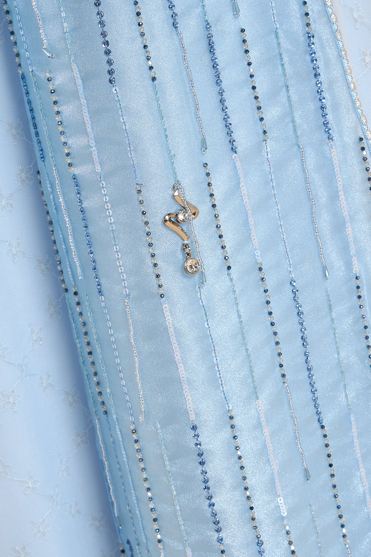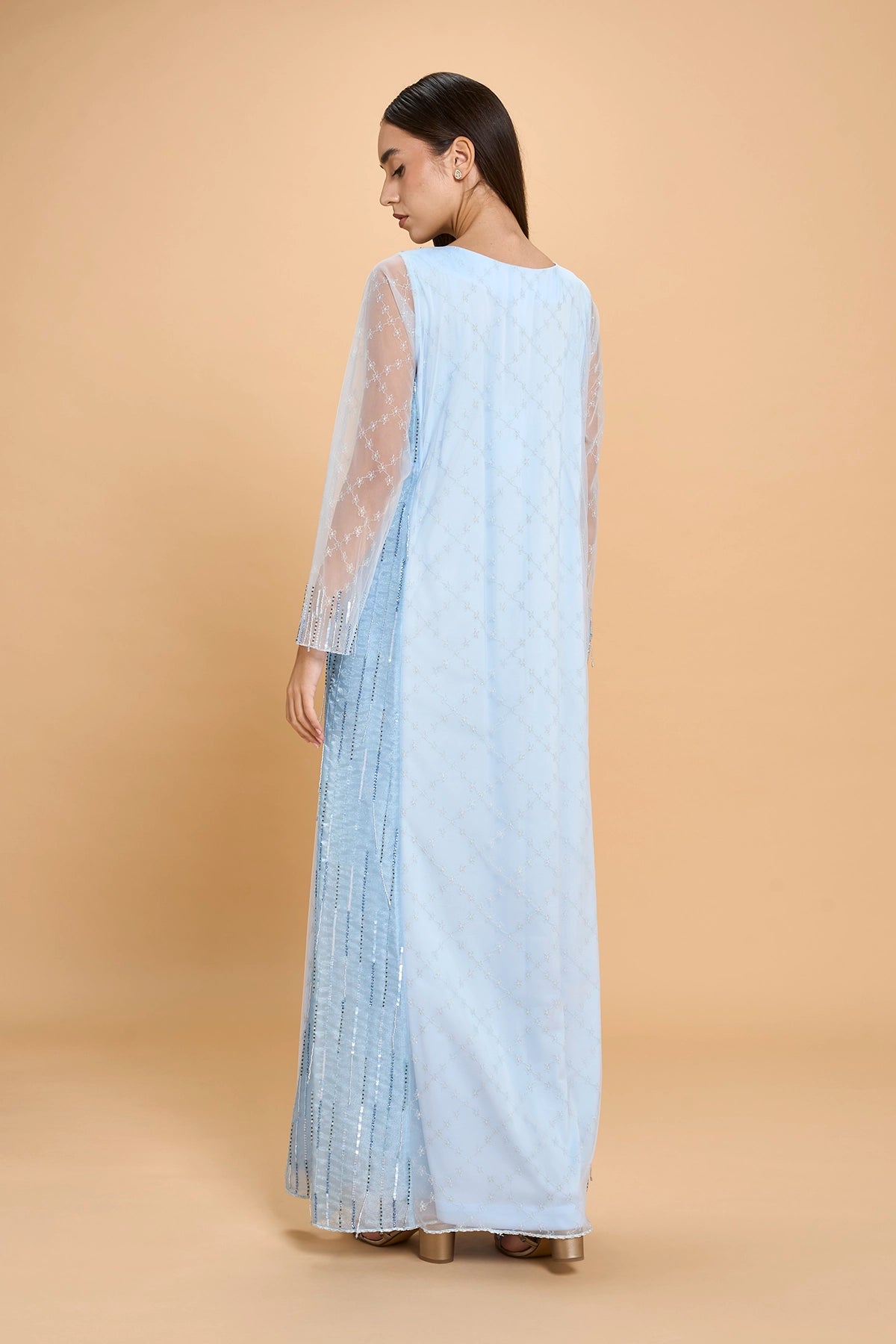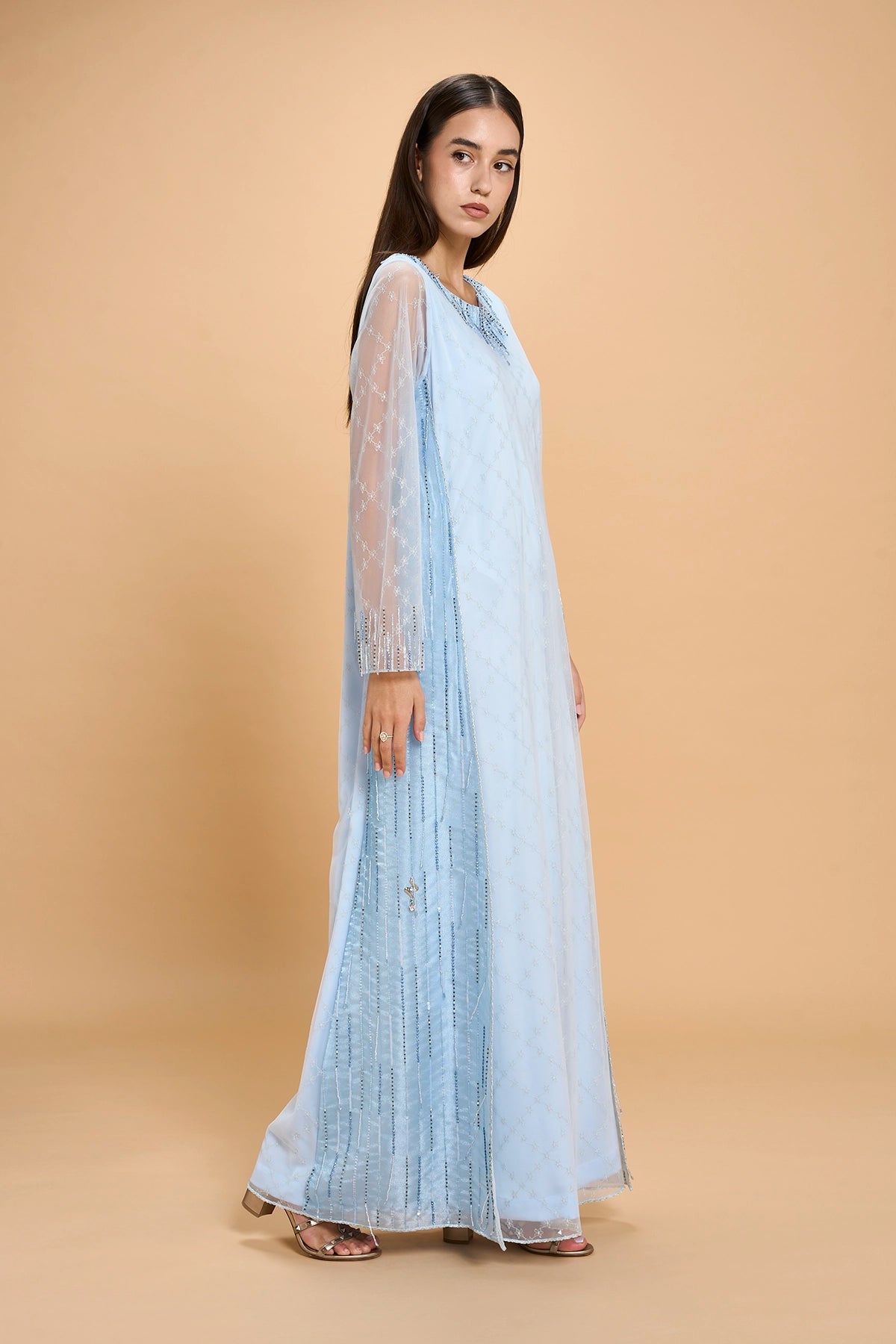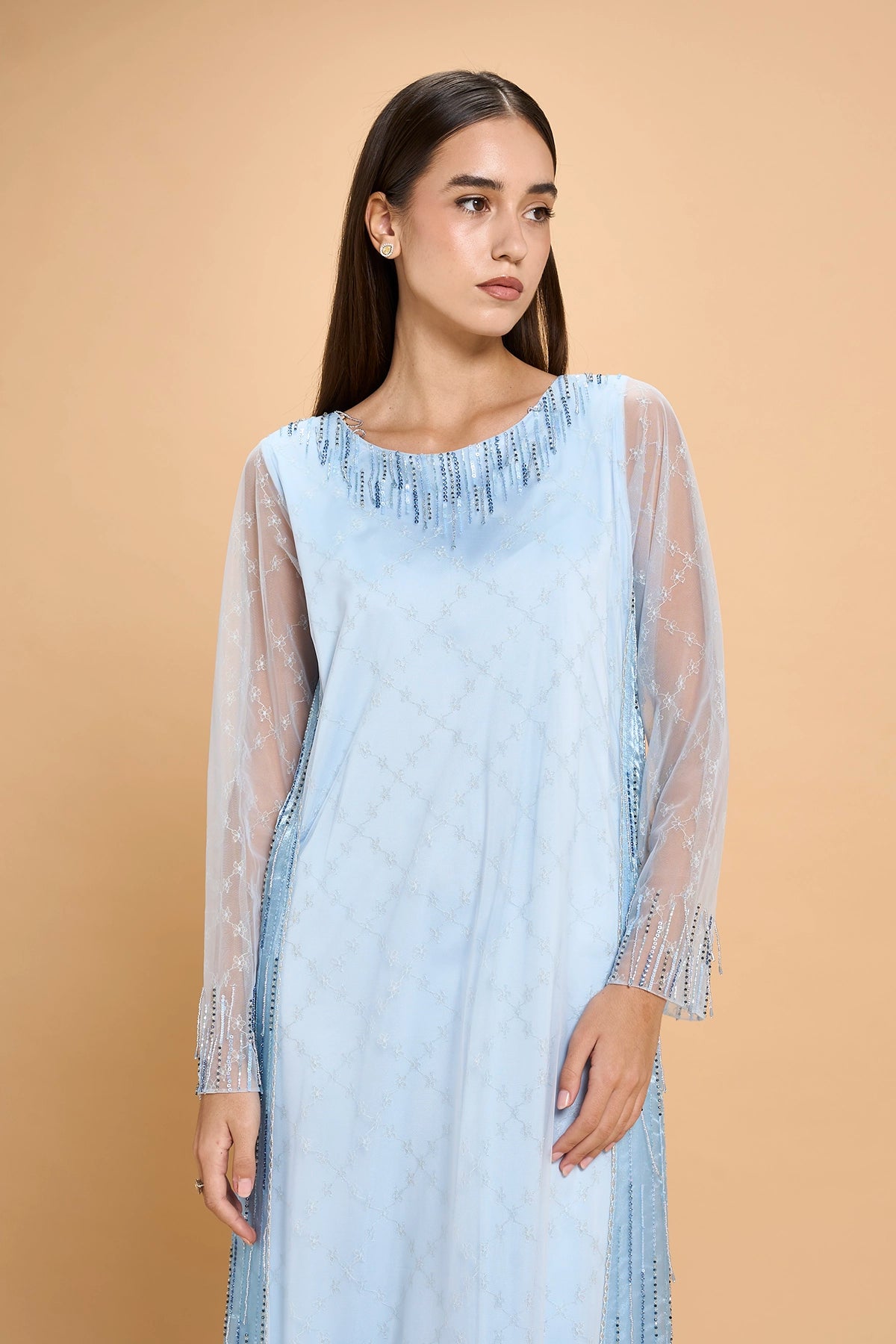 This Party-Wear Jalabiya Showcases Full Hand-Beading Across The Neckline, Sleeves, And Side Panels, Creating A Rich, Artisanal Surface That Plays Beautifully With Light. The Silhouette Is Built From Layered Satin, Lace, And Tulle For A Fluid, Dimensional Drape, While Sheer Organza Side Panels Introduce A Soft, Airy Contrast.