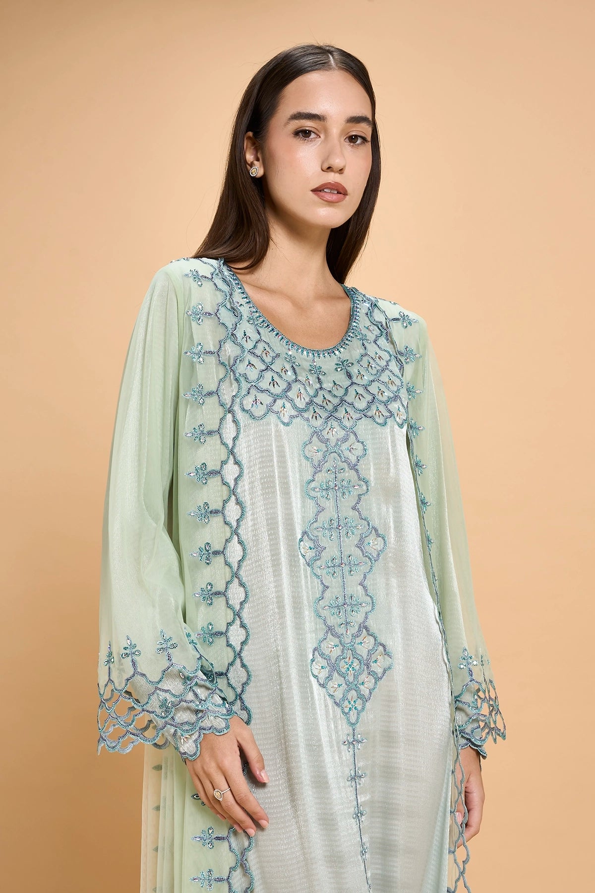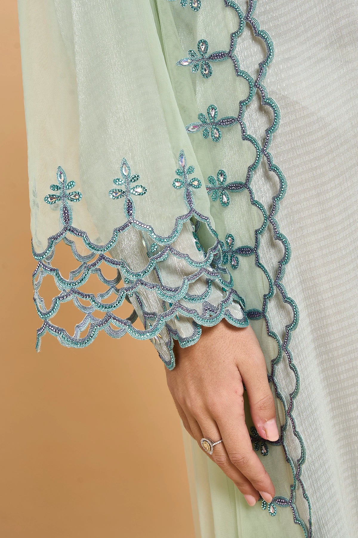 The Inner Layer, Made From Smooth Self-Designed Shimmer Organza, Carries Embroidery Along The Sleeves And Neckline For A Polished, Minimal Finish. Over It, A Sheer Tulle Layer Introduces More Defined Detailing, With Flowing Embroidered Lines That Move Across The Front, Back, And Sleeves, Creating A Light, Dimensional Silhouette. Both Layers Are Enriched With Embroidery Accented By Crystal Touches, Adding A Soft, Controlled Shimmer.