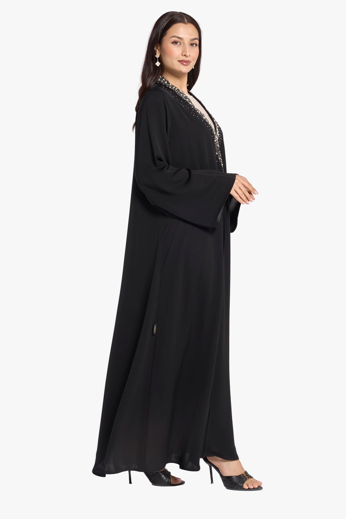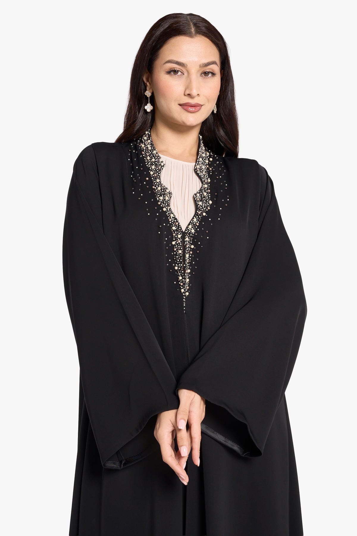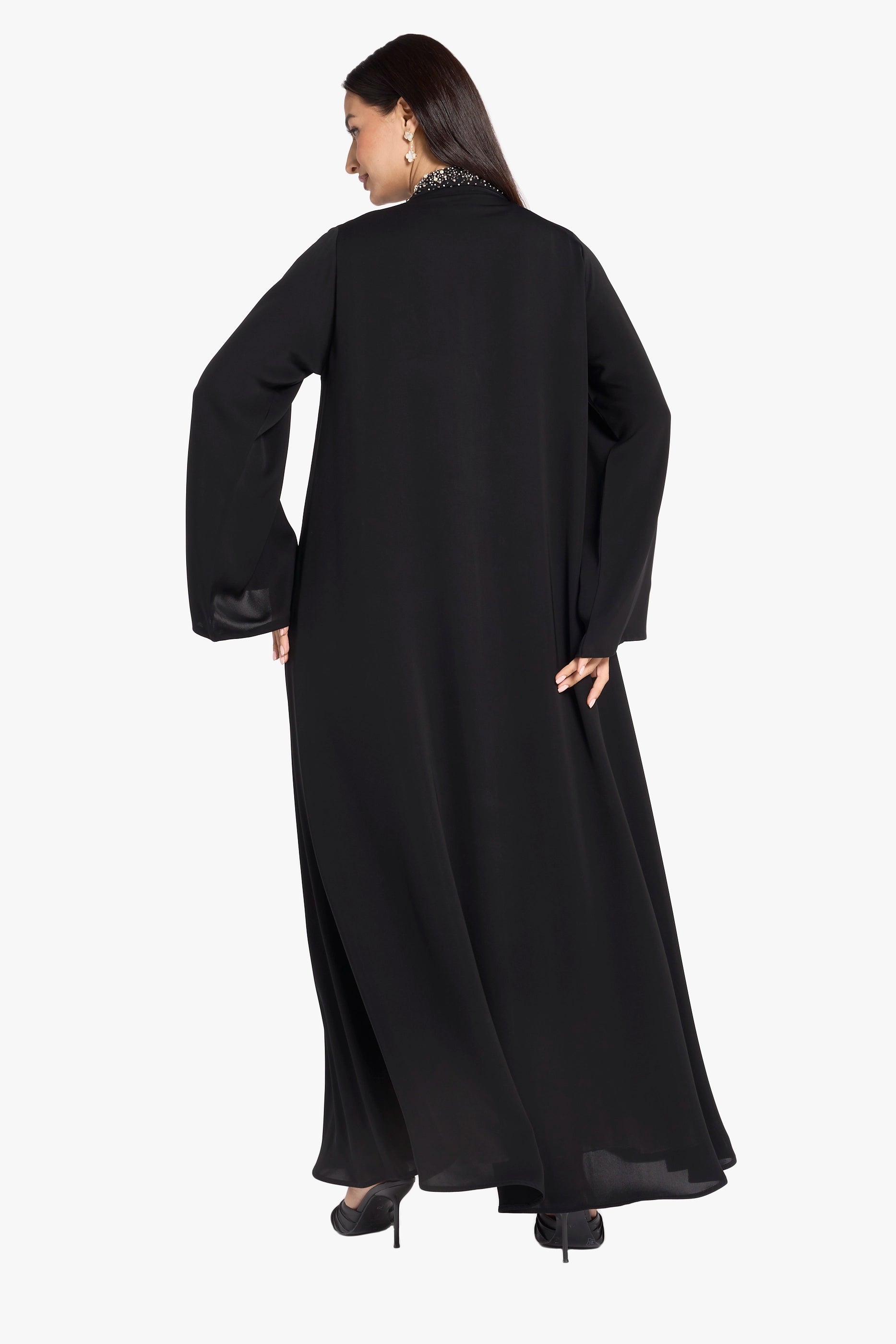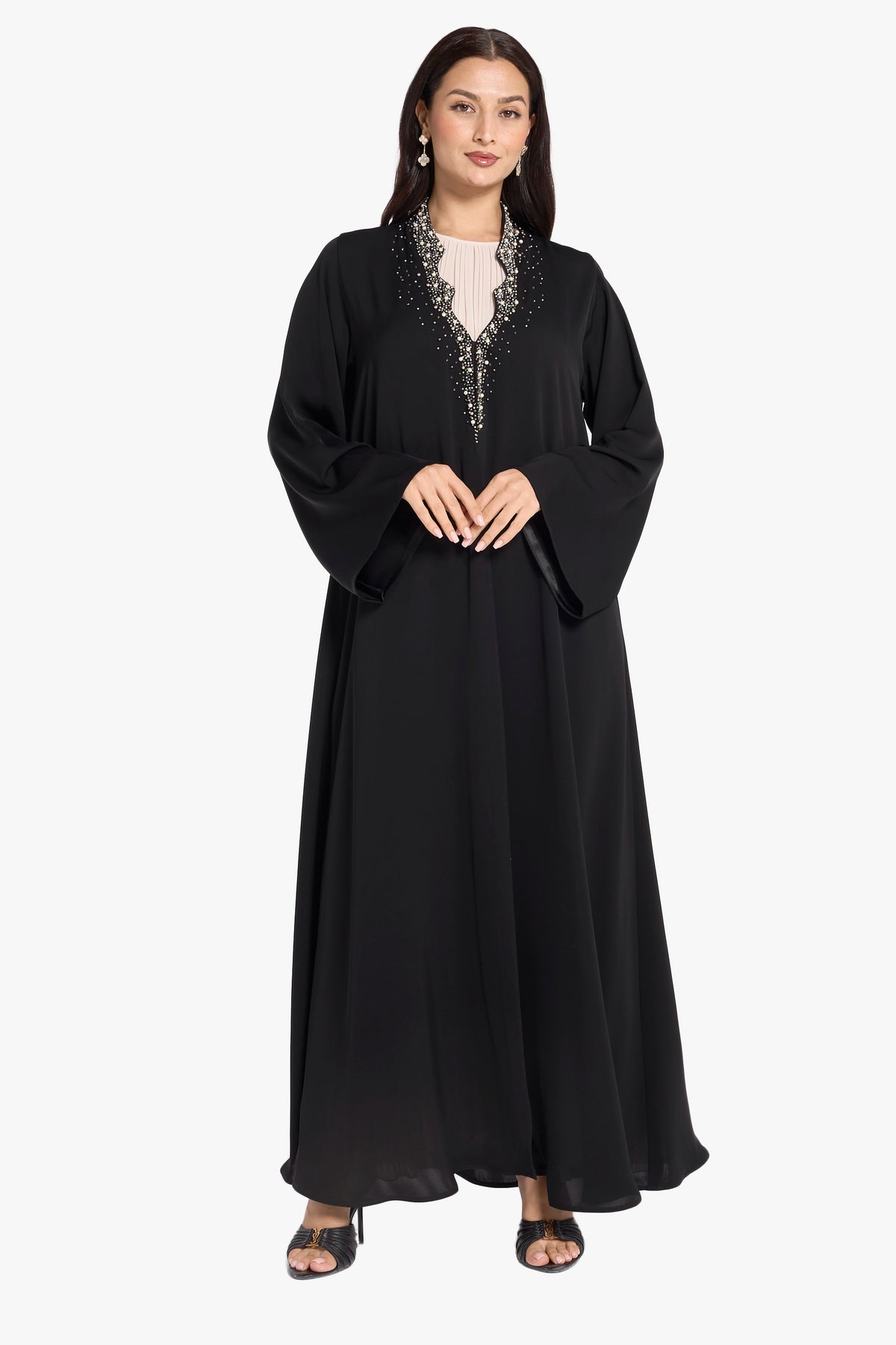 The abaya is distinguished by elegant handwork adorned with delicate sequins, creating a subtle shimmer that enhances its sophisticated design. This combination of craftsmanship and embellishment offers a graceful and refined look, perfect for those who appreciate detailed artistry in their modest fashion.