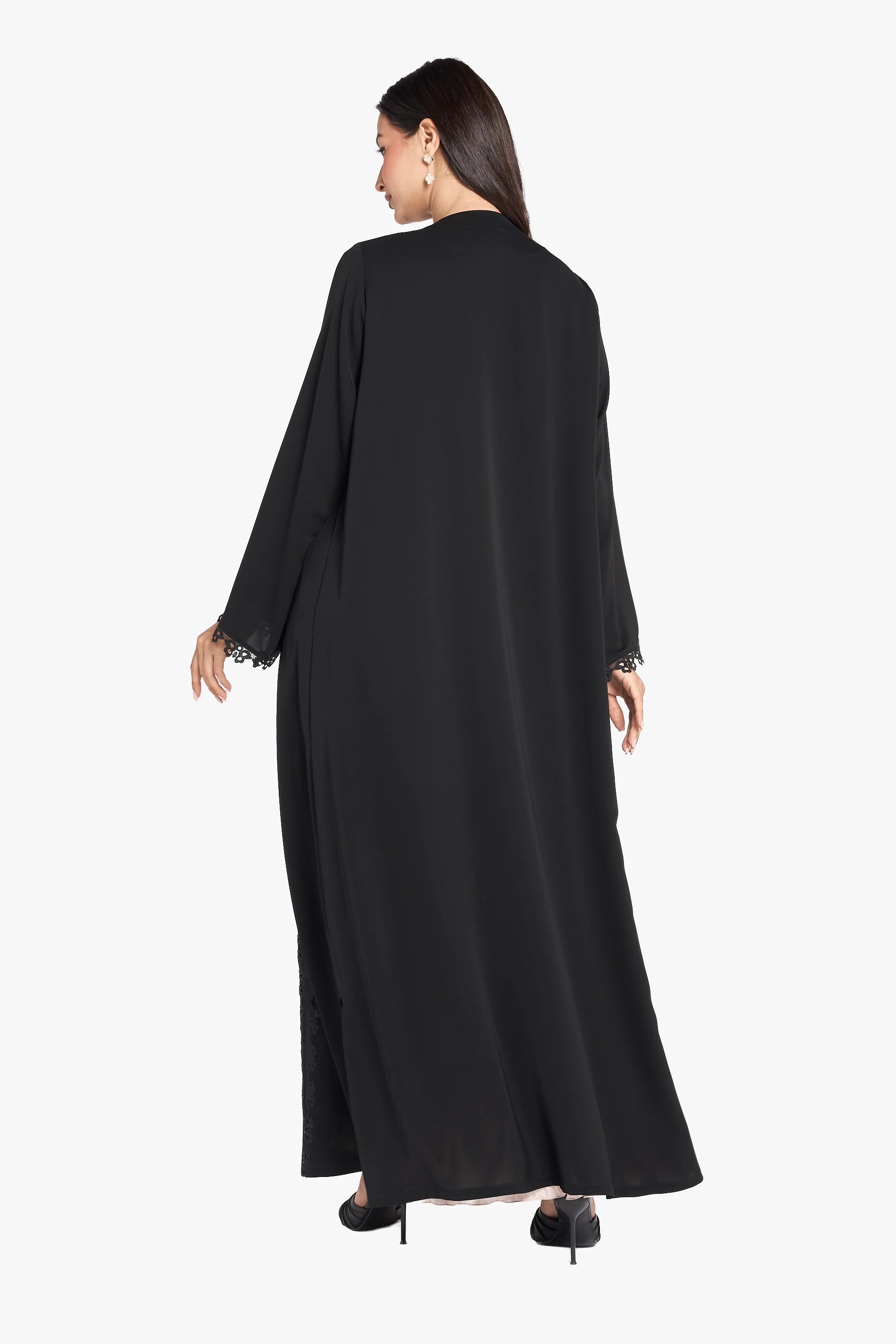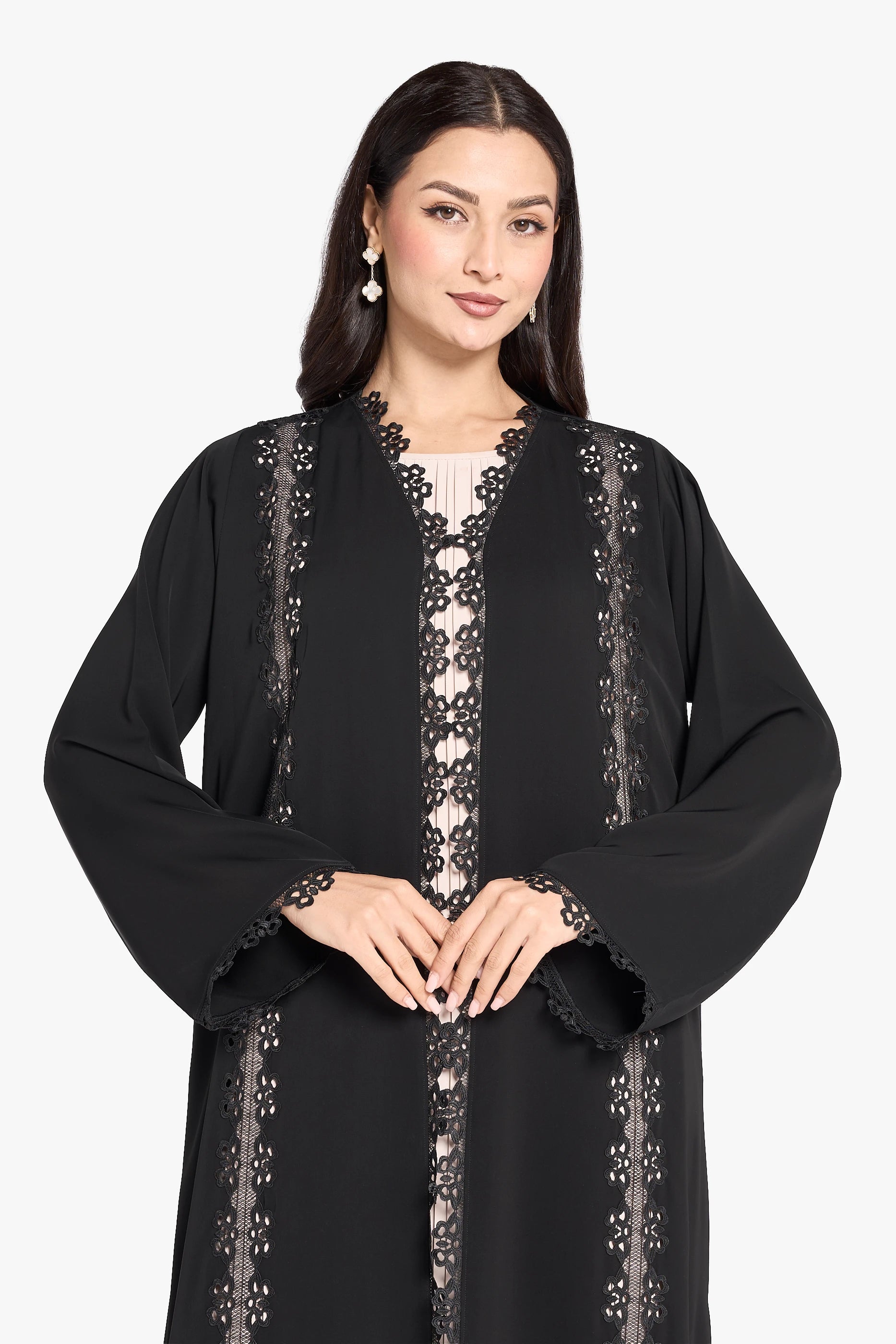 The Ousha Abaya OS-395 features premium nida fabric for a soft, breathable feel. Expertly designed with abstract lace accents on the front, princess line, and cuffs, it blends elegance with modern detailing. This abaya offers a refined silhouette ideal for formal and everyday wear, combining comfort with sophisticated style.