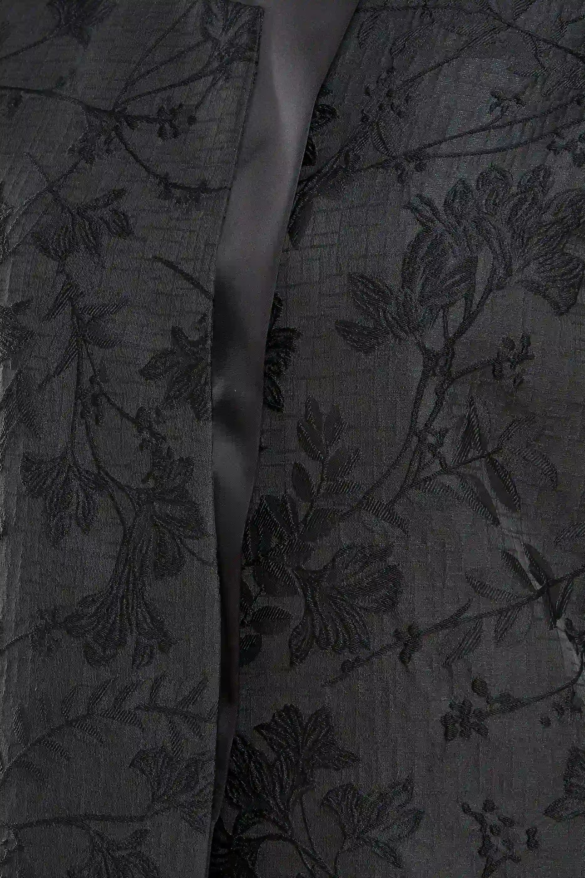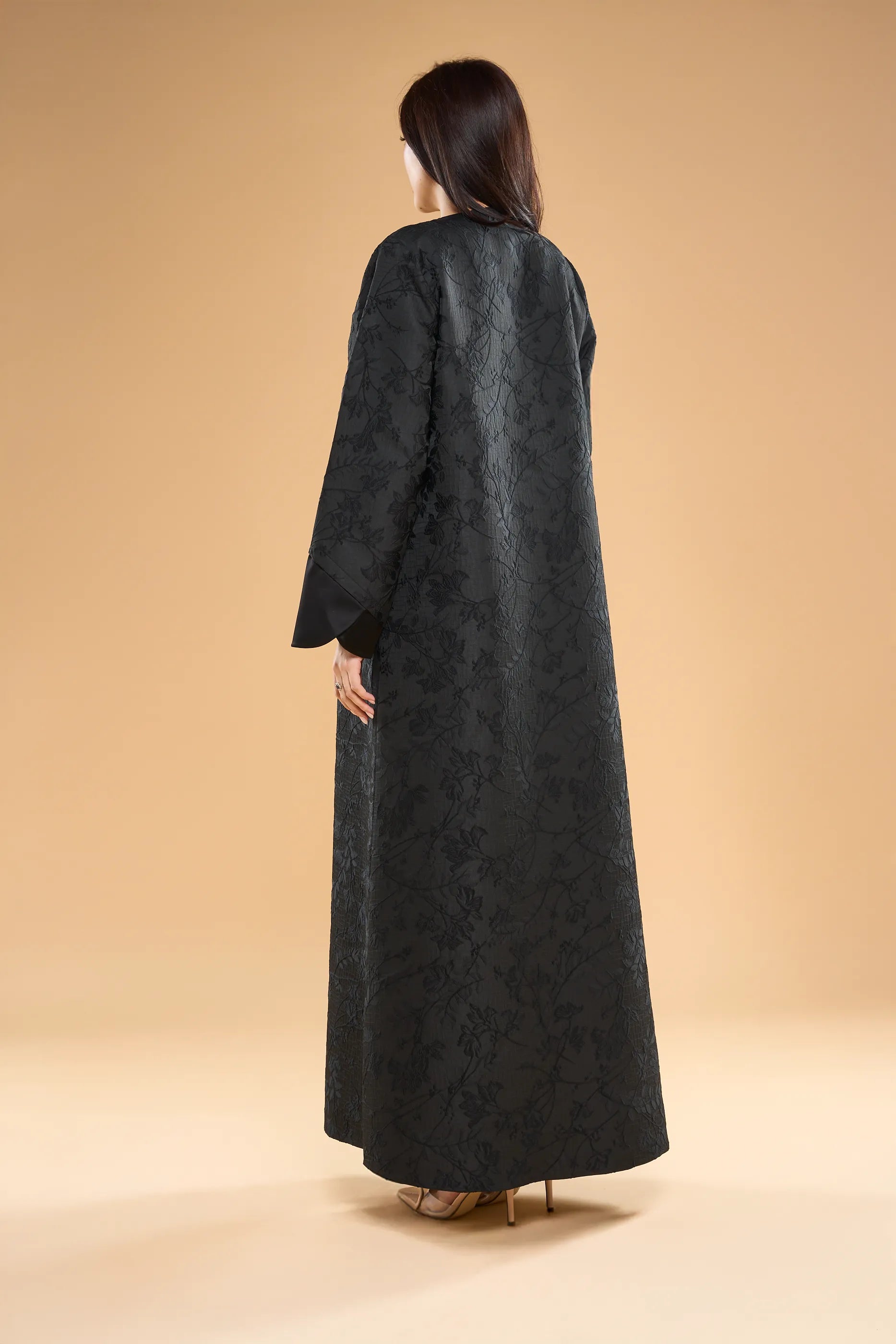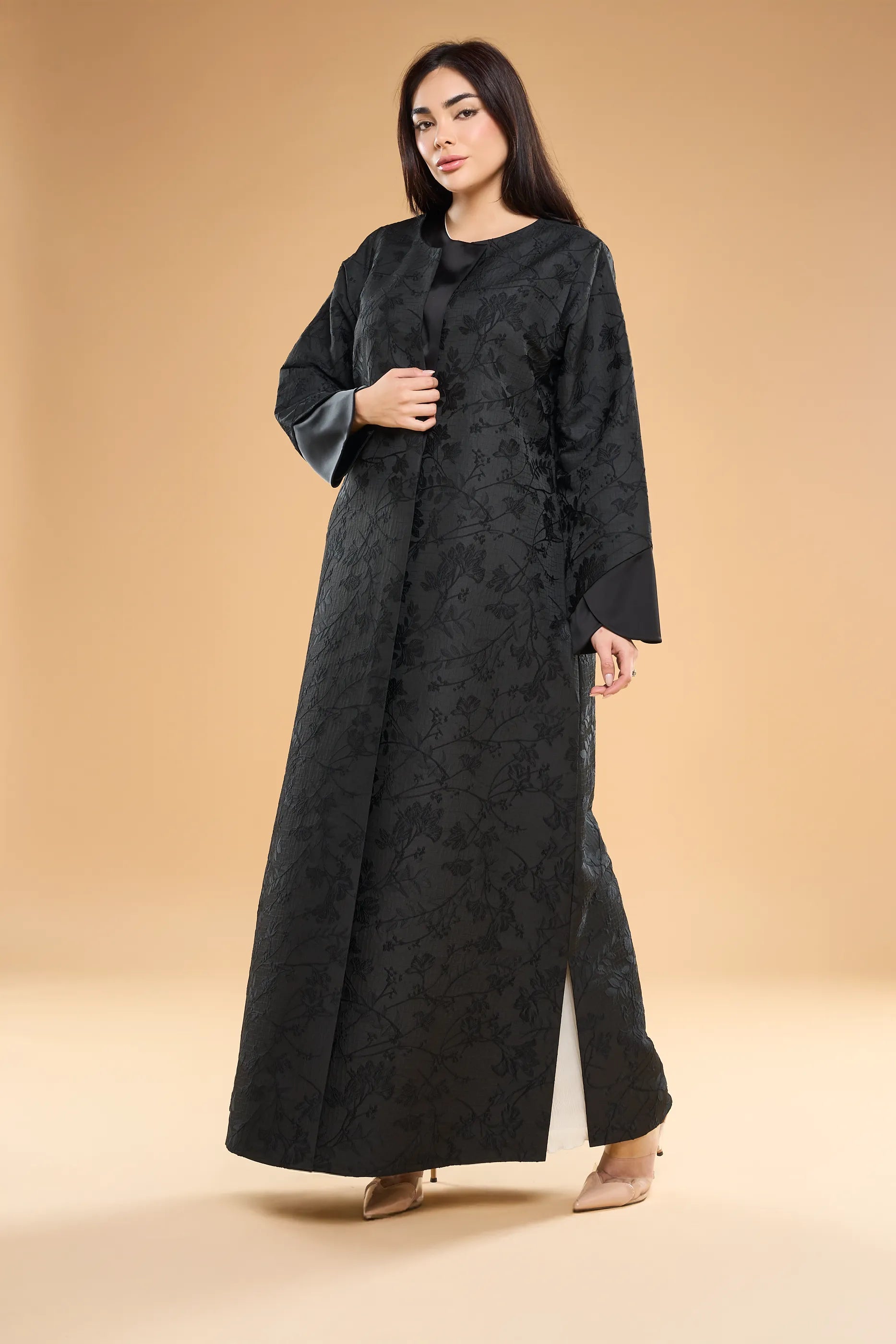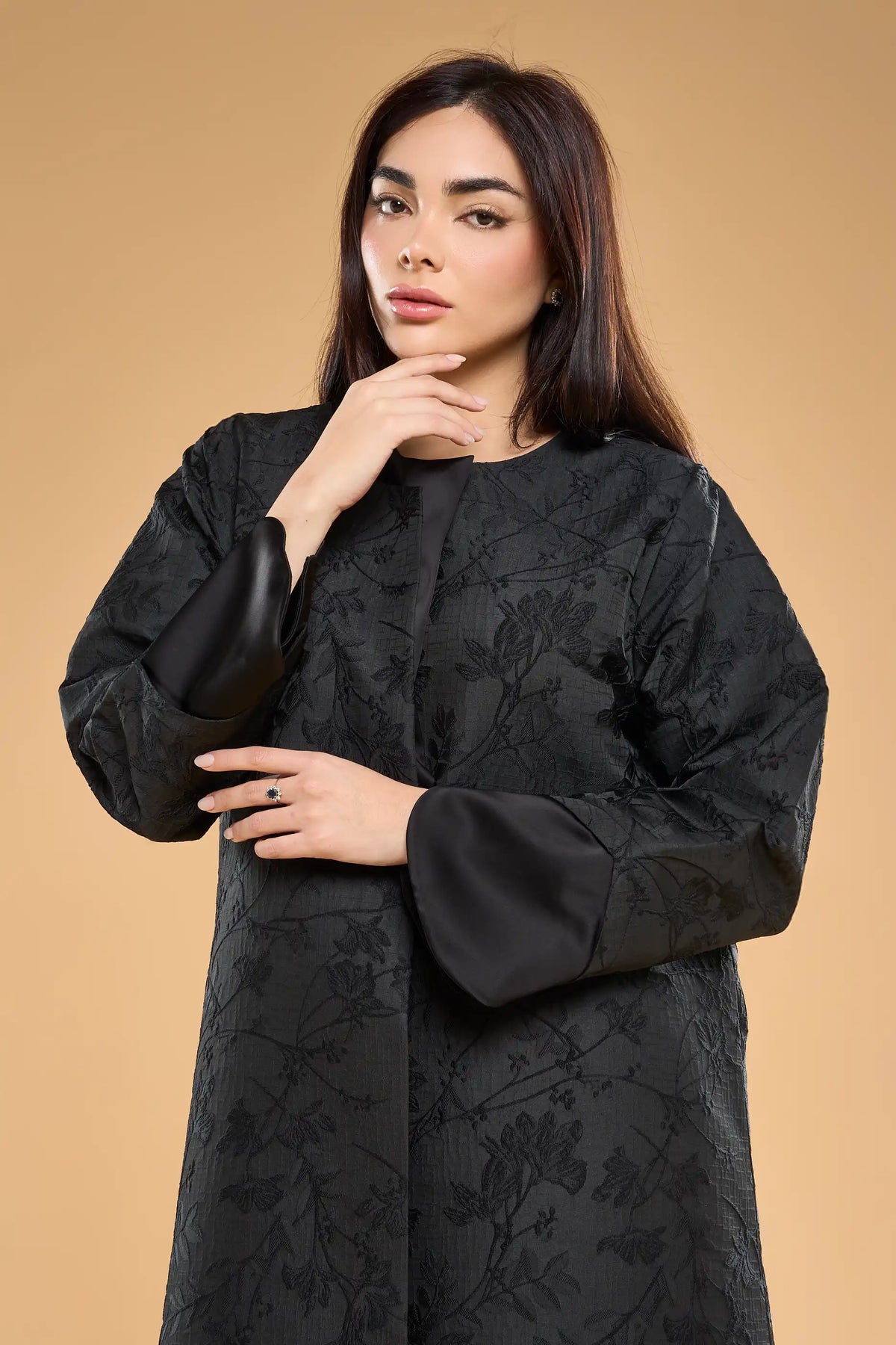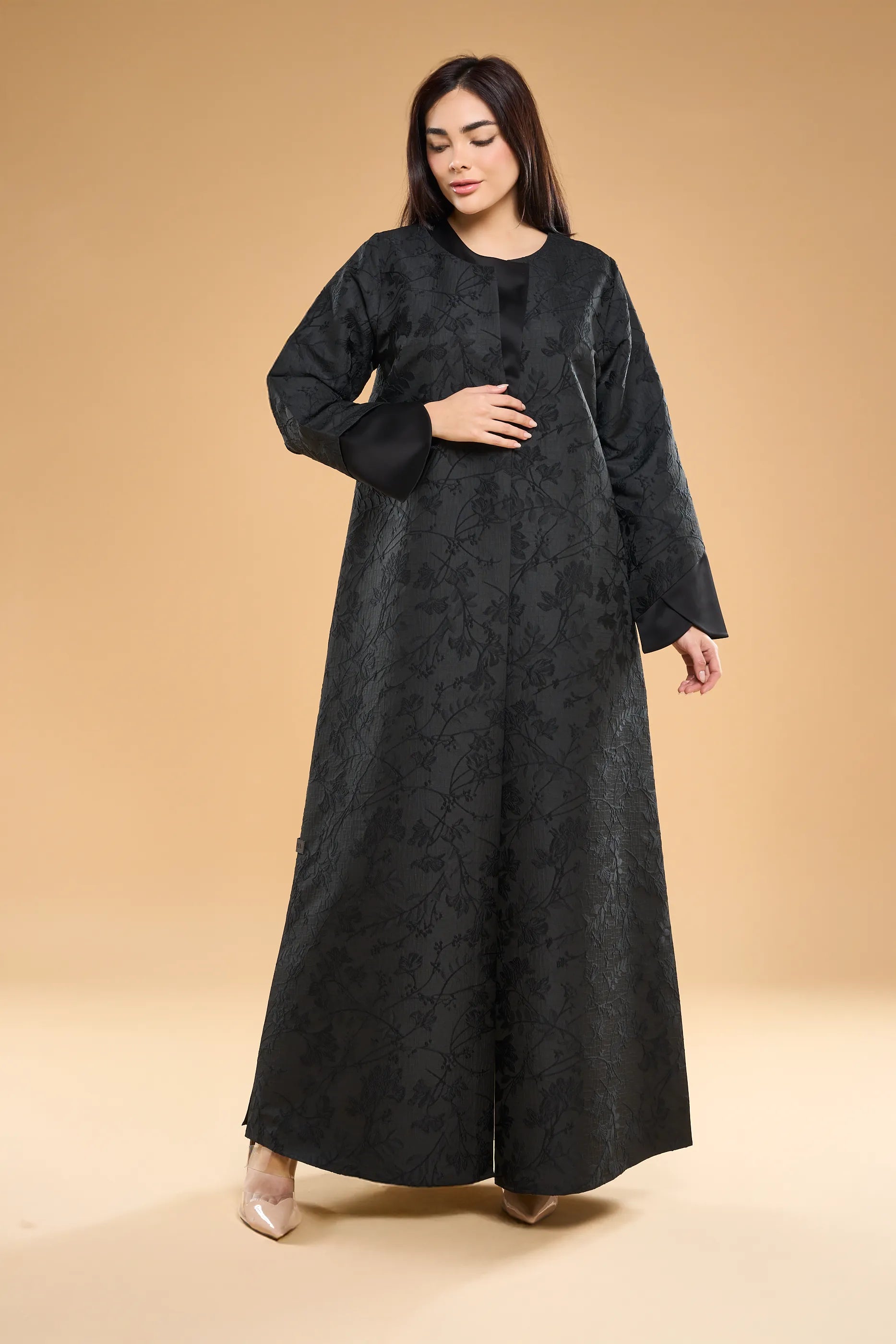 Ousha abaya in textured jacquard, accented with sleek satin panels at the collar and cuffs for a modern, structured look.