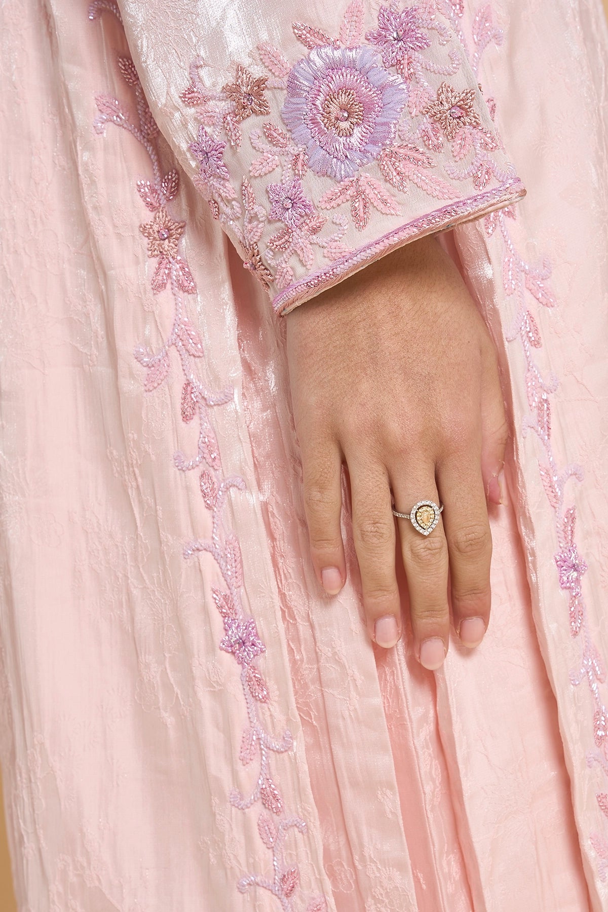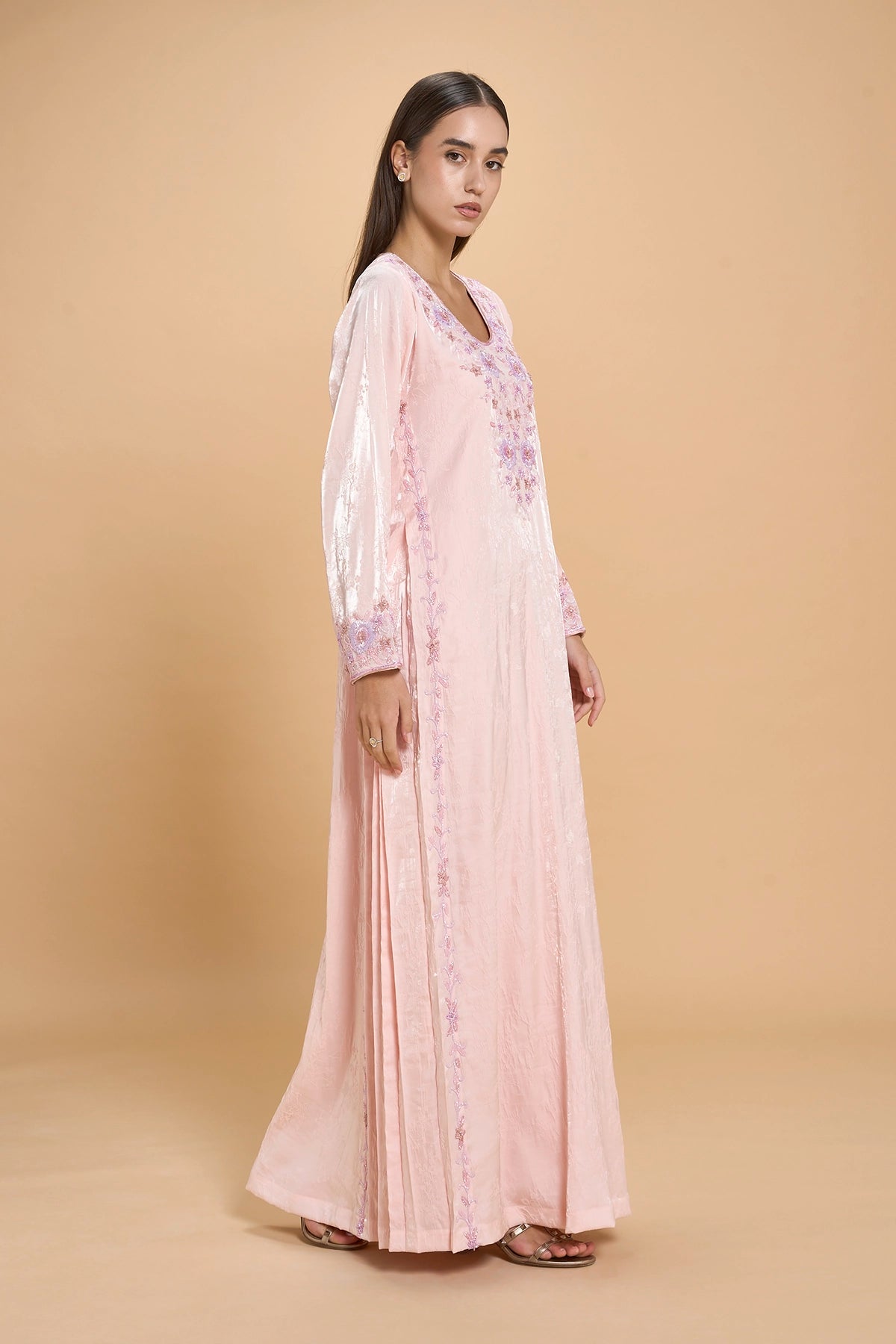 This Jalabiya Features Full Hand Embroidery That Traces The Neckline, Sleeves, And Sides With Precise, Intricate Detailing. Soft Side Pleats Introduce Gentle Movement And Shape, Giving The Silhouette A Refined Flow. The Shimmer Satin Jacquard Brings A Smooth, Luminous Finish To The Fabric While Maintaining Comfort And Ease.