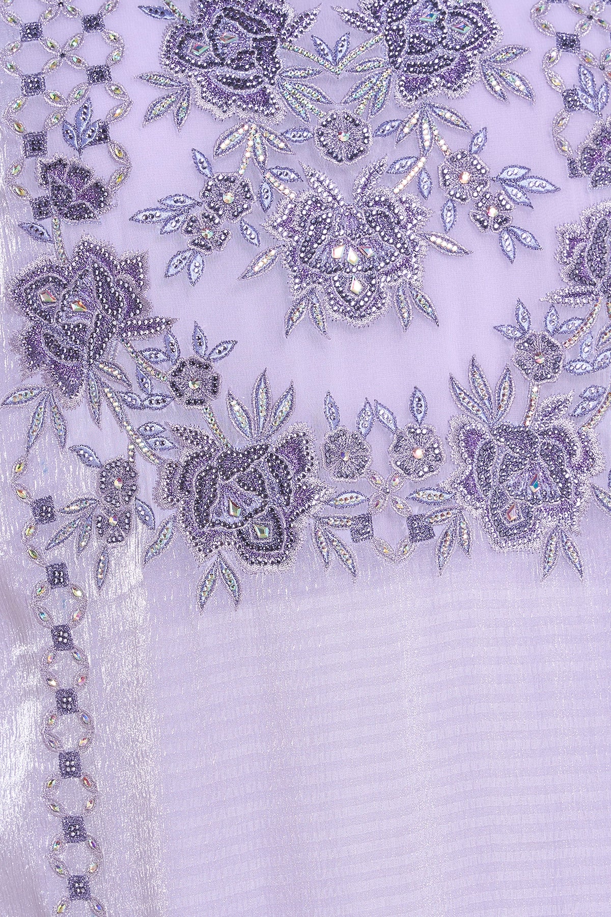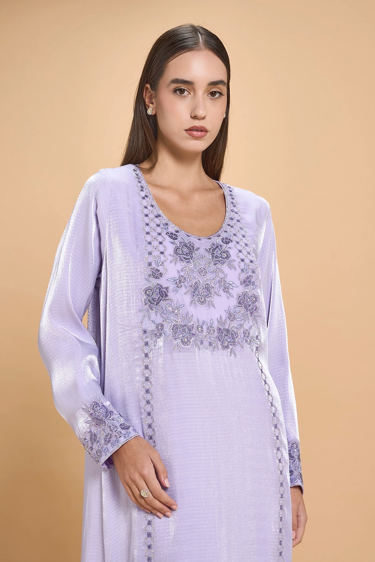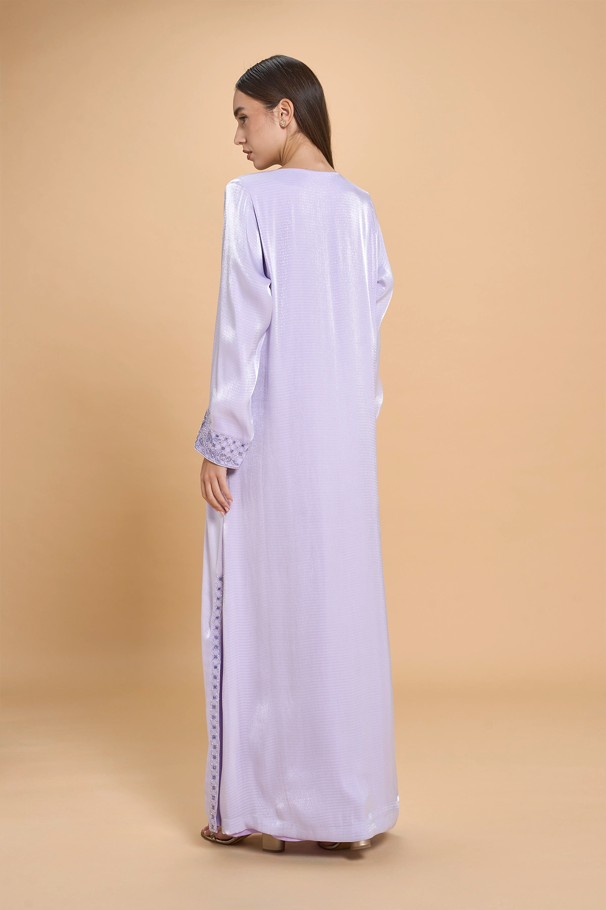 This Jalabiya Is Offered In Three Soft, Distinctive Shades, Light Pistachio, Purple, And Beige. Made From Self Design Shimmer Organza, The Fabric Catches The Light With A Gentle Sheen While Remaining Airy And Comfortable For Daily Wear. Embroidery And Subtle Crystal Touches Trace The Neckline, Sleeves, And Side Slit With Measured Detailing, Giving The Piece A Polished, Understated Finish. Light And Easy To Wear, It Brings A Refined Presence To Everyday Dressing.