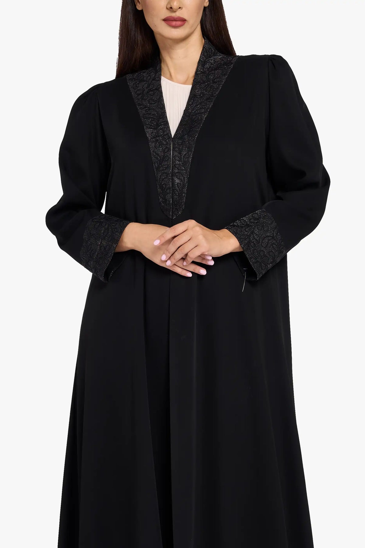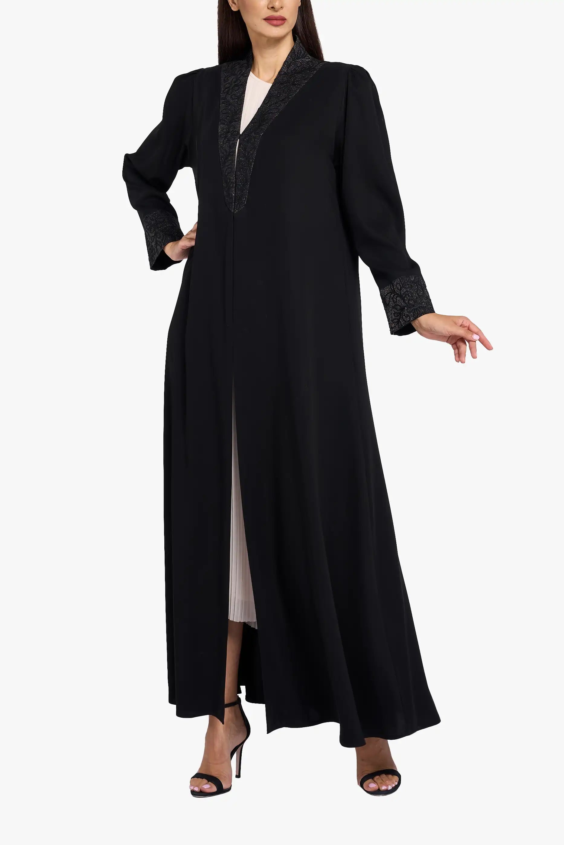 The LOUZAN ABAYA  is a distinguished piece crafted from elegant Nada fabric, adorned with exquisite handwork and intricate embroidery. Perfect for special occasions, this abaya combines timeless craftsmanship with refined details, offering a graceful and sophisticated silhouette. Its delicate embellishments enhance its luxurious appeal, making it an ideal choice for moments that call for understated elegance and cultural beauty.