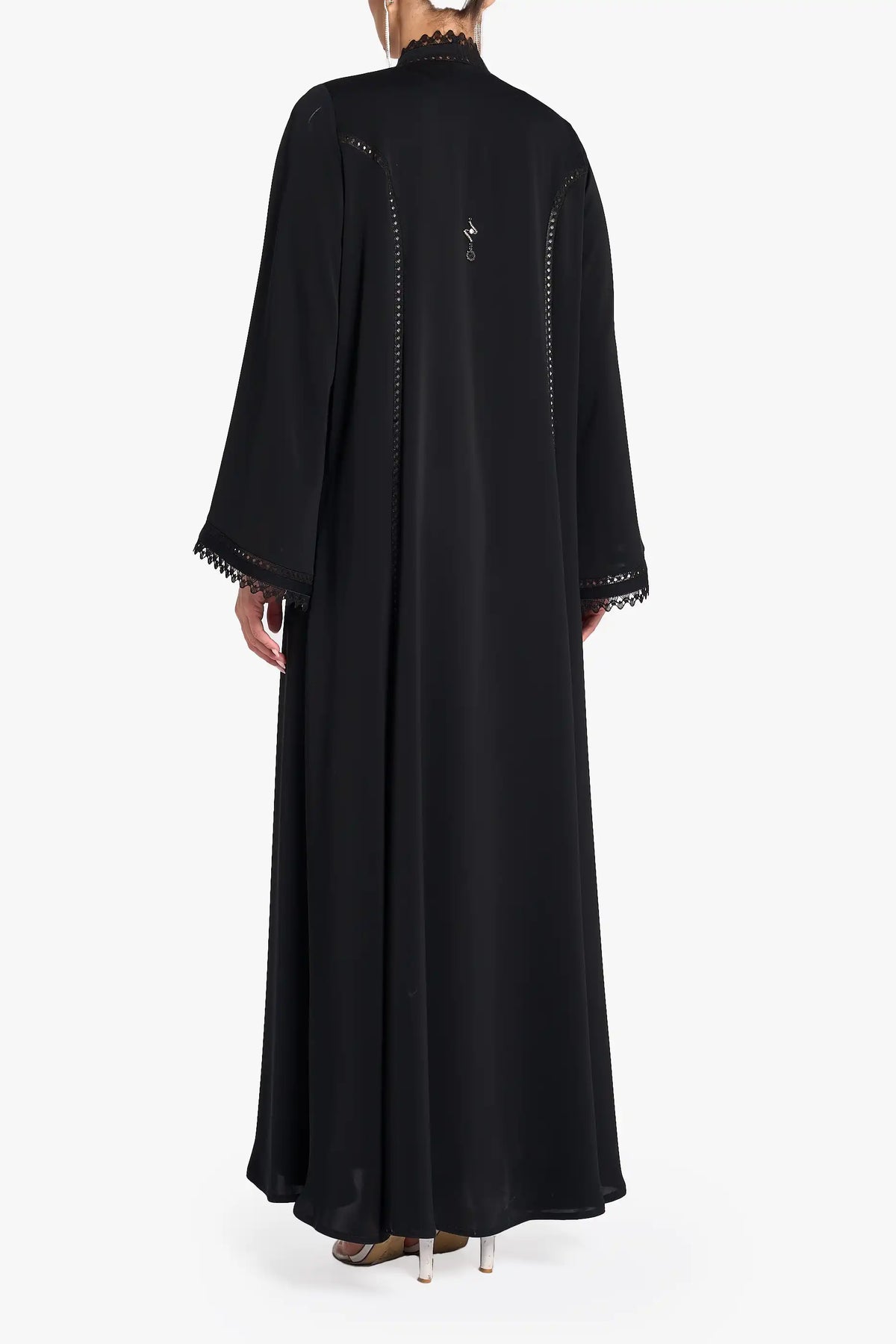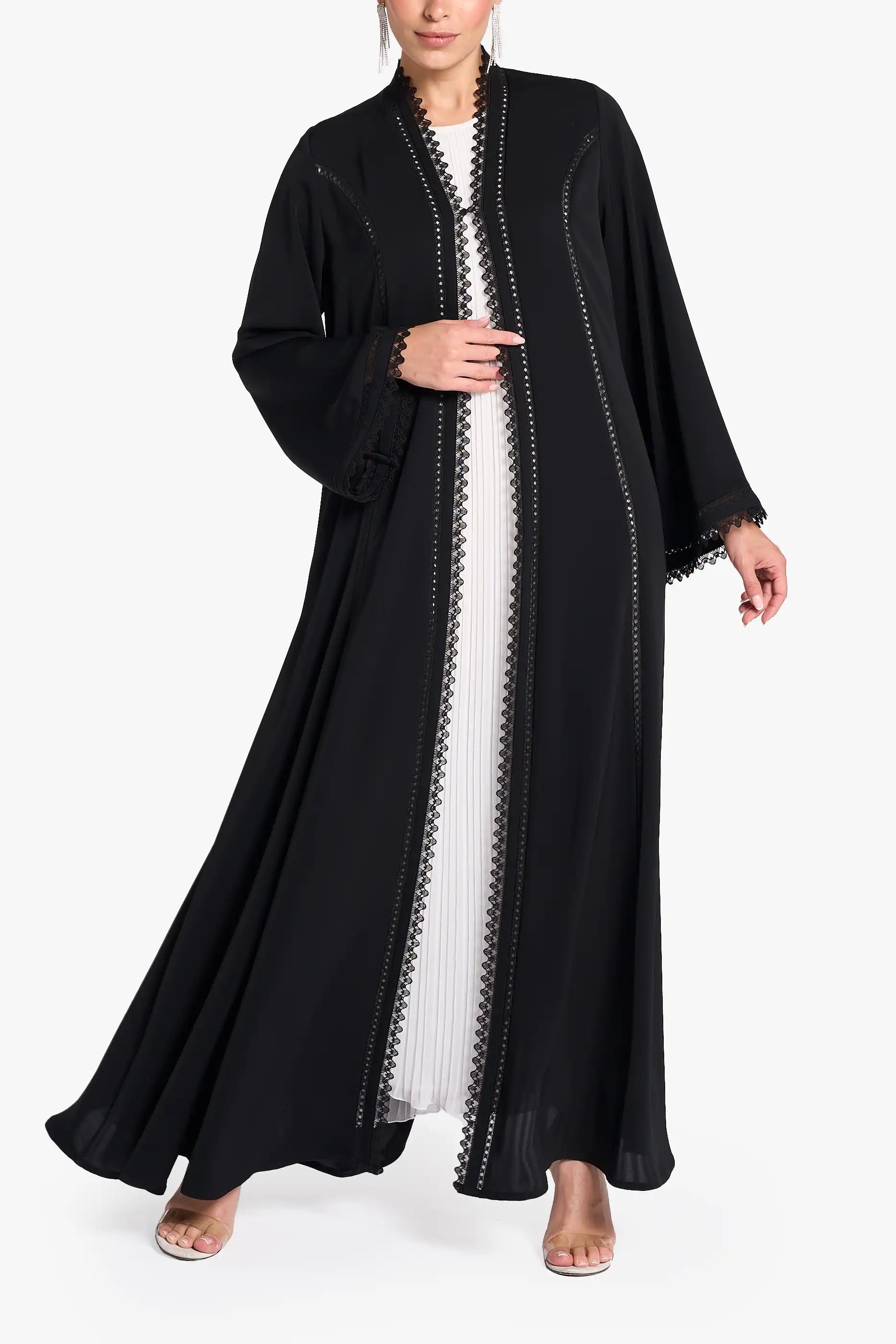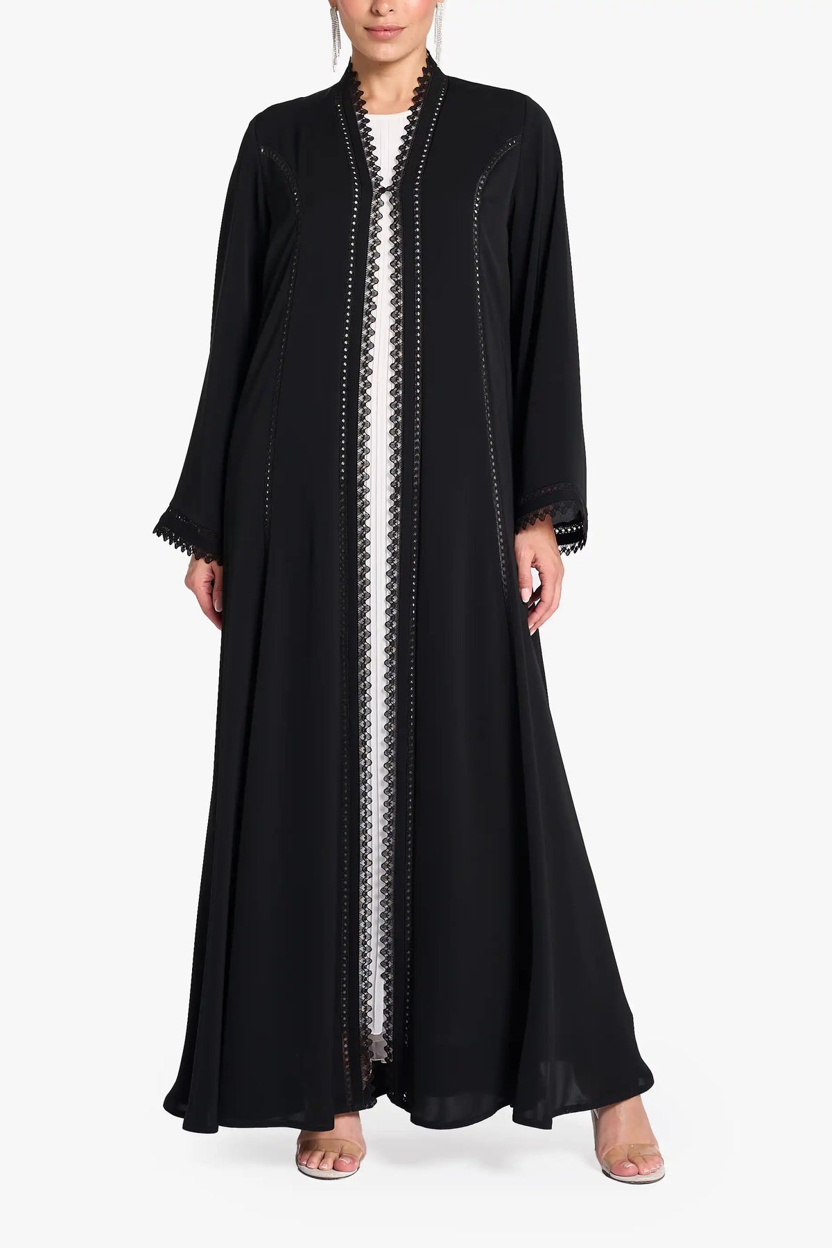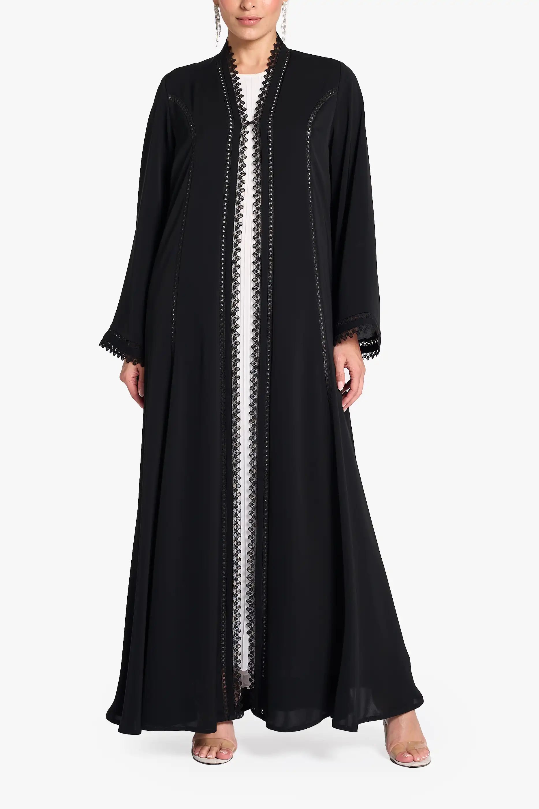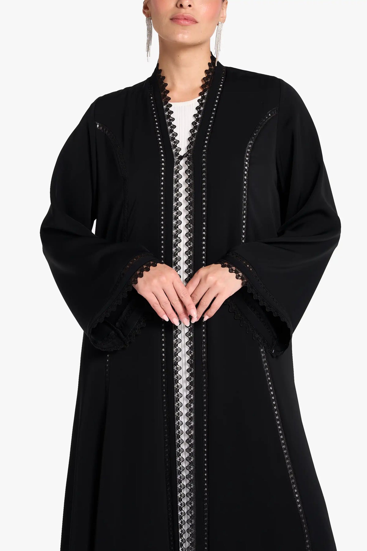 Louzan Classic abaya crafted in nida fabric with lace inserts and edging in geometric patter design with panel flared cut.