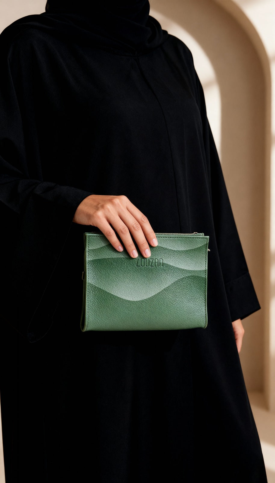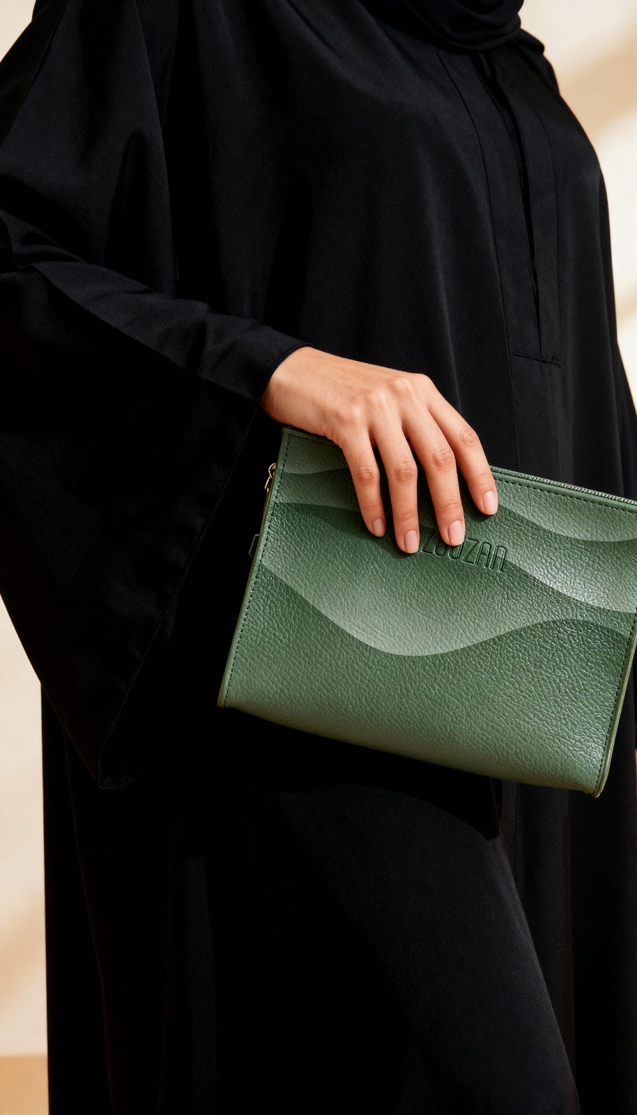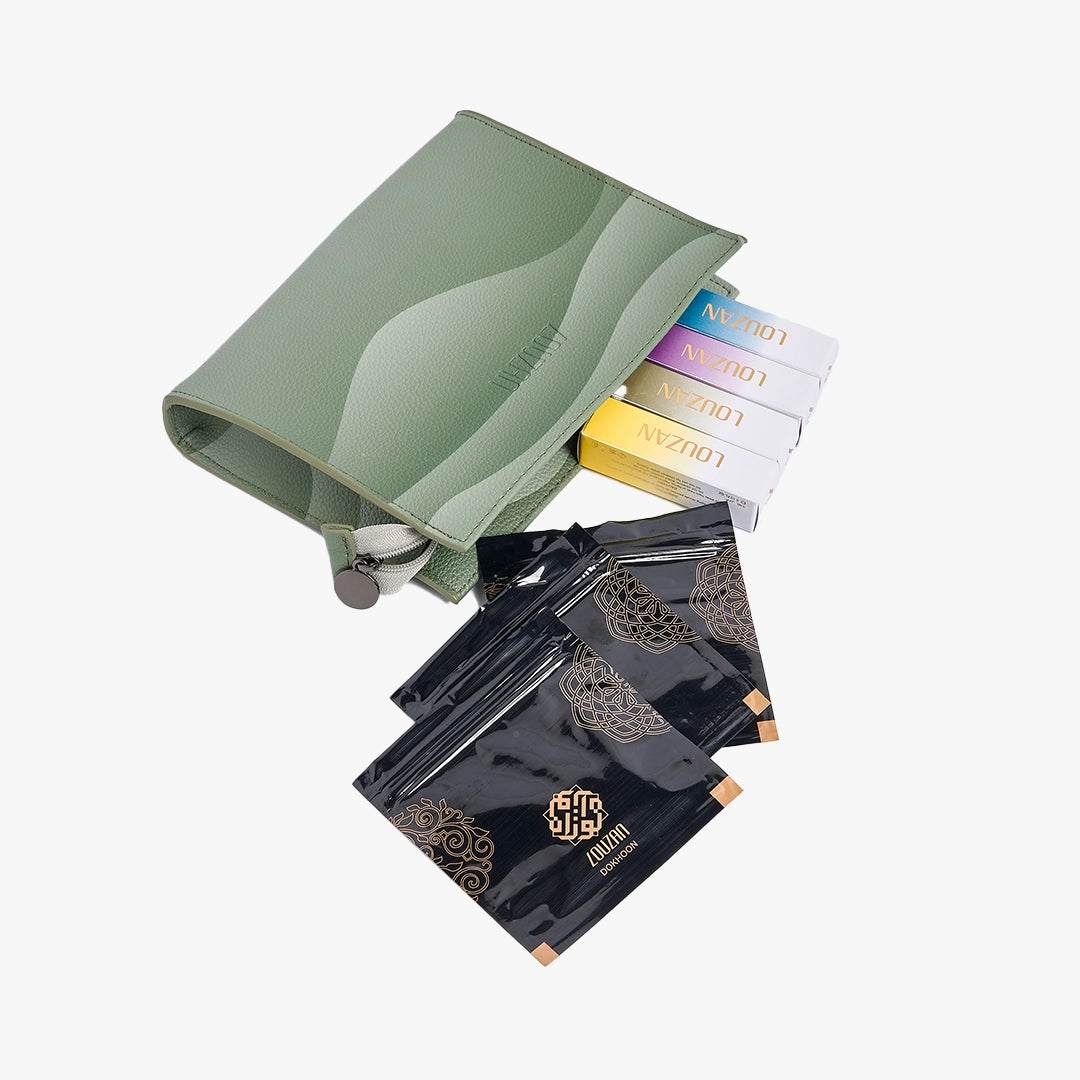 Introducing the Louzan Luxury Soft Case Pouch, crafted with premium textured material and designed to elevate your everyday essentials. This elegant green pouch features a smooth roll-up closure and subtle embossed Louzan branding, giving you a refined and modern accessory that complements your perfume oils, dukhoon sachets, and travel items.
