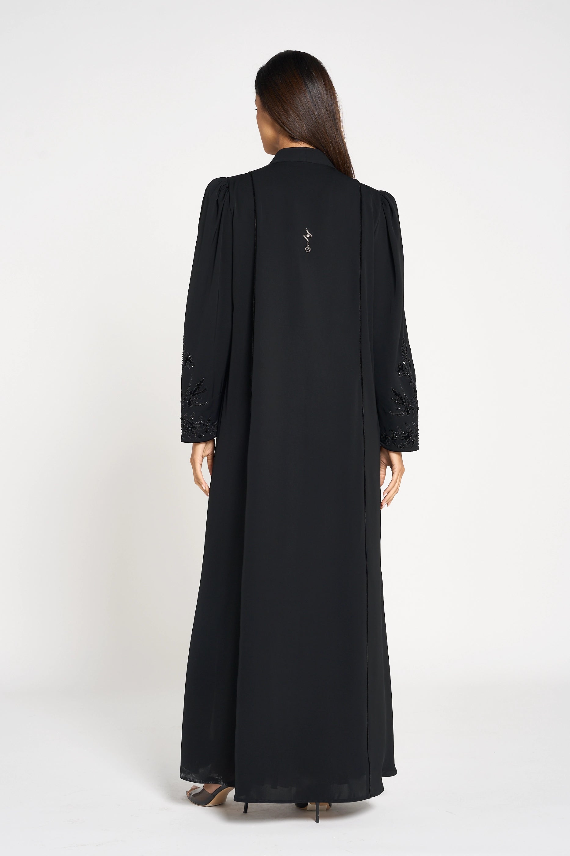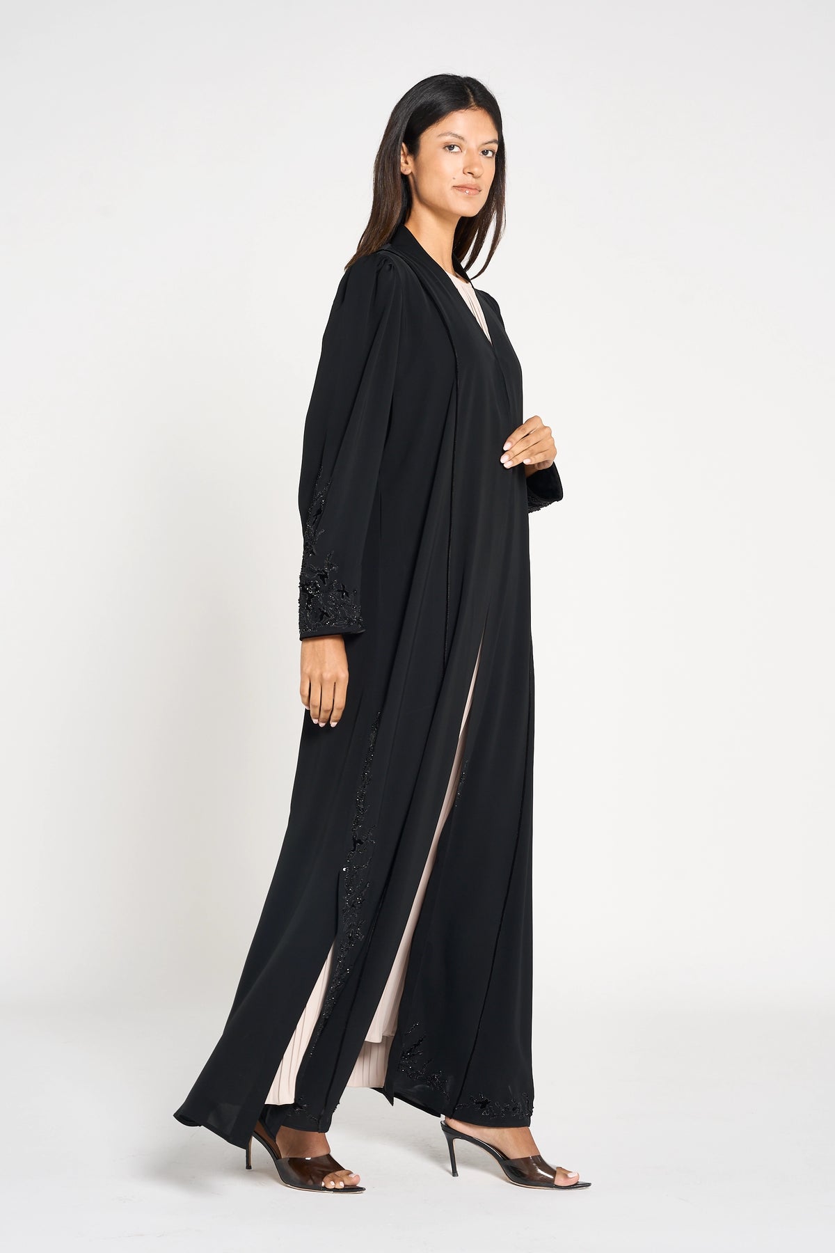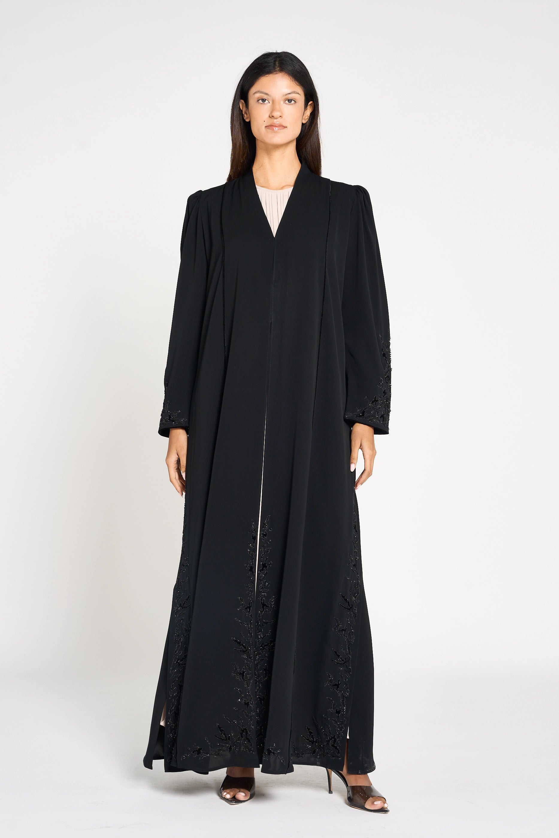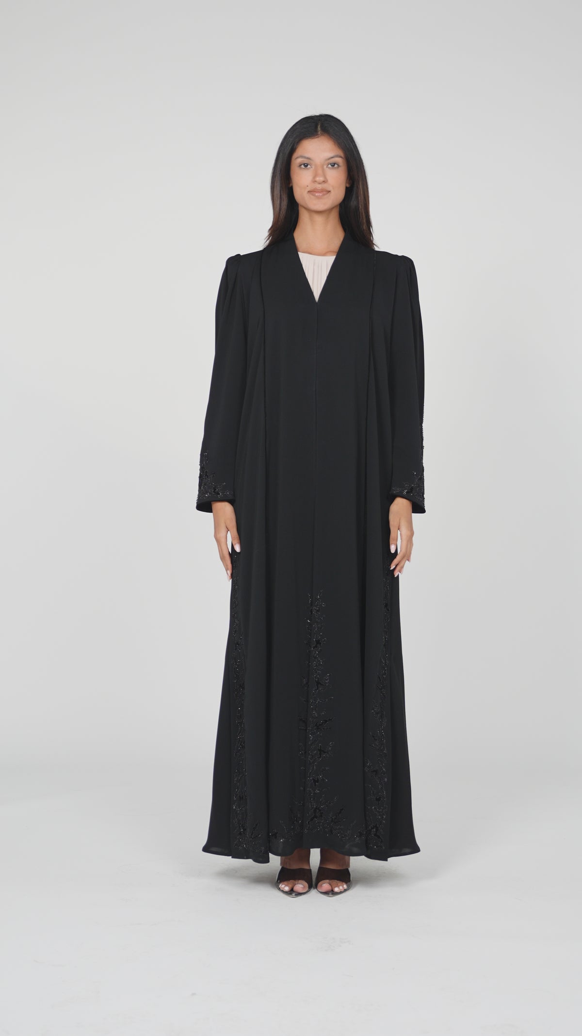 Discover timeless sophistication with this exquisite Louzan abaya, meticulously crafted from luxuriously soft nida fabric. The garment showcases an intricate laser-cut velvet floral design, elevated by hand-embroidered crystal and bead embellishments that catch light beautifully. Each detail reflects masterful craftsmanship and refined aesthetic sensibility, making this piece an investment in enduring elegance. Perfect for those who appreciate the intersection of traditional artistry and contemporary style, this abaya delivers understated luxury with every wear.