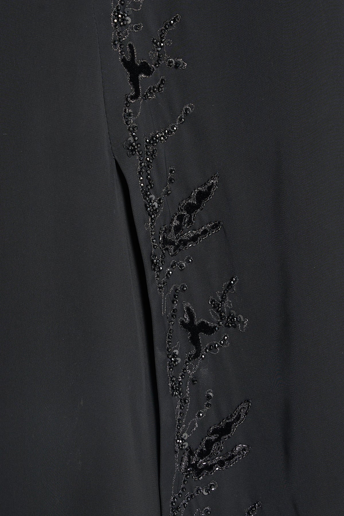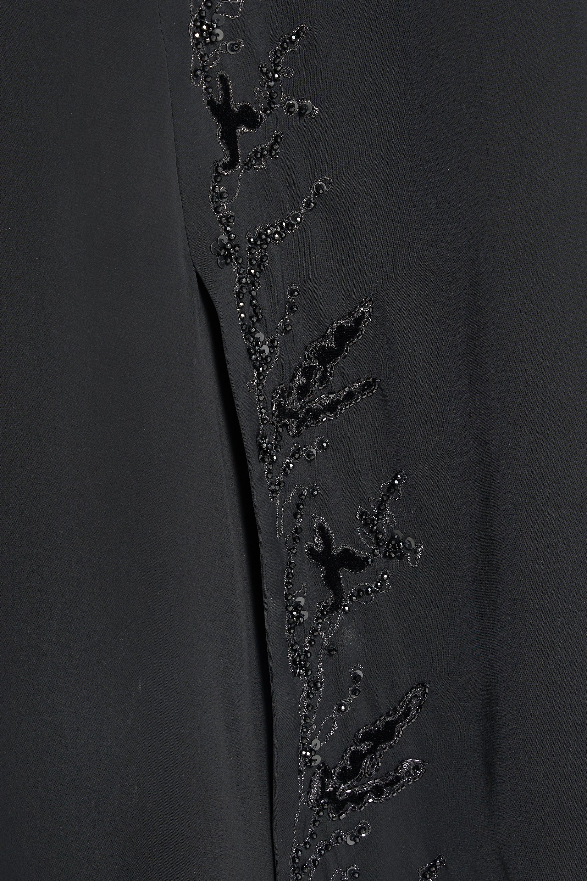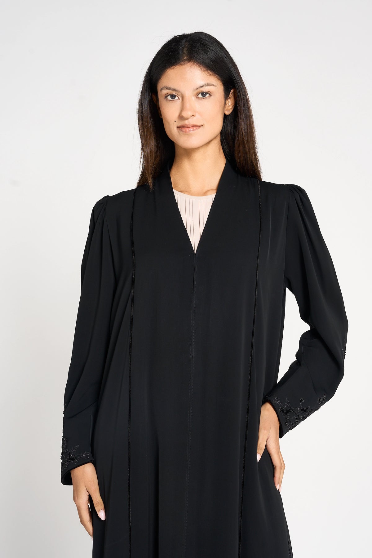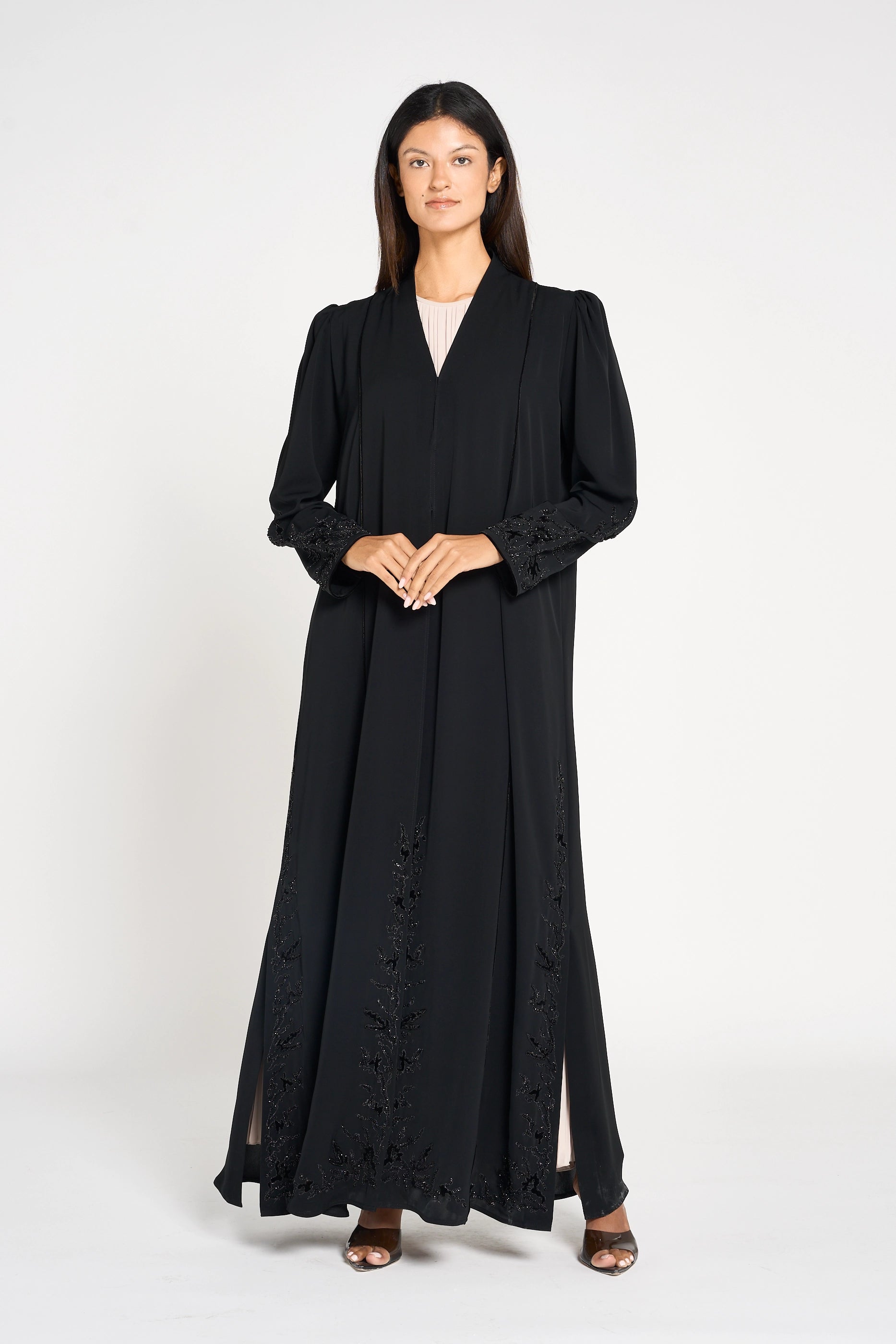 Discover timeless sophistication with this exquisite Louzan abaya, meticulously crafted from luxuriously soft nida fabric. The garment showcases an intricate laser-cut velvet floral design, elevated by hand-embroidered crystal and bead embellishments that catch light beautifully. Each detail reflects masterful craftsmanship and refined aesthetic sensibility, making this piece an investment in enduring elegance. Perfect for those who appreciate the intersection of traditional artistry and contemporary style, this abaya delivers understated luxury with every wear.