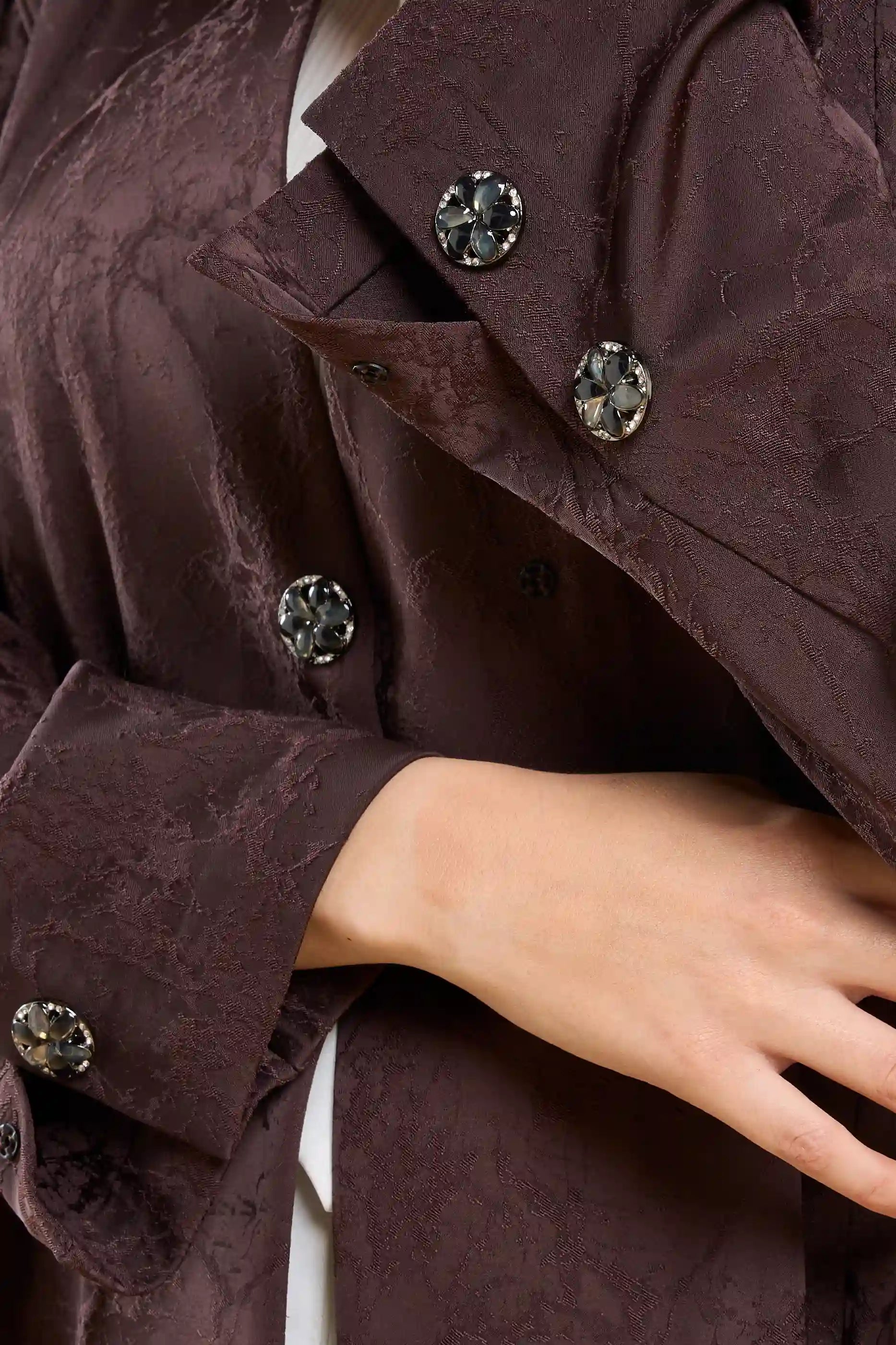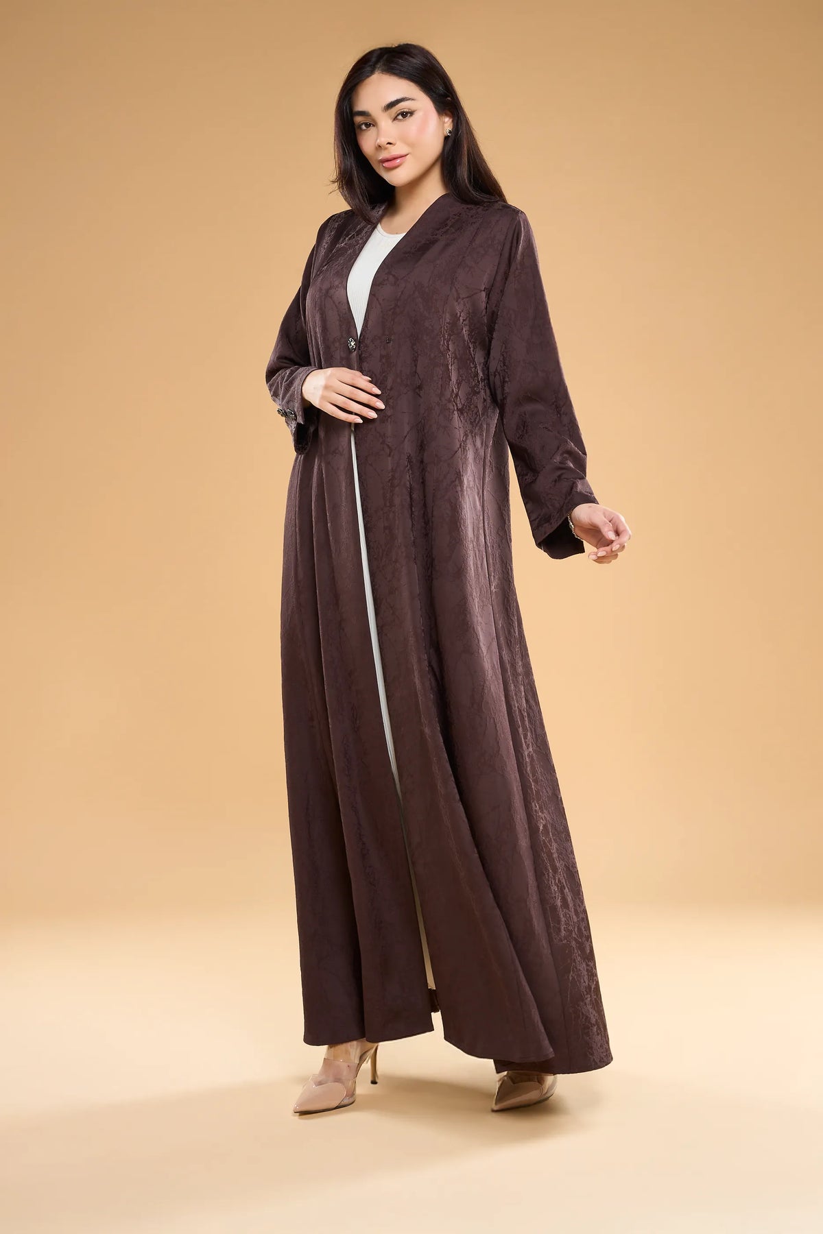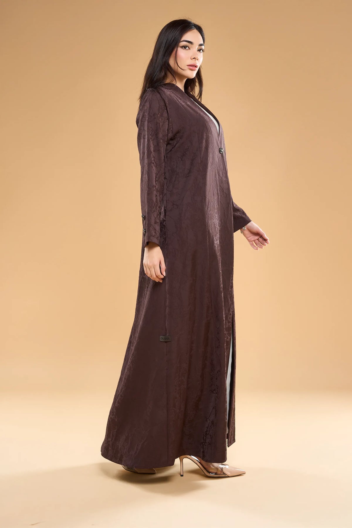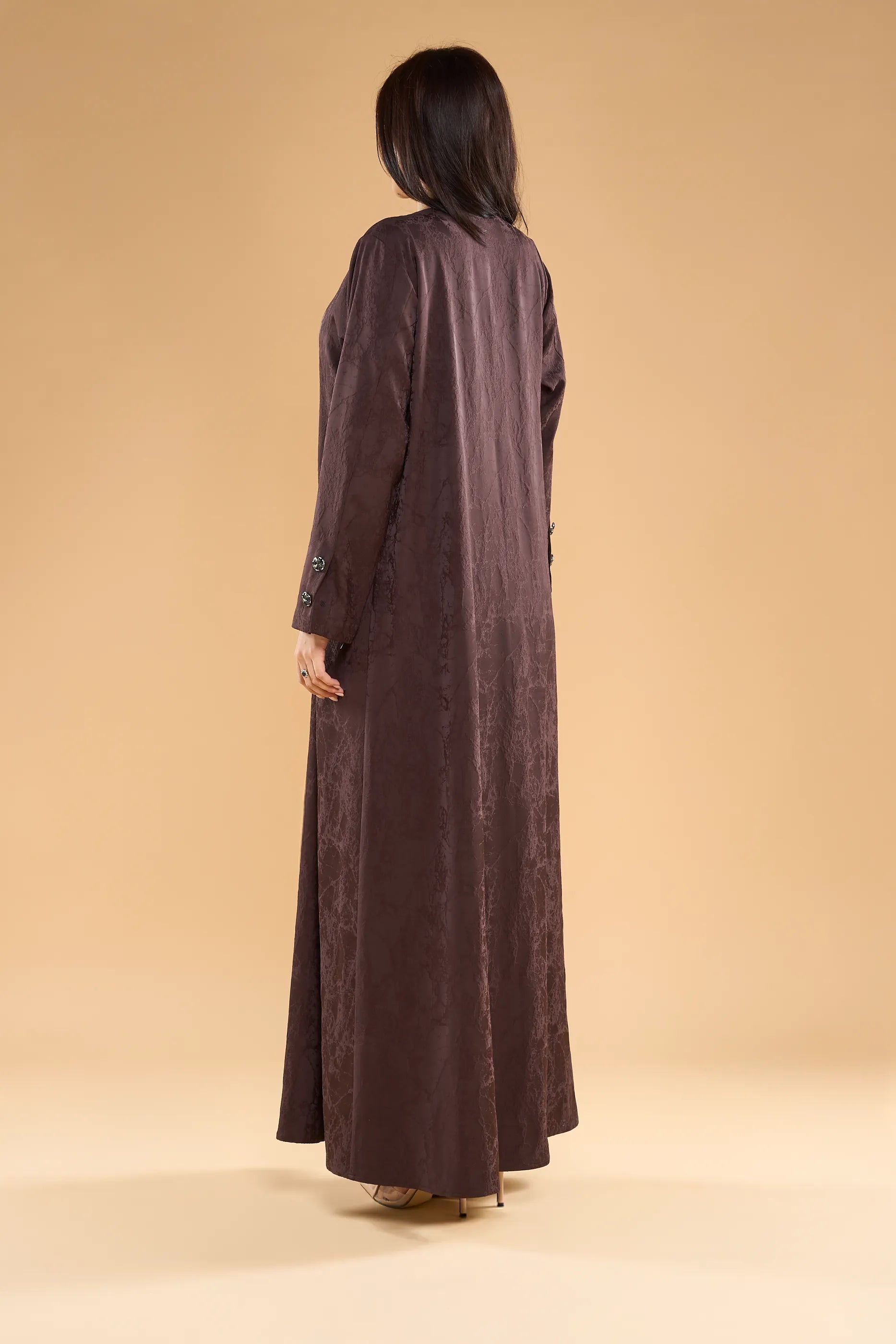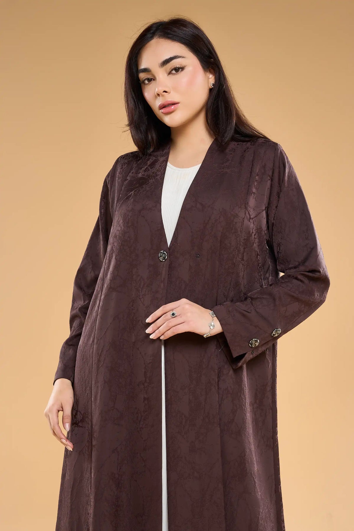 Ousha abaya crafted in textured jacquard, detailed with soft curved neckline accents and refined button elements. A comfortable yet polished design ideal for effortless everyday wear.