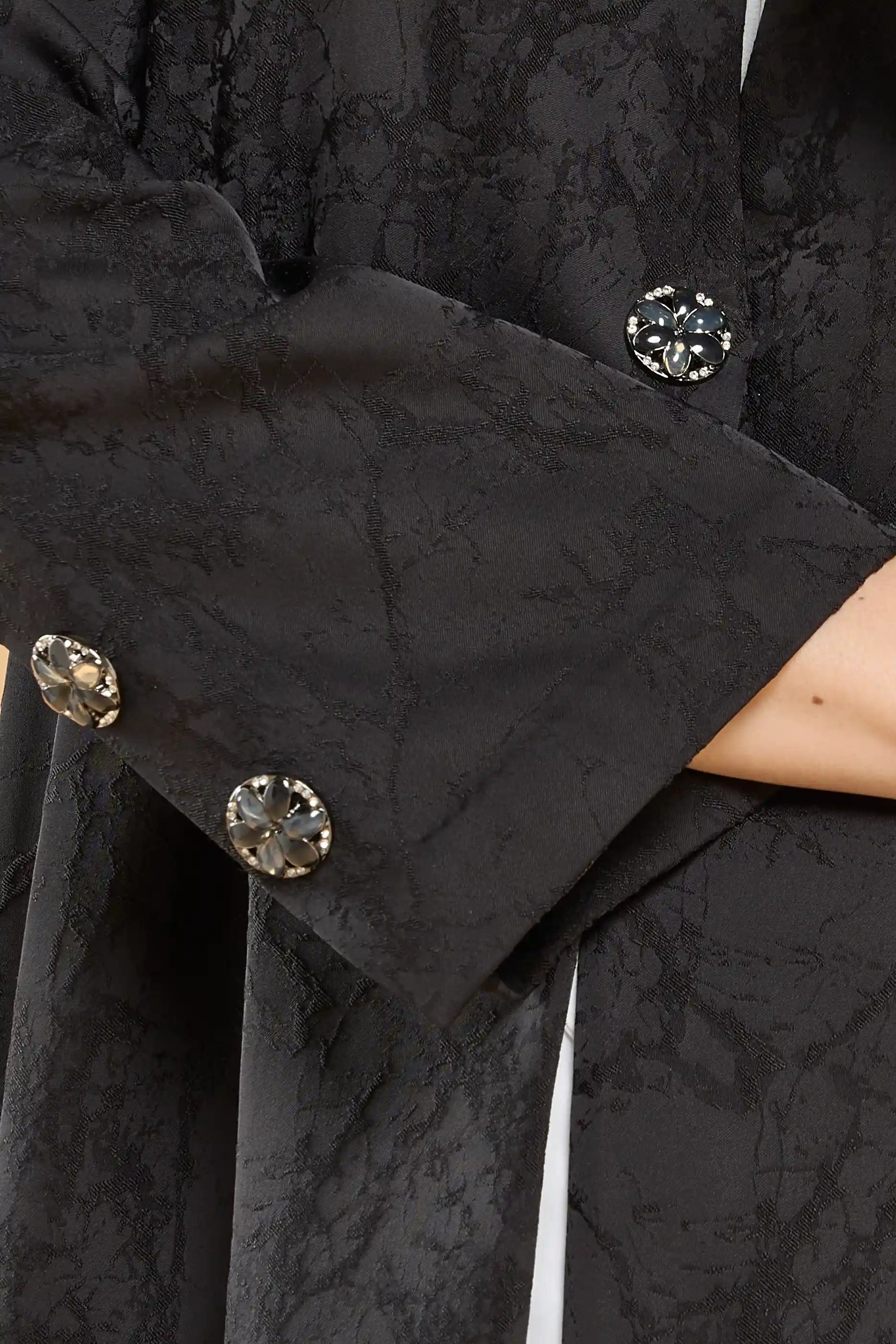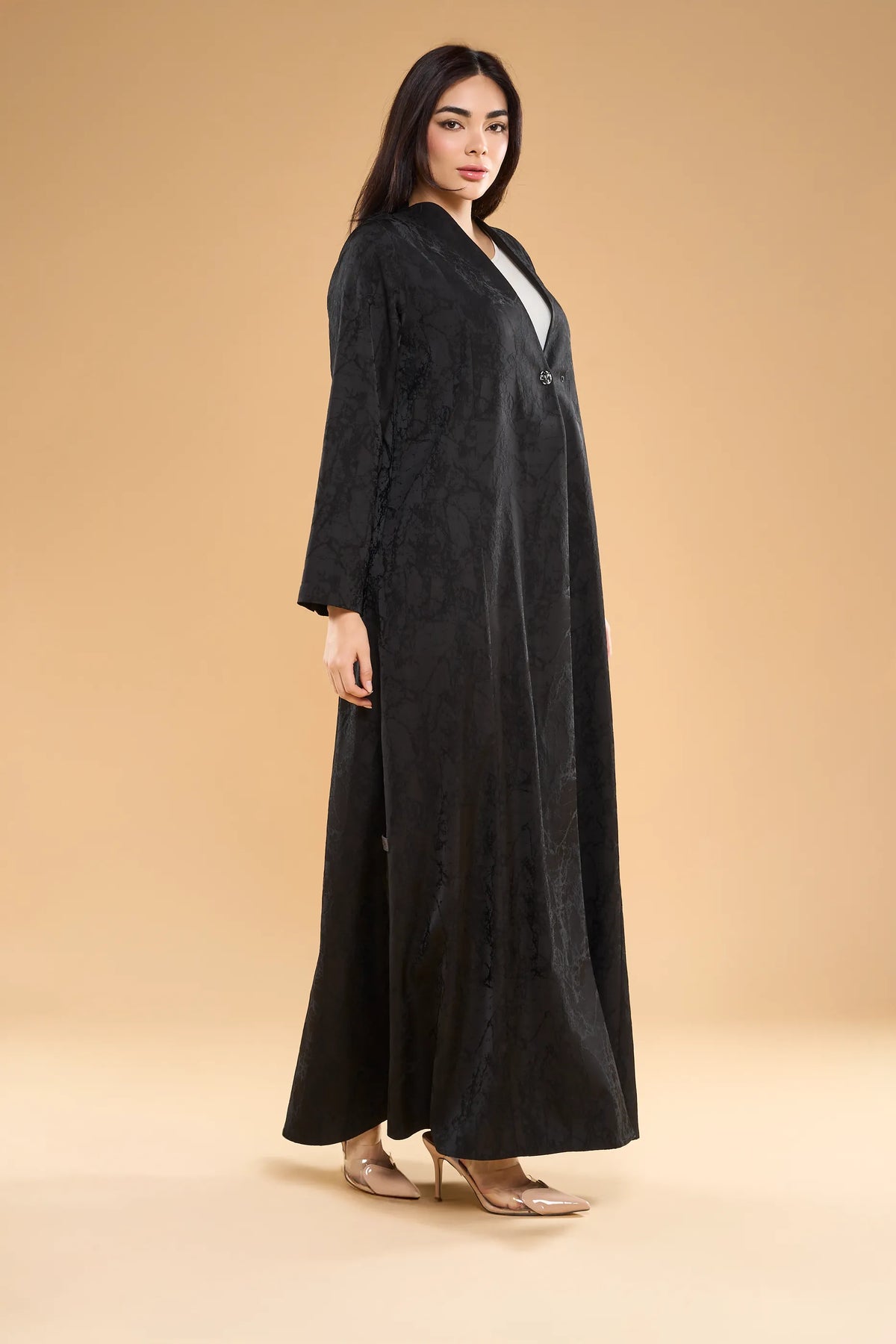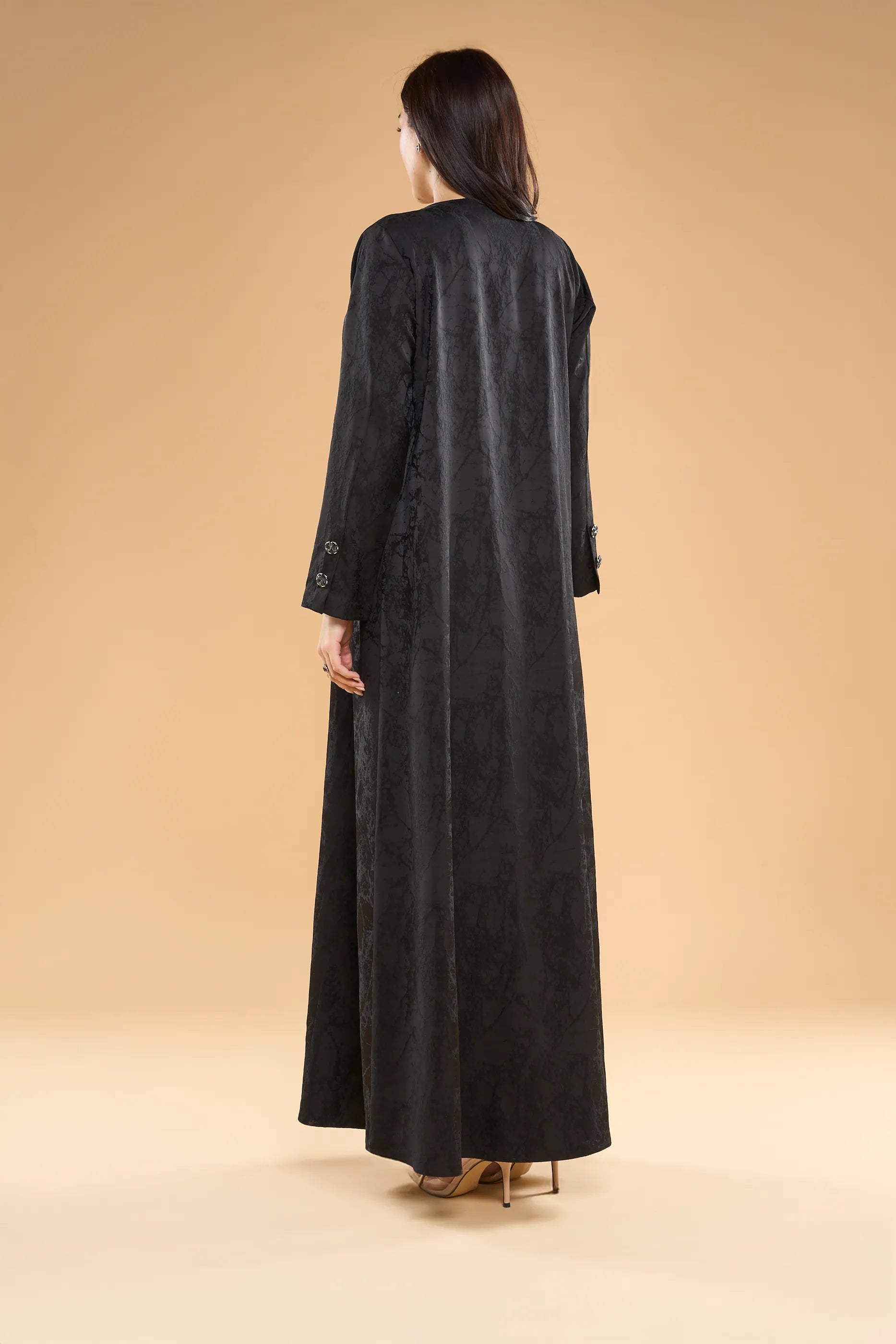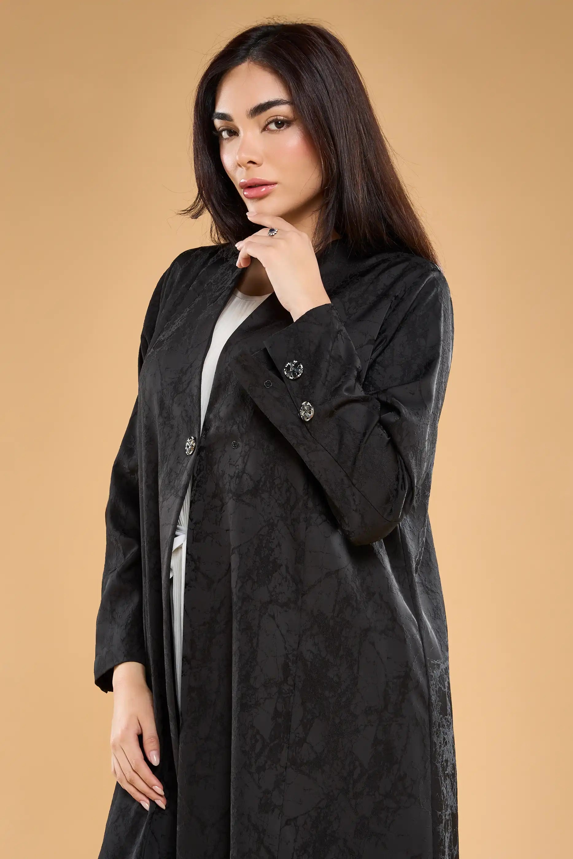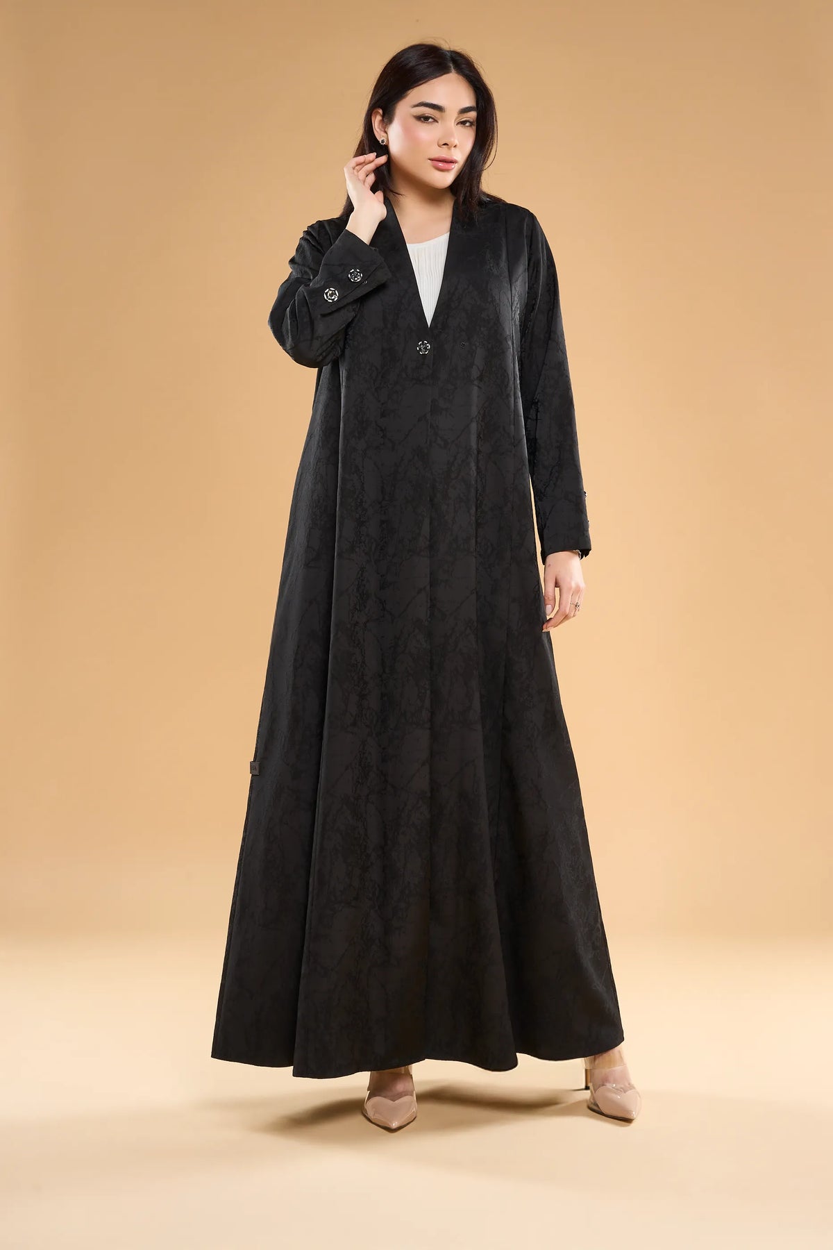 Ousha abaya in textured jacquard, finished with curved neckline detailing and subtle button accents, offering a relaxed silhouette with modern sophistication.